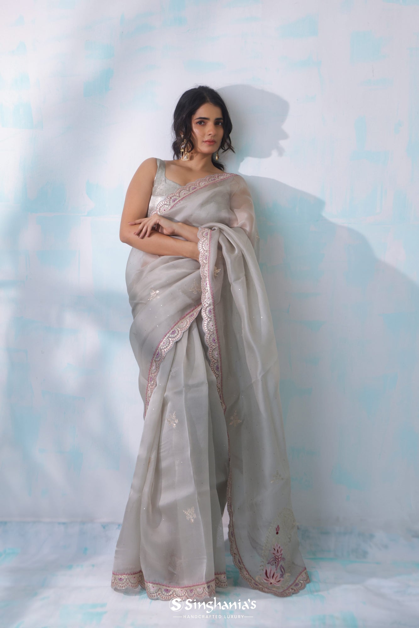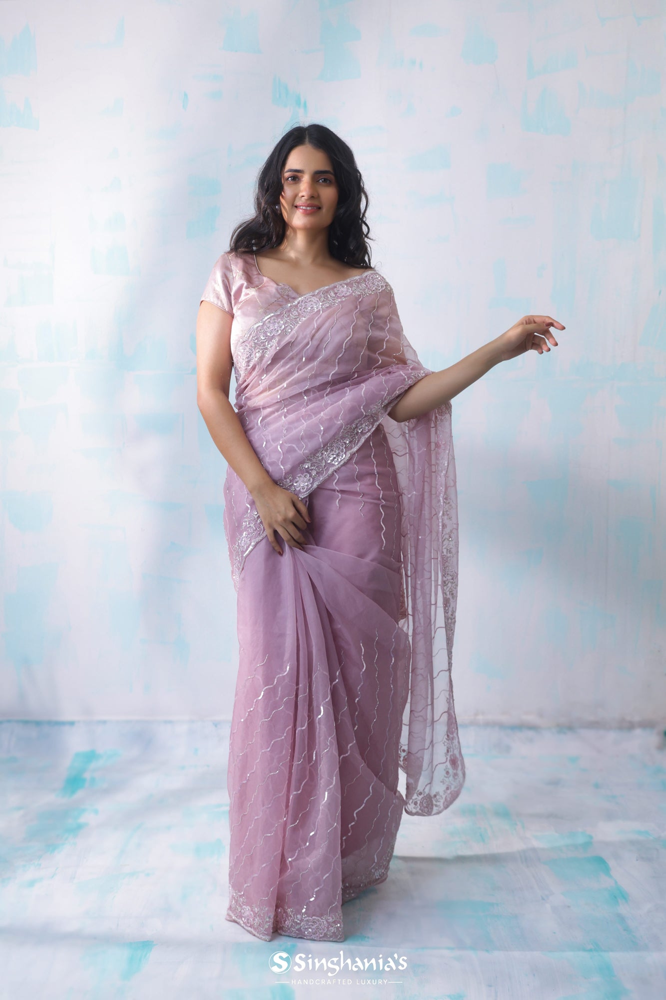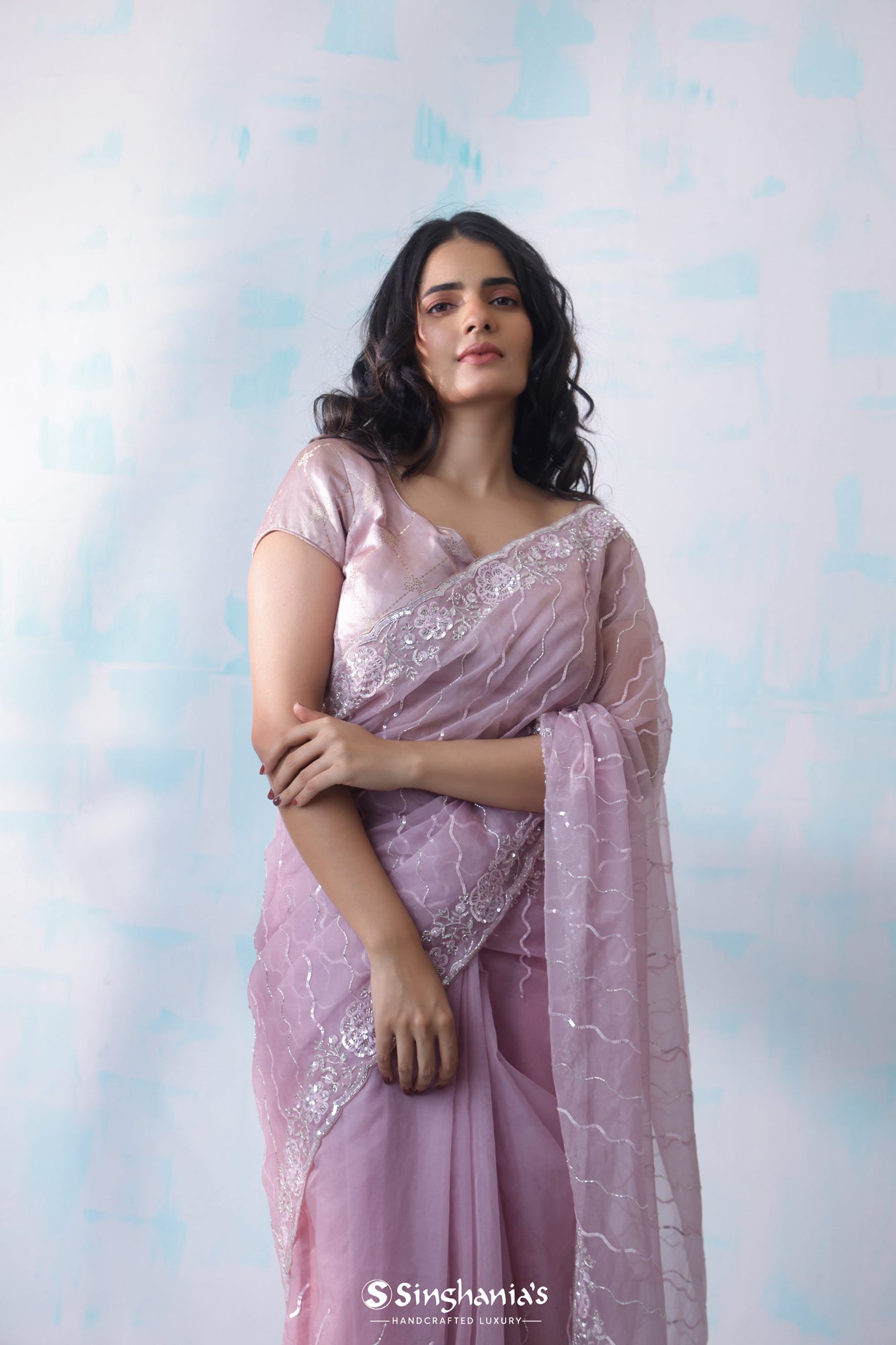 Pale Lavender Tissue Organza Saree With Hand Embroidery