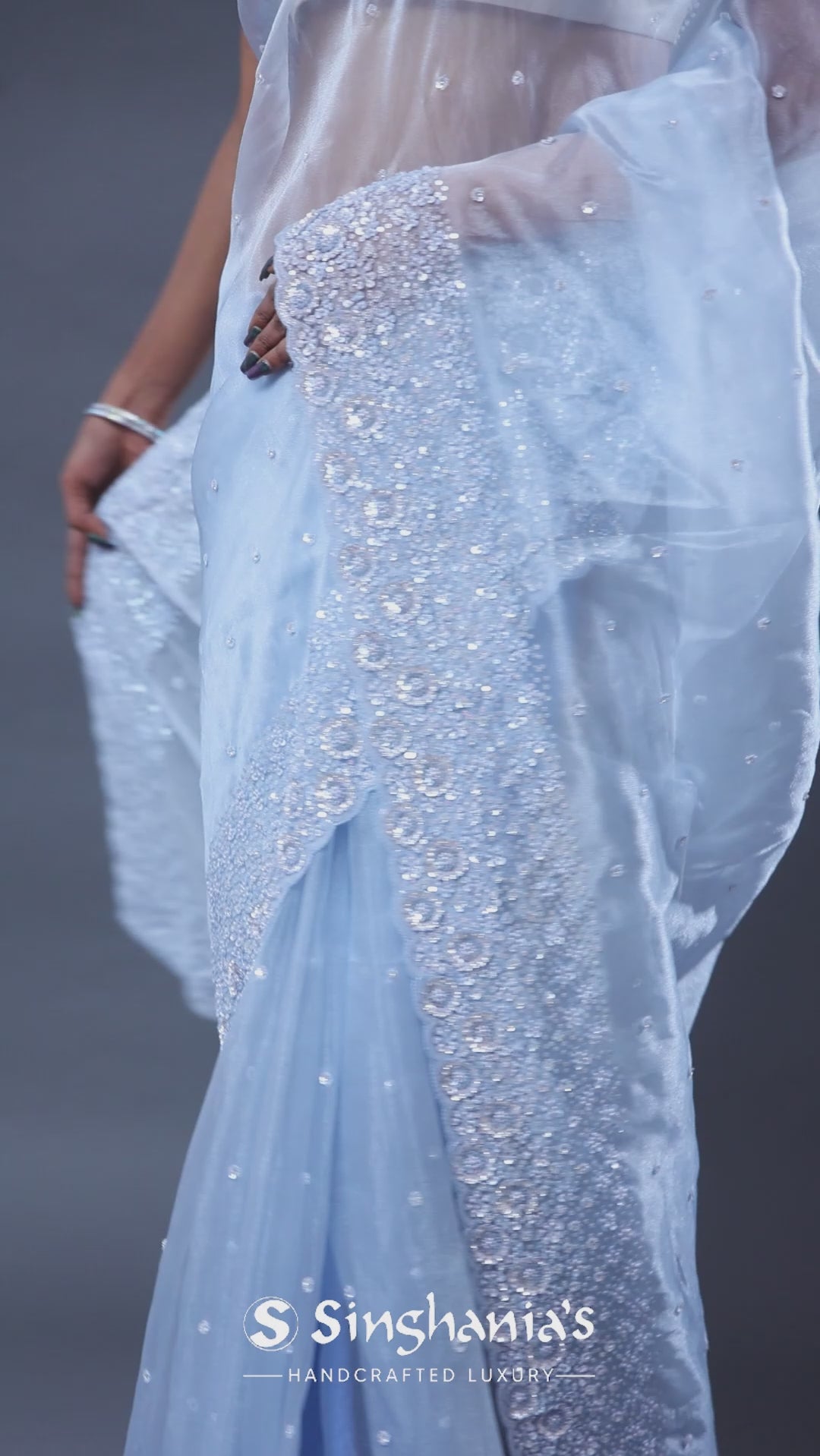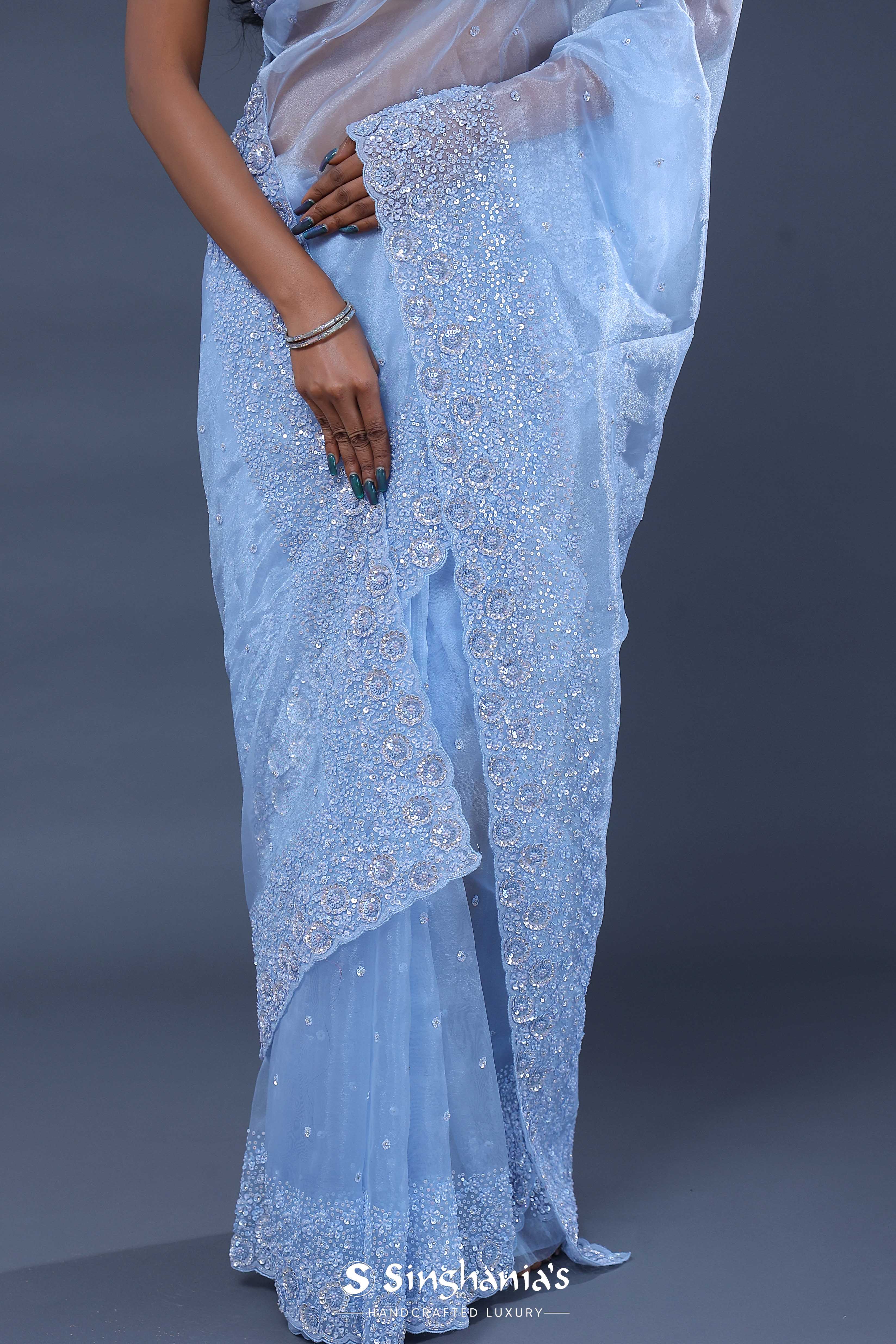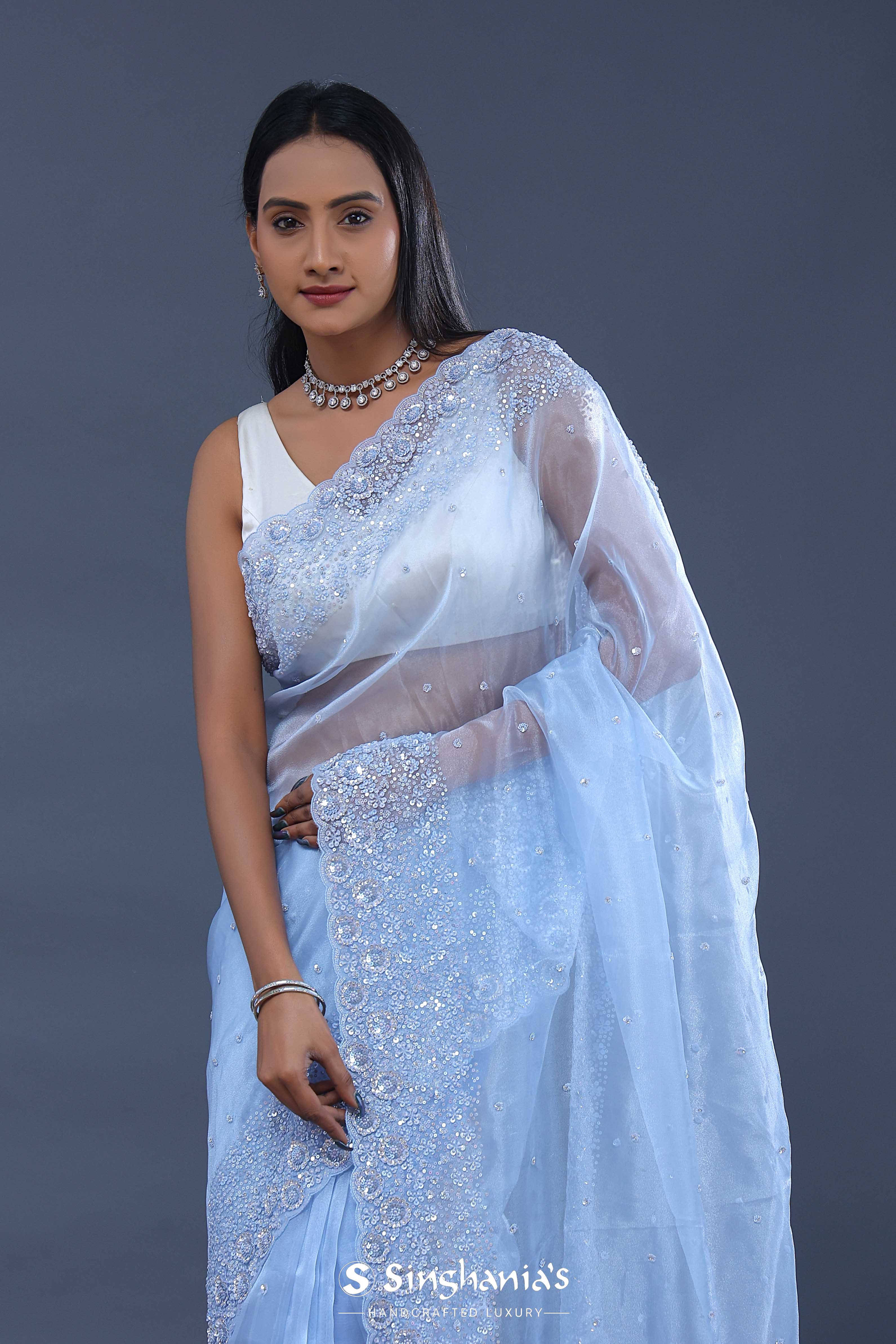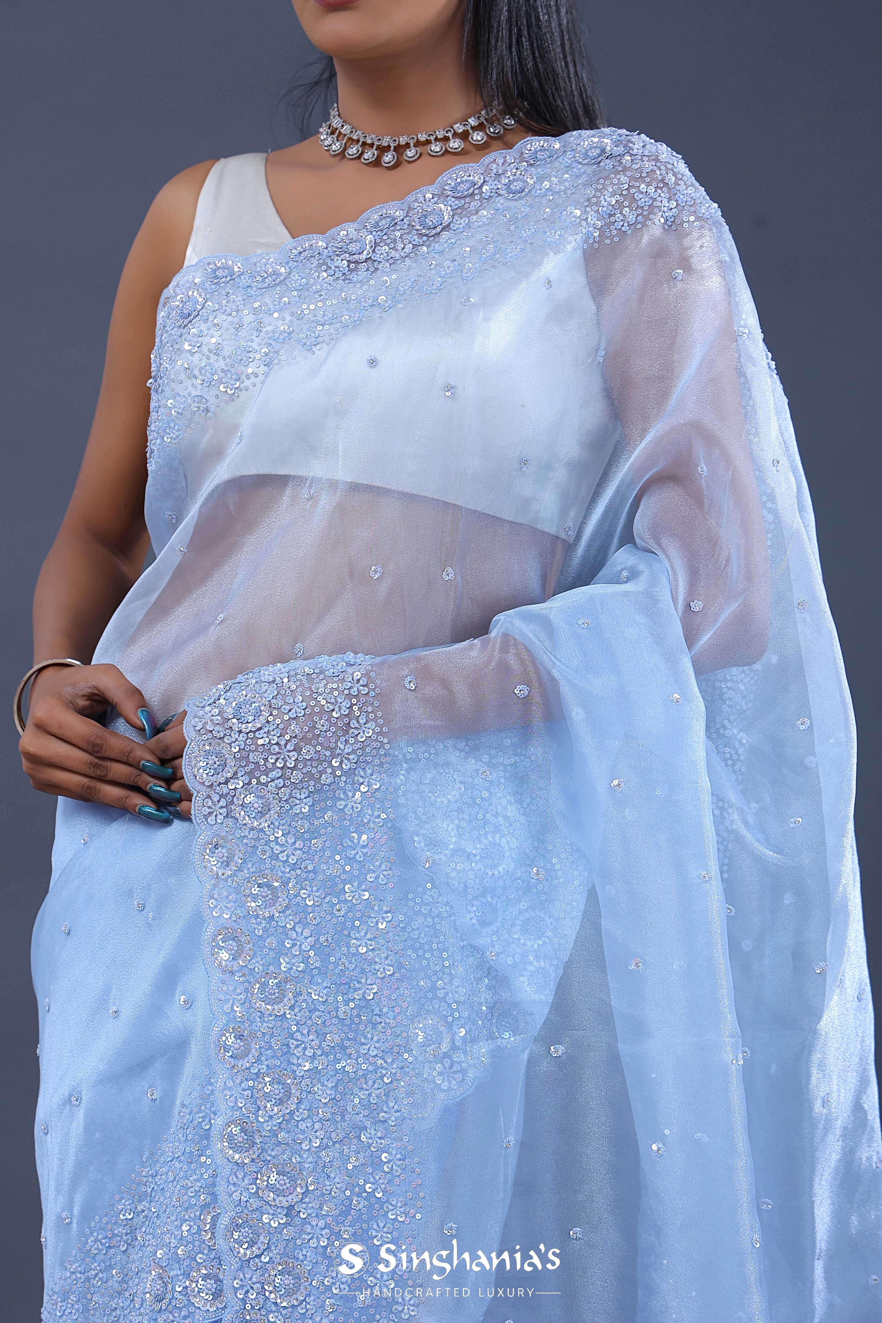 This lightweight and flowy Baby blue tissue organza saree with crinkled texture nature and comfortable to wear adorned with scallop border and sequins buttis's spread all across the body making it emit claasy and elegent look