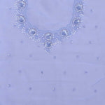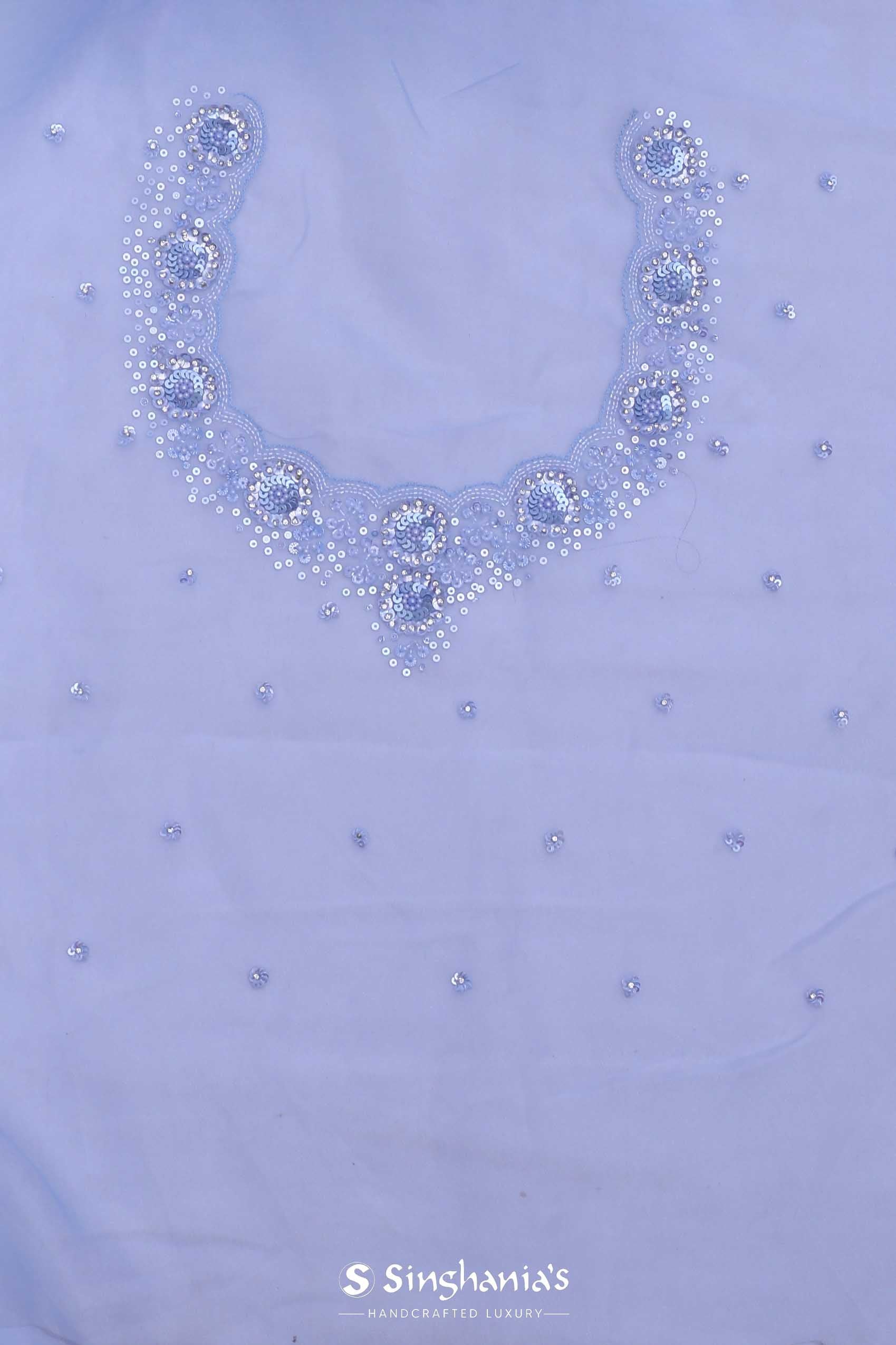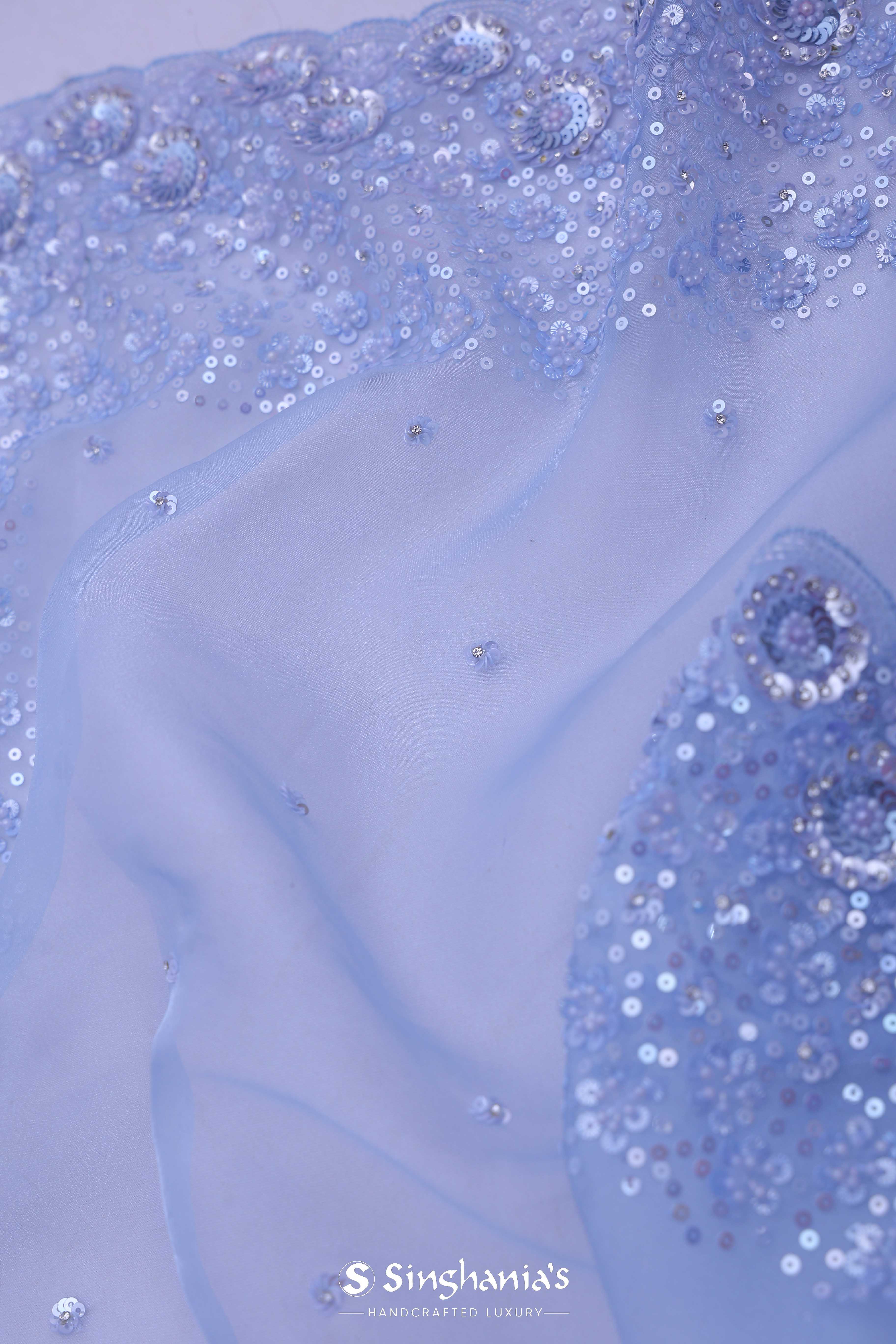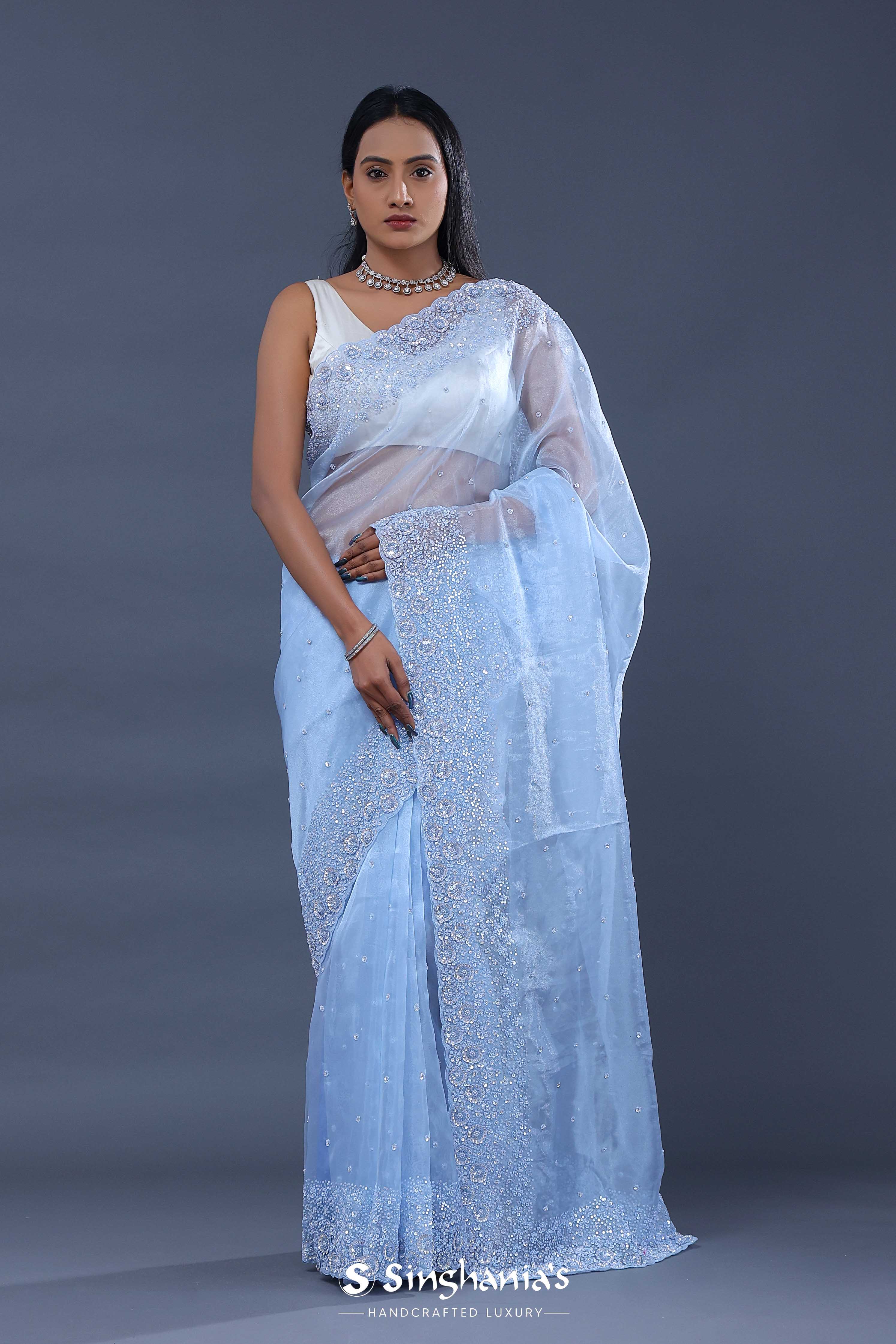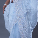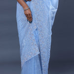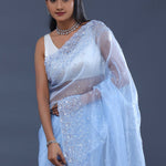 This lightweight and flowy Baby blue tissue organza saree with crinkled texture nature and comfortable to wear adorned with scallop border and sequins buttis's spread all across the body making it emit claasy and elegent look