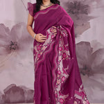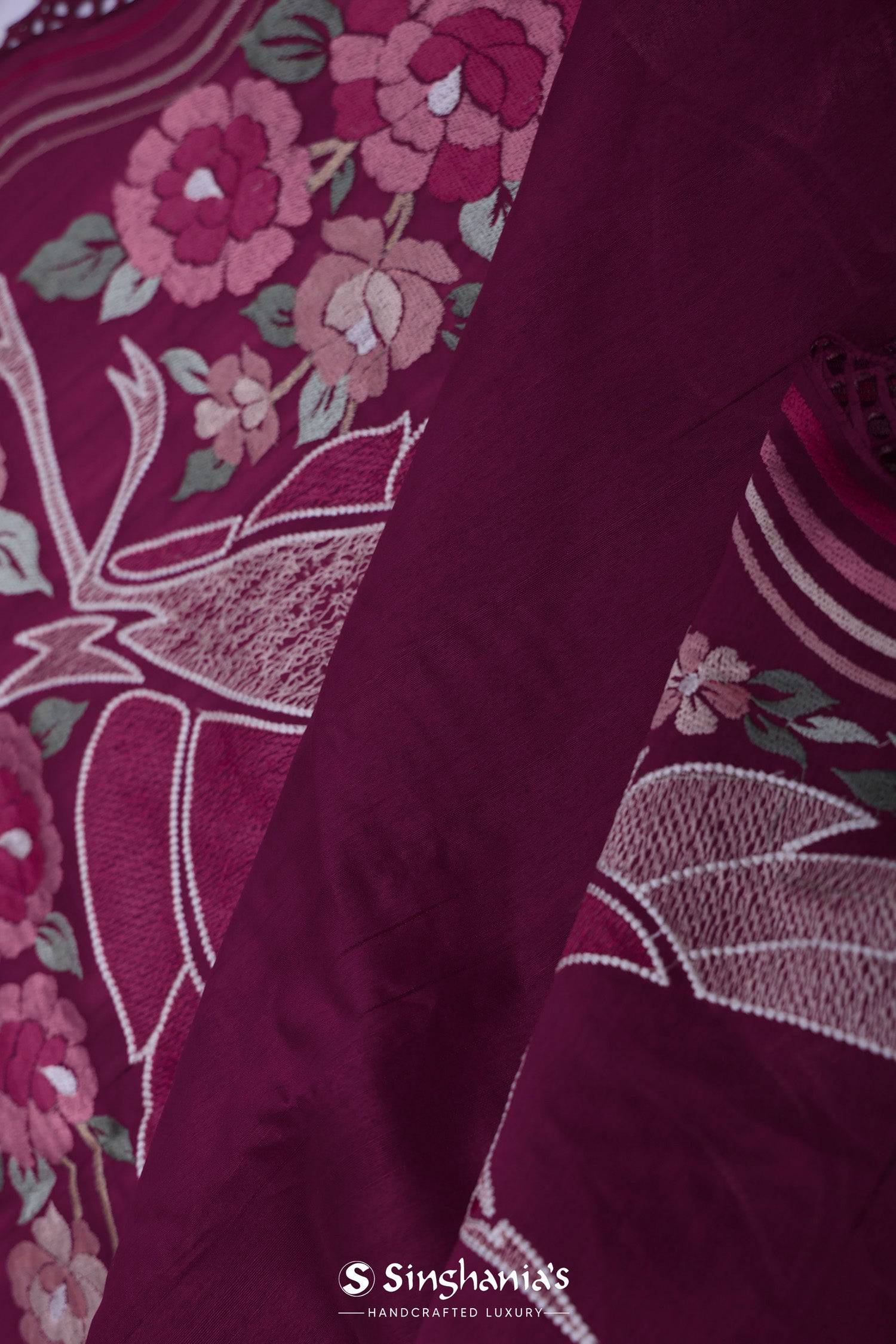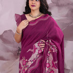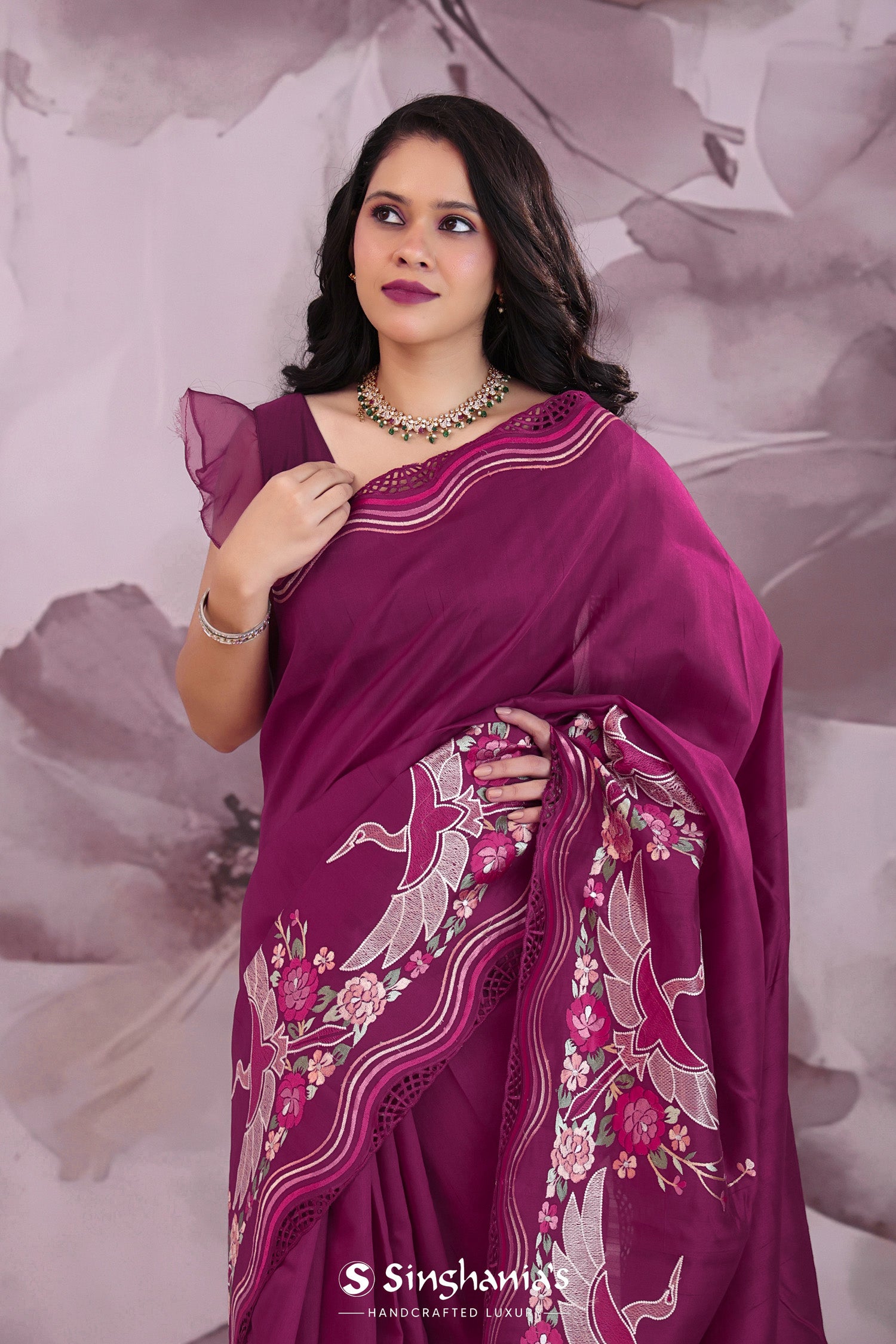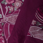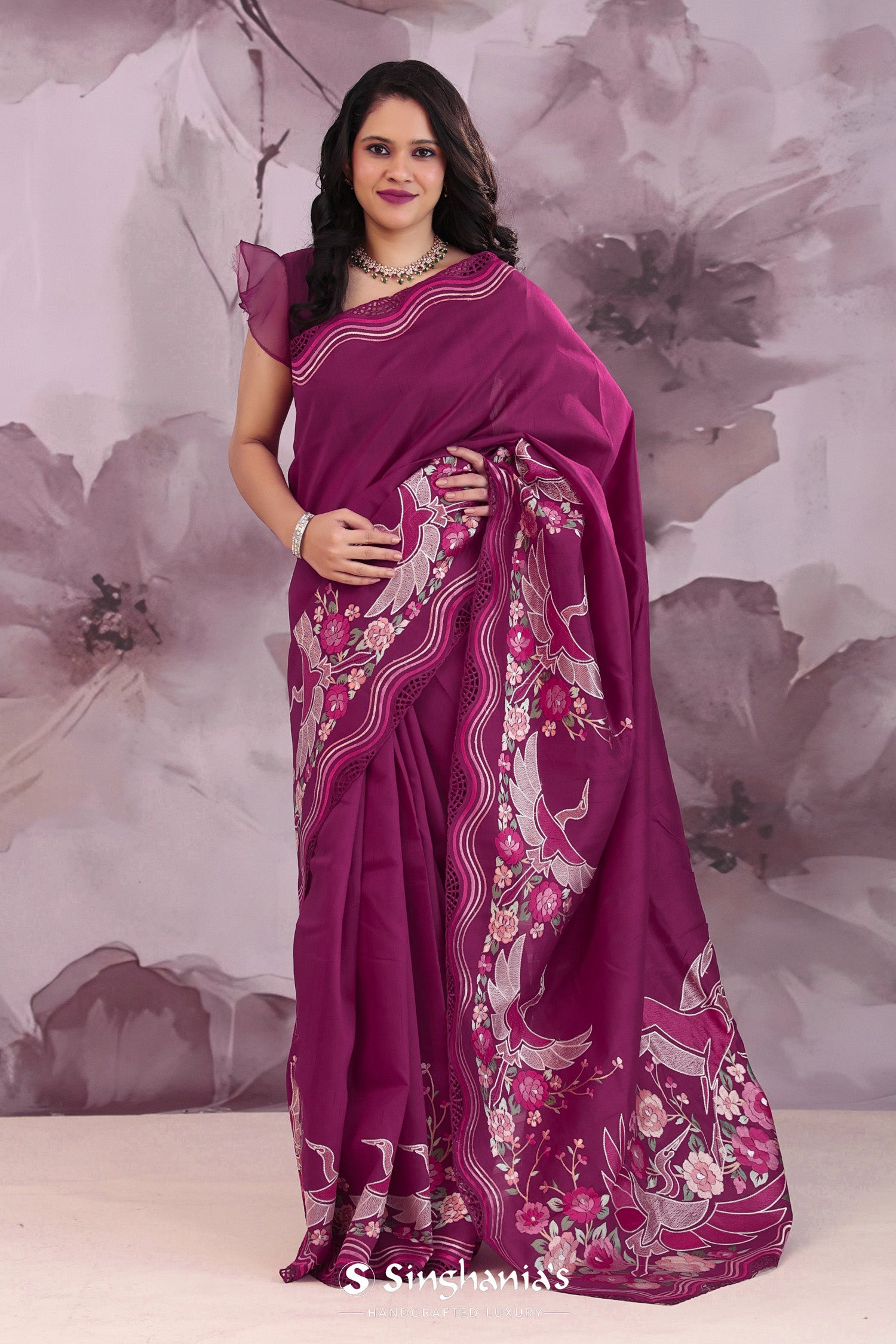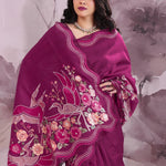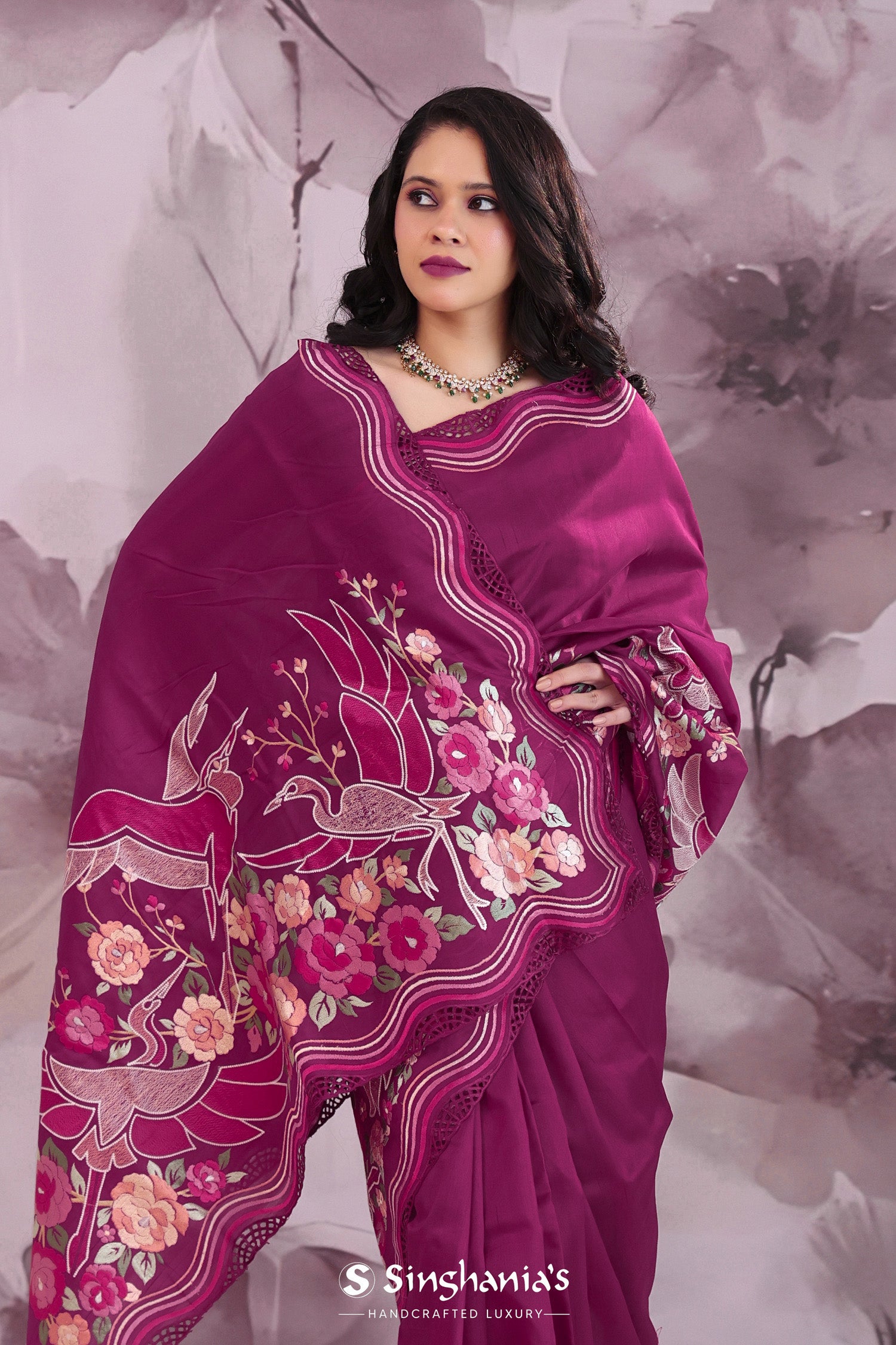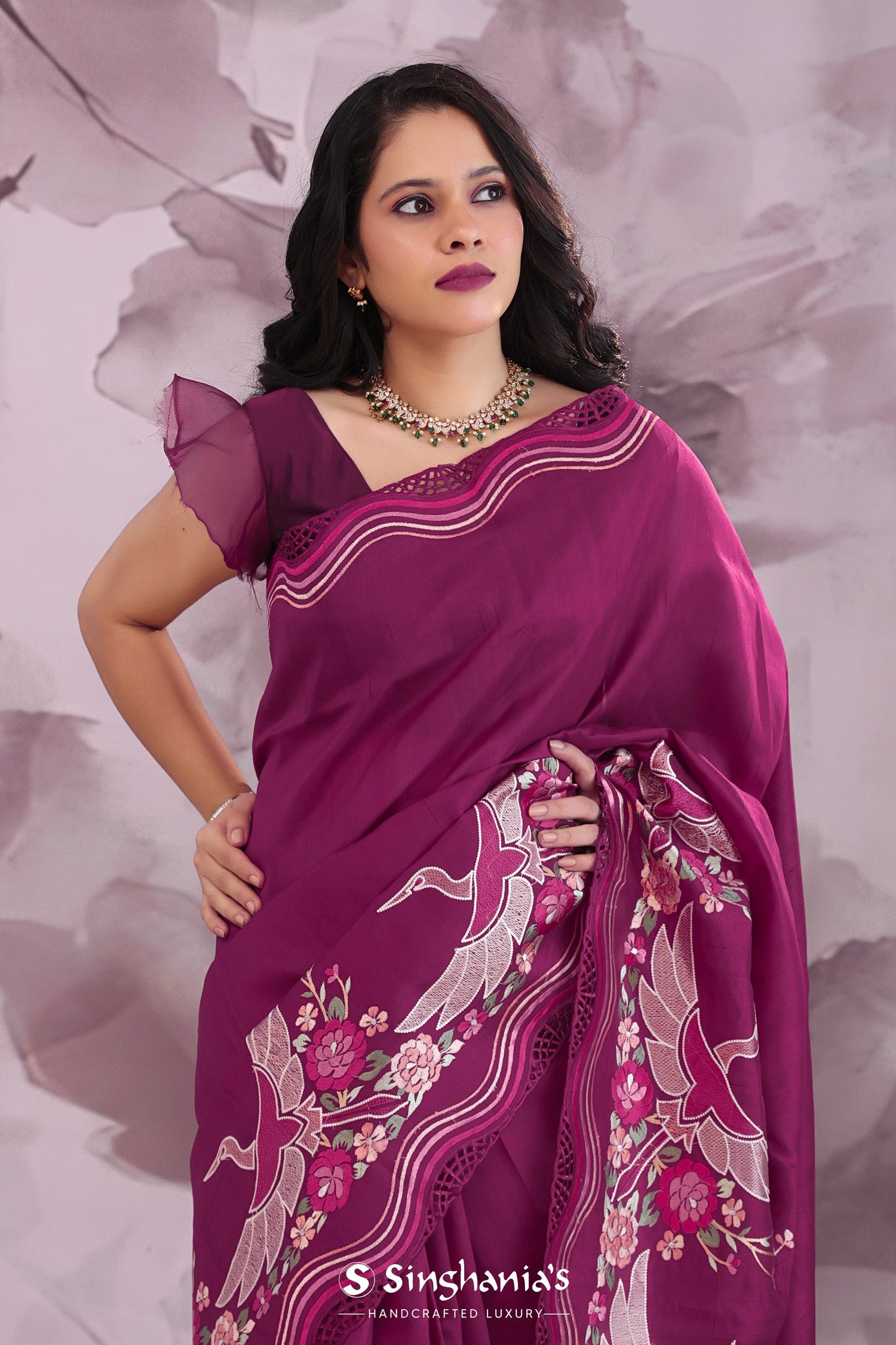 Barossa purple tussar saree presenting a wave pattern in contrast colors all over the border along with avian and floral embroidery embellished which is adding the charm to overall look.
