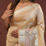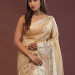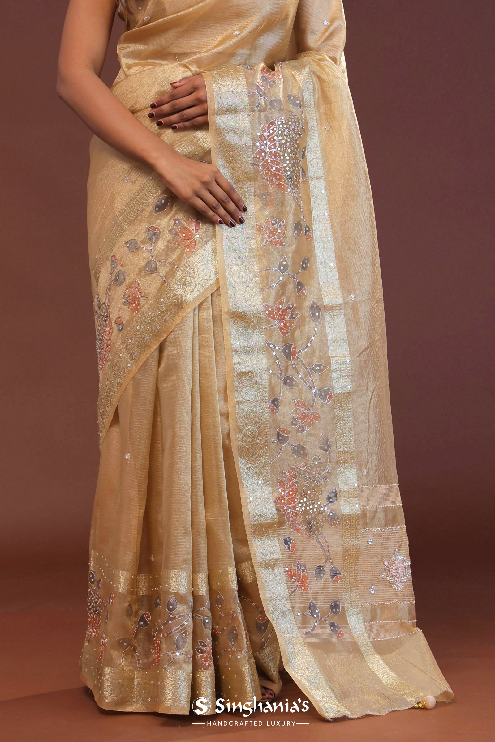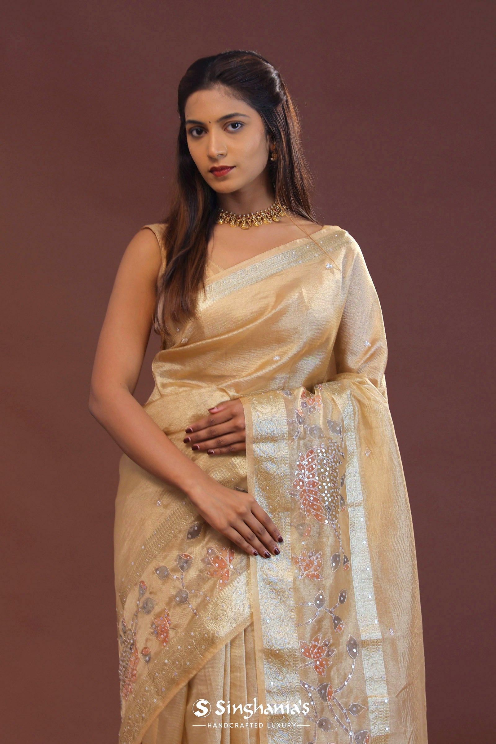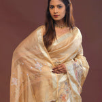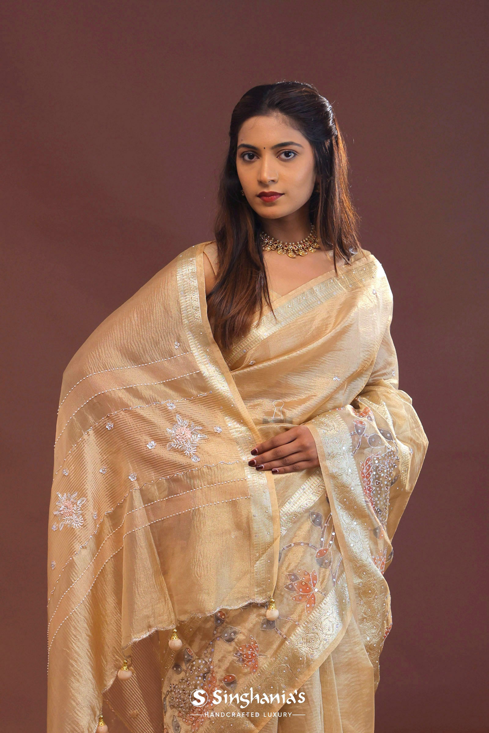 Beige Crushed Tissue Organza Embroidery Saree With Gold Zari Border