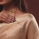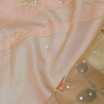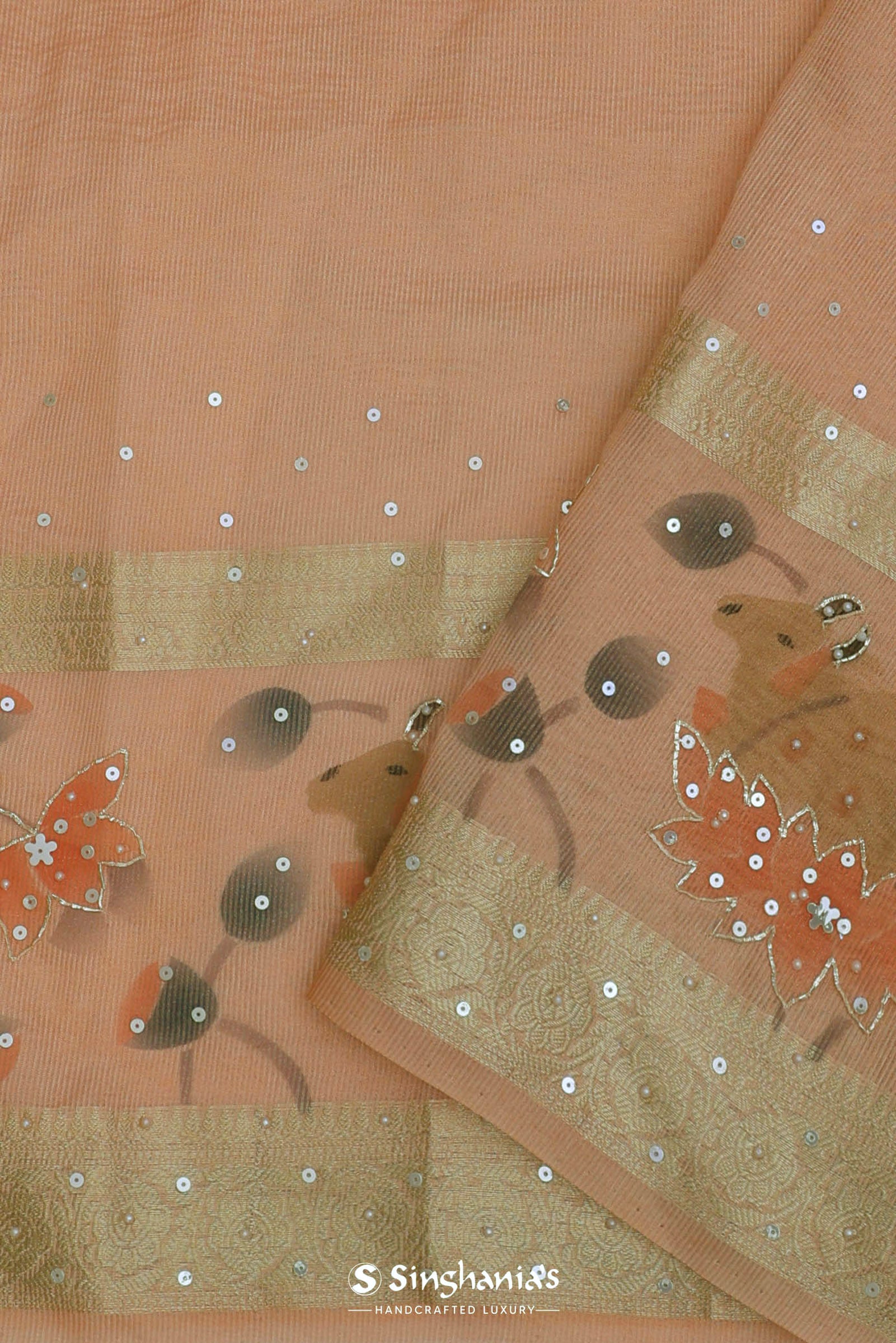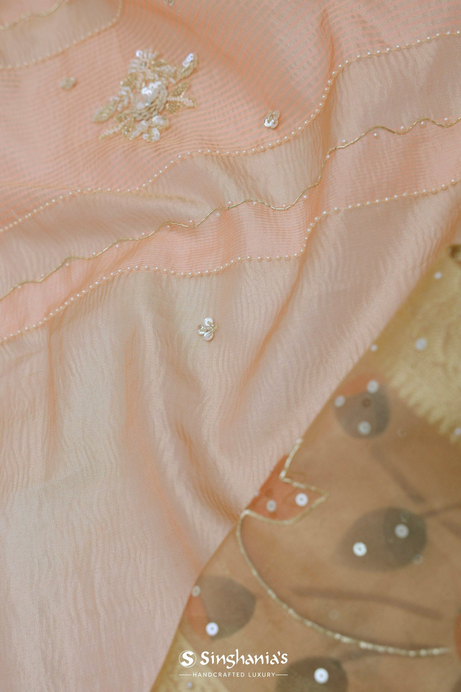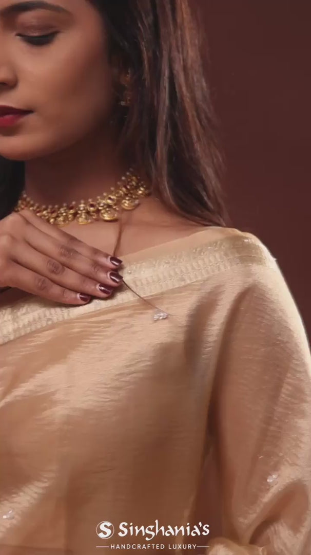 The fabric of this beautiful beige crushed tissue organza saree is dotted with beautiful sequin buttis. An gorgeous gold embroidered border completes the saree, lending it a sense of sophistication and richness.
