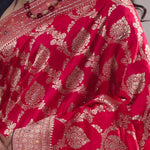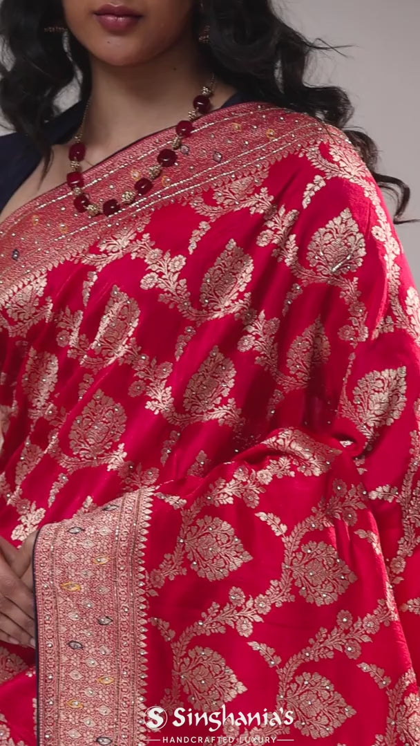 A richly cardinals red saree with a silk base, which features gold zari woven floral jaal pattern on the body and border. Accentuated with multi-colour thread, glass beads and stone embroidery, that adds to the whole look. Suitable for festive wear, and wedding parties.