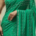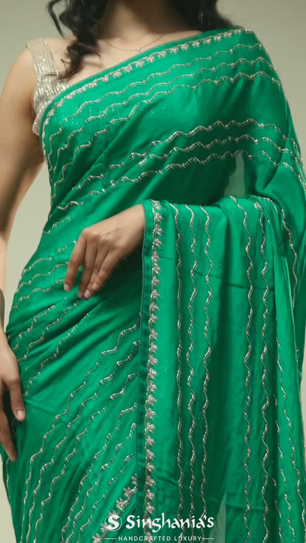A richly castleton green saree with a silk base, which features all-over stripe embroidered pattern. Added with intricately floral embroidered border, crafted with sequins, stones and glass beads. Suitable for festive wear, and wedding parties.