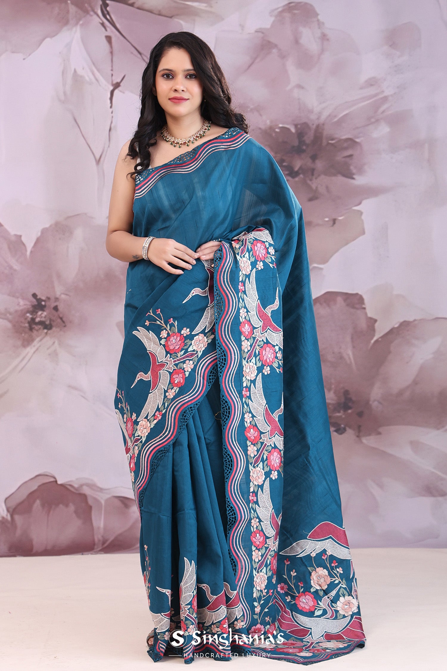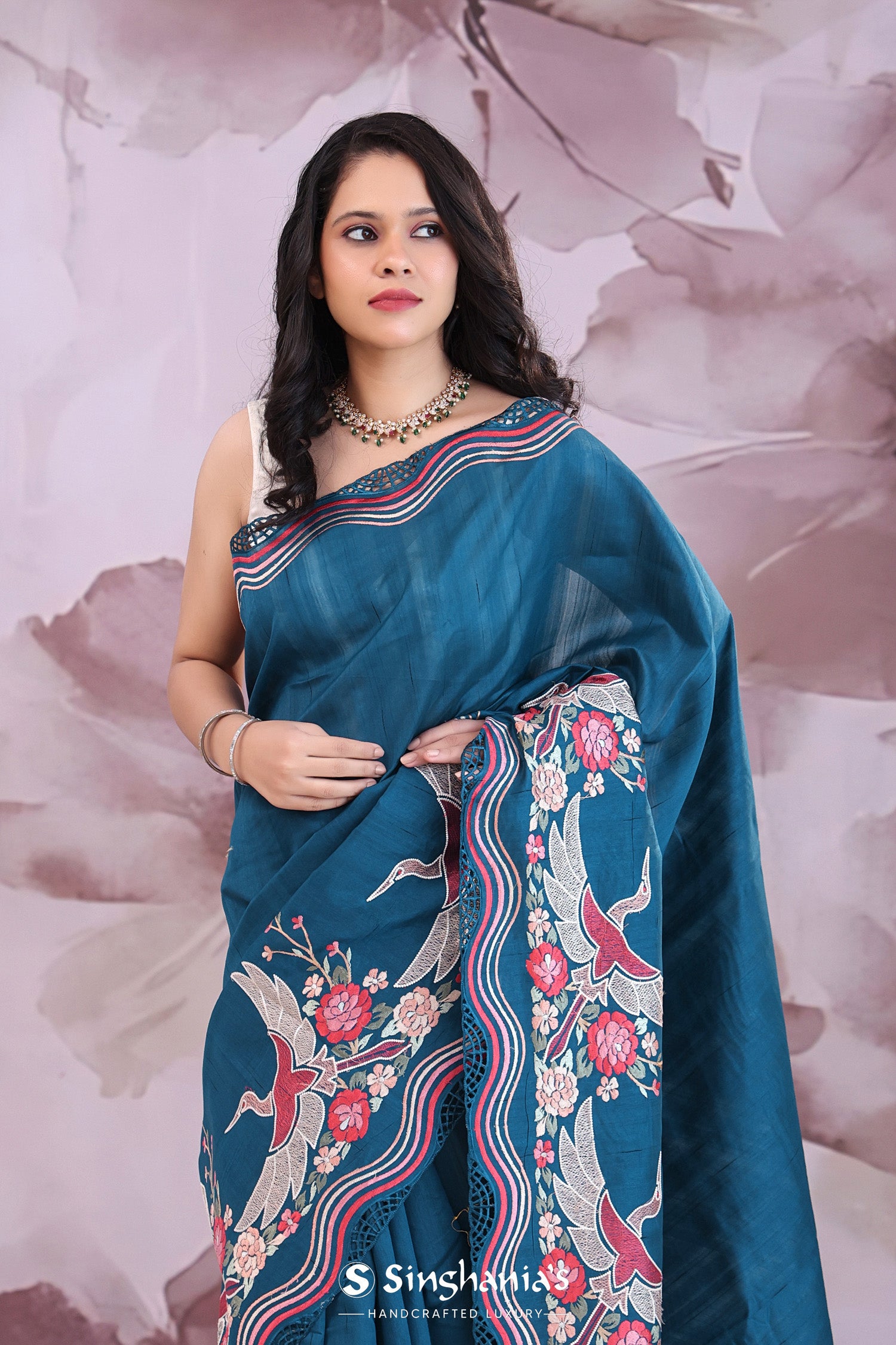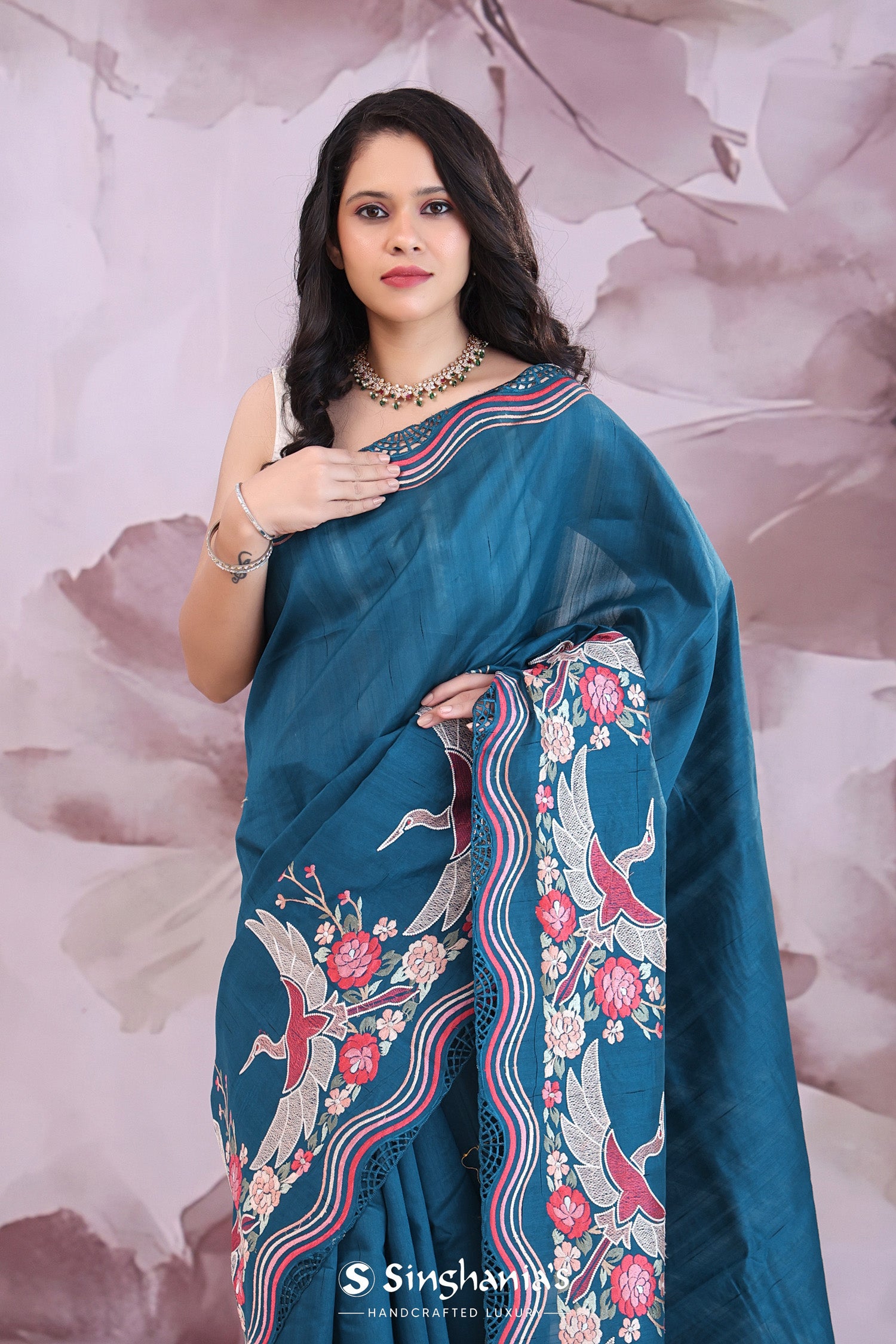 Chathams blue tussar saree presenting a wave pattern in vibrate colors all over the border along with avian and floral embroidery embellished which is adding the charm to overall look.