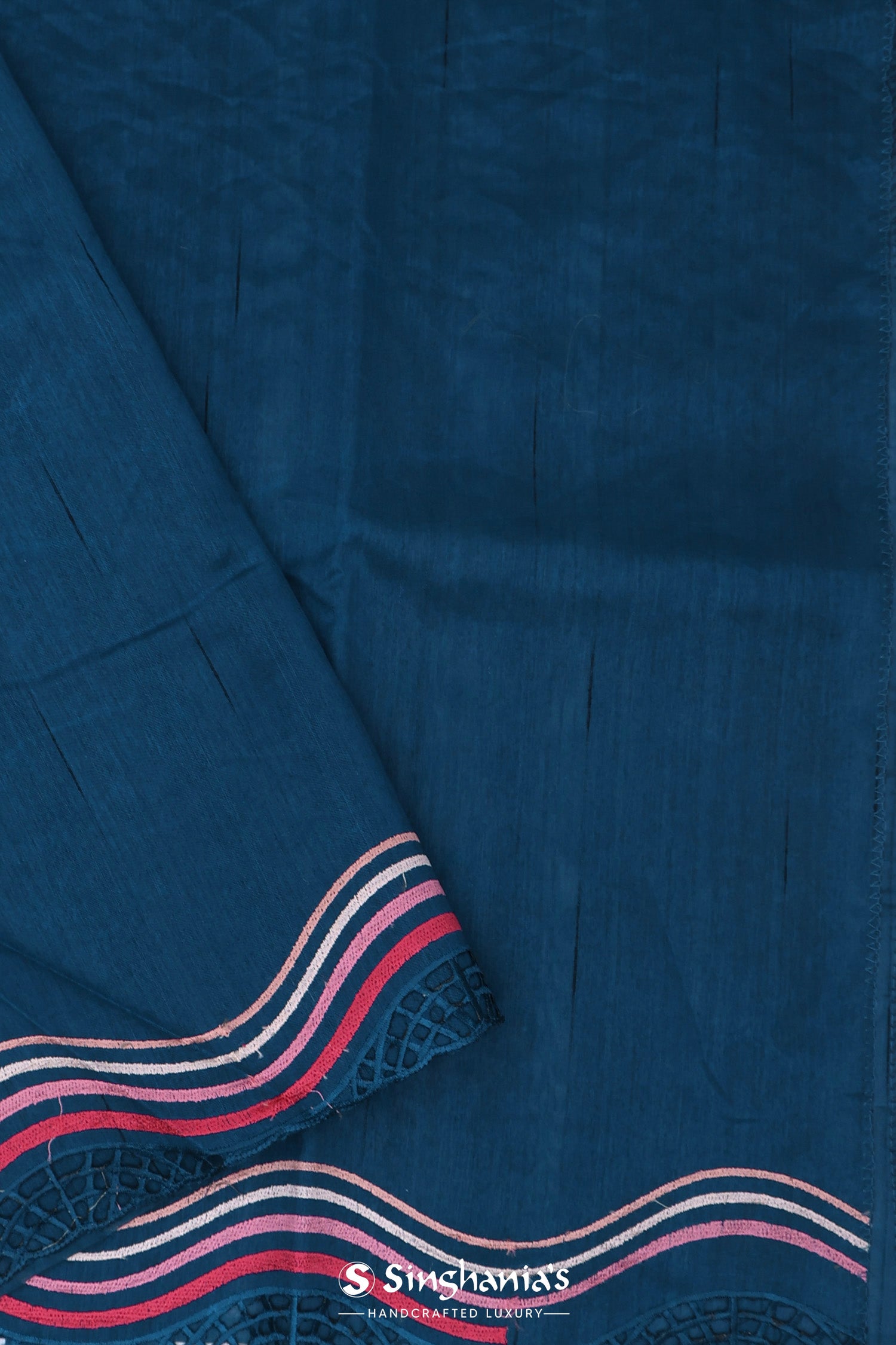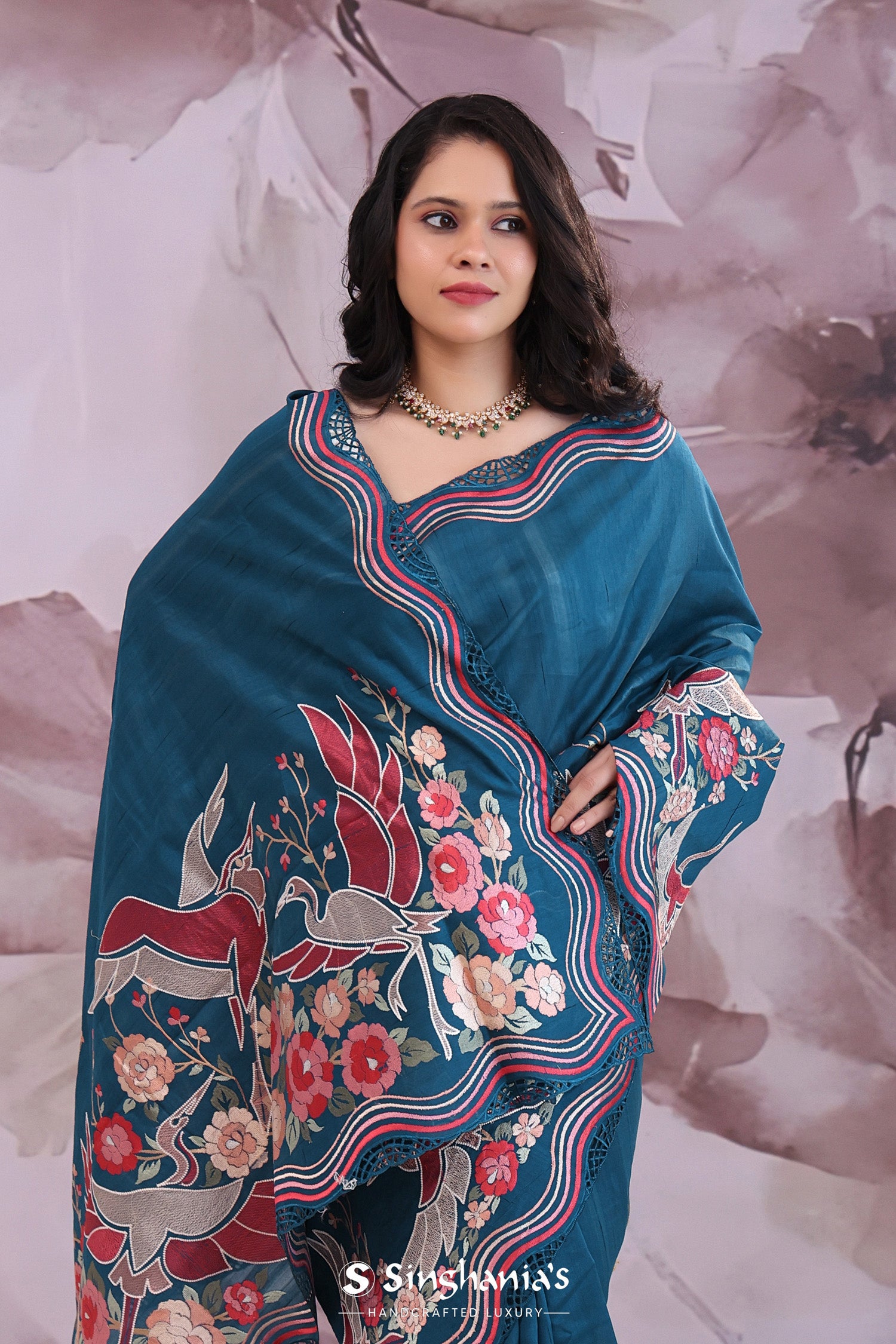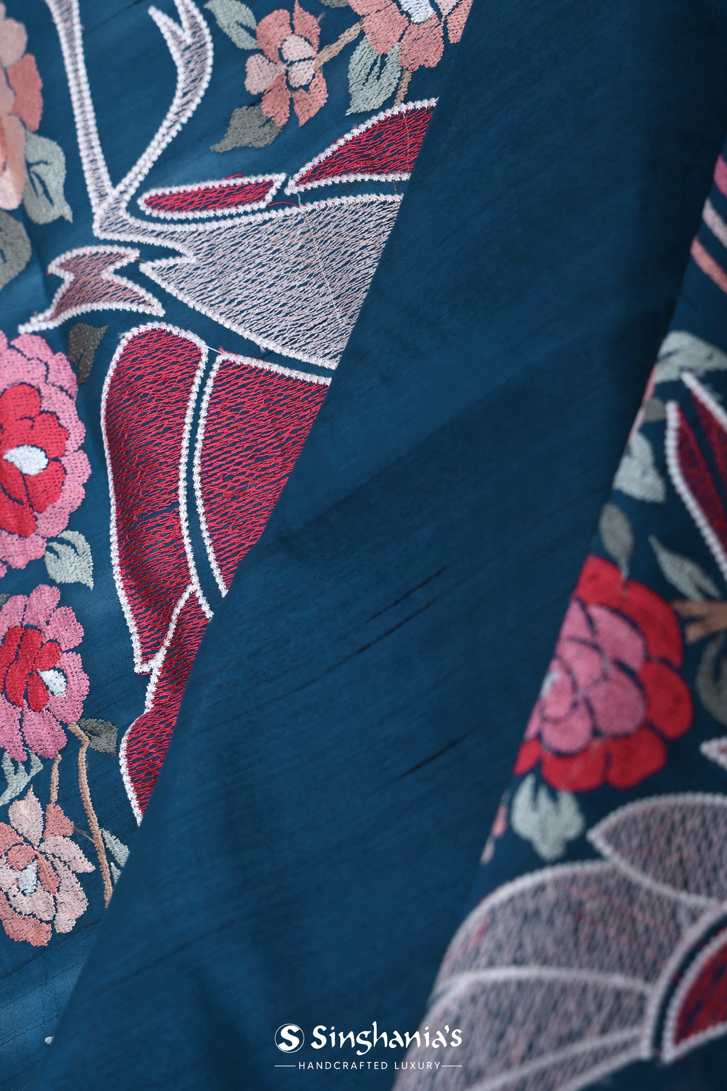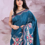 Chathams blue tussar saree presenting a wave pattern in vibrate colors all over the border along with avian and floral embroidery embellished which is adding the charm to overall look.