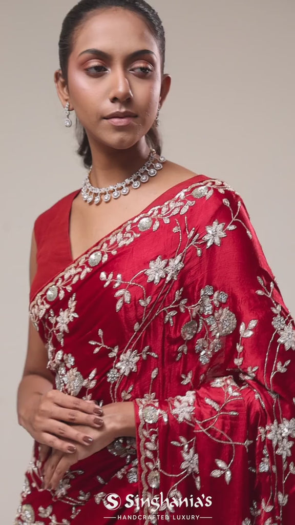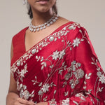 A gorgeous chilli red saree with a silk base, which features floral jaal embroidered pattern. Added with intricately embroidered border and pallu, crafted with sequins and glass beads. It’s an excellent choice for festivals, receptions and grand celebrations.