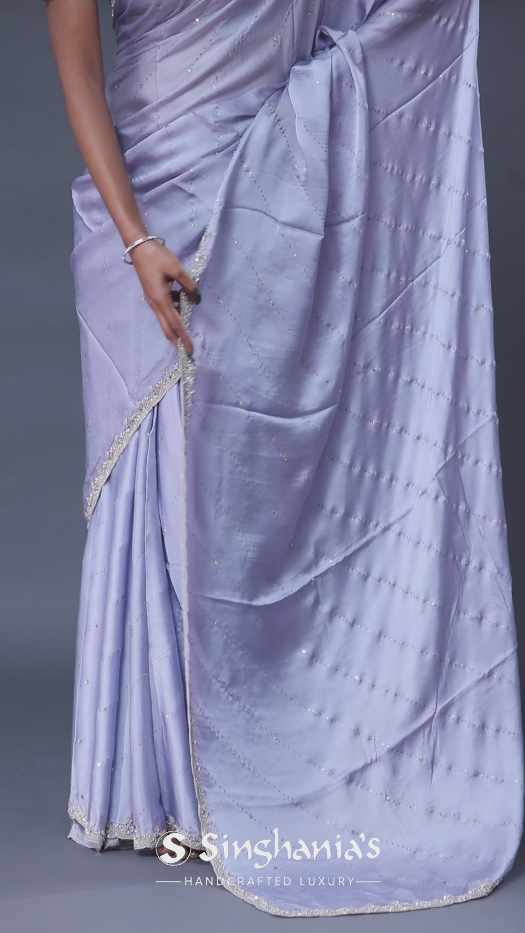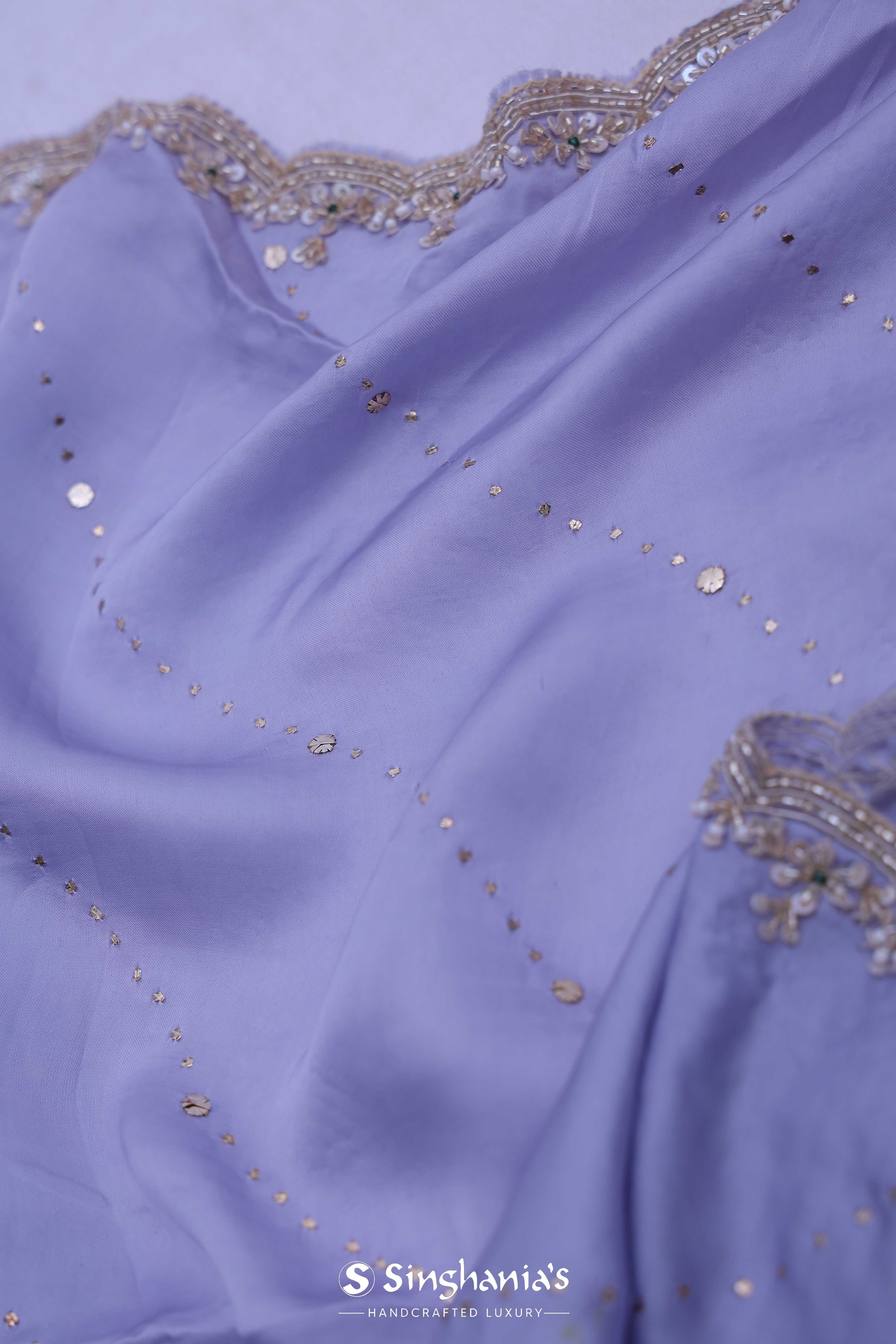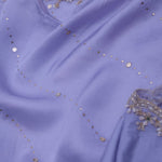 The smooth cornflower blue satin saree is embellished with dots on all over the saree complemented with sequins and kardana work on scallop border