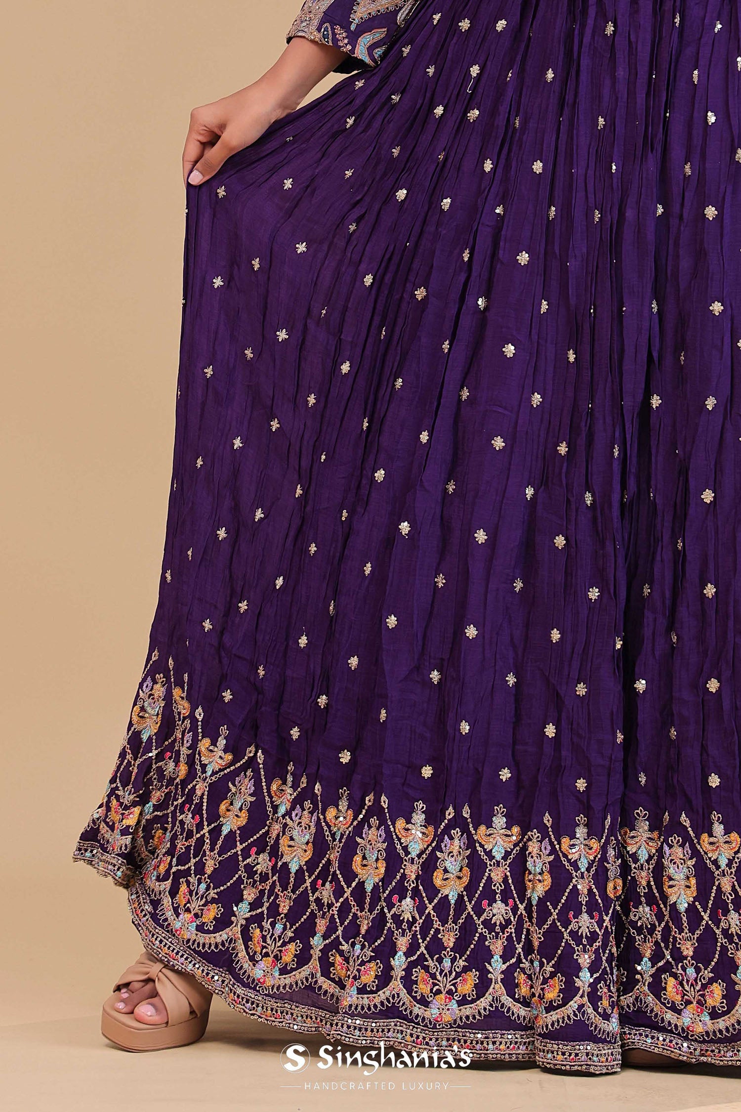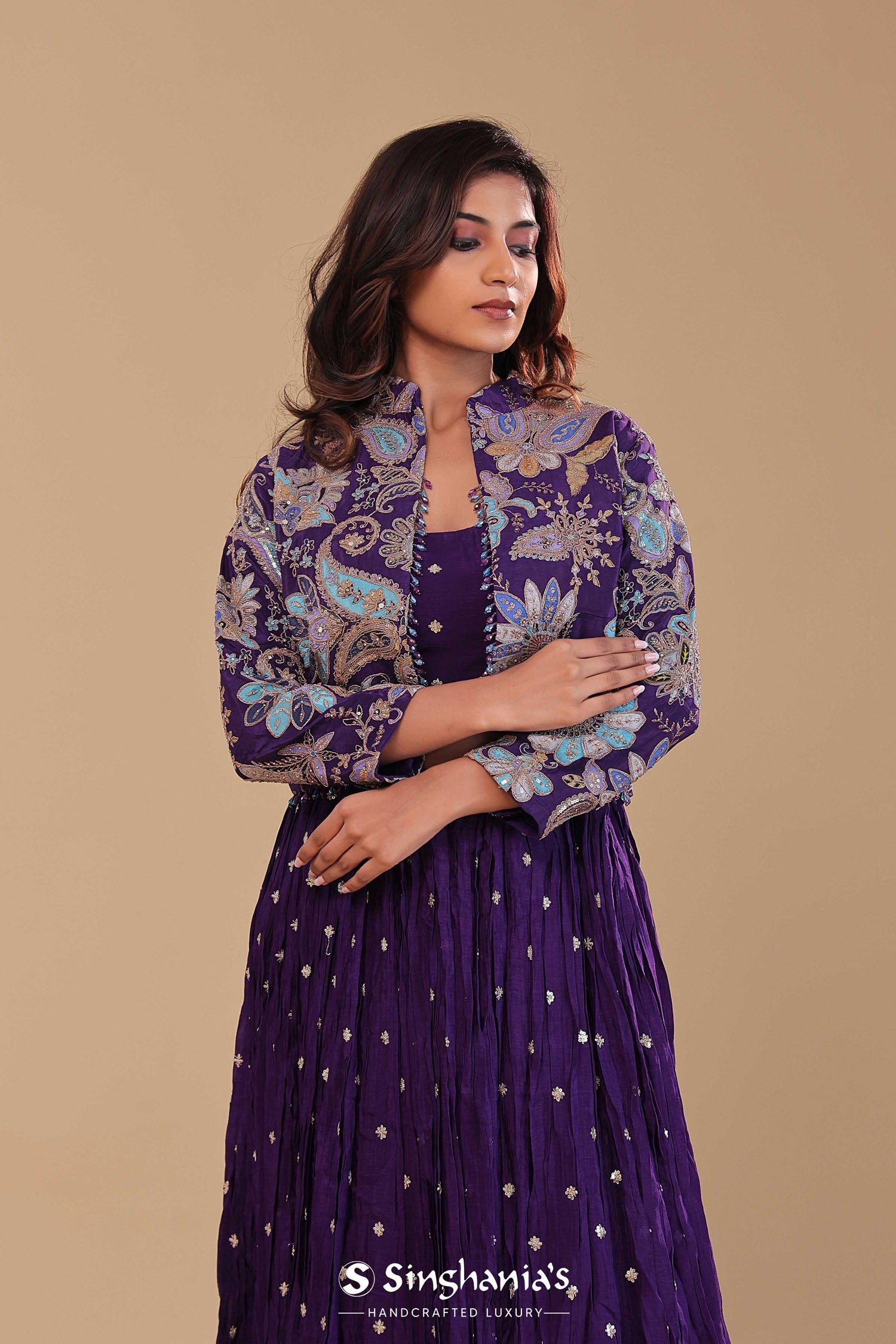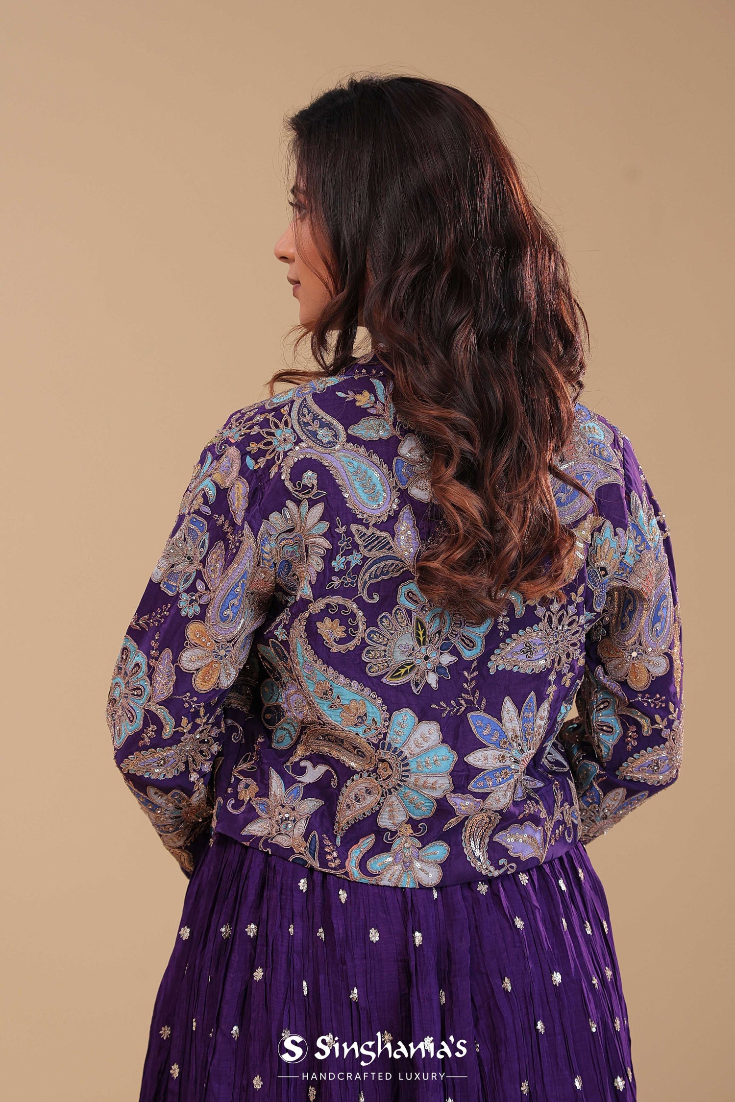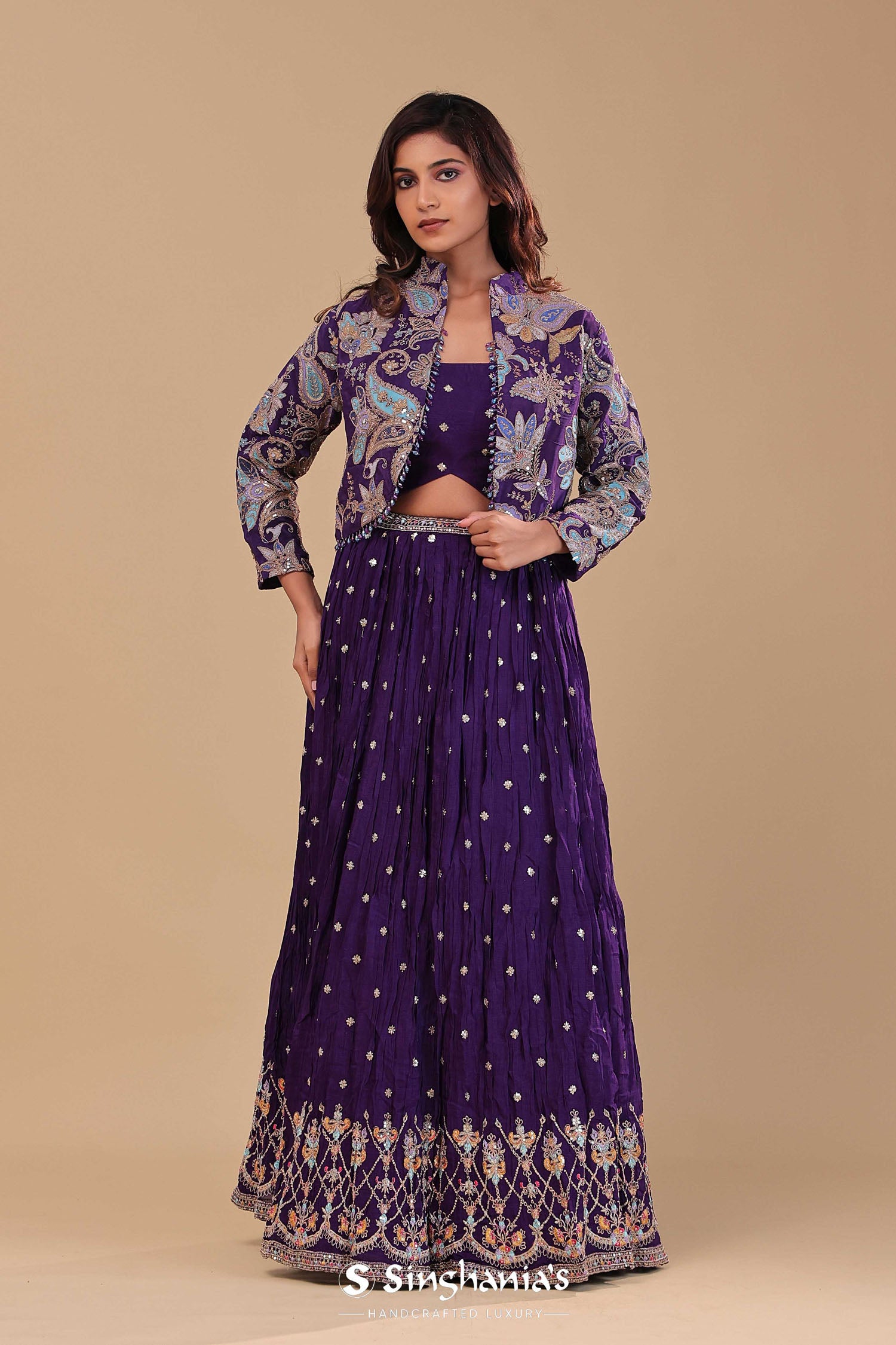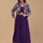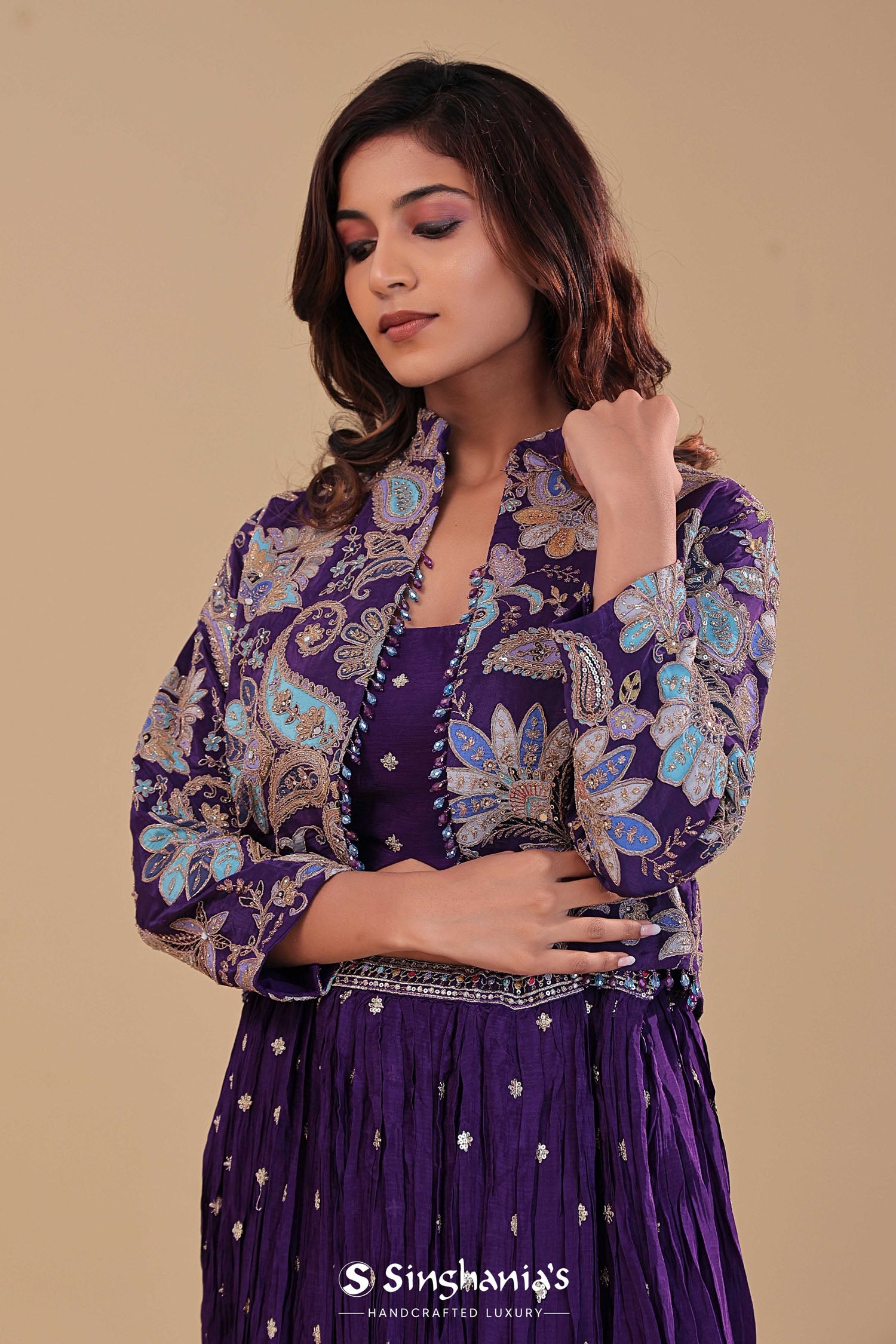 Dark purple georgette lehenga set features round neck blouse with tiny embroidery work along with matching lehenga with similar design . The magnificent silk jacket embellished with embroidery work forming a paisley and floral design