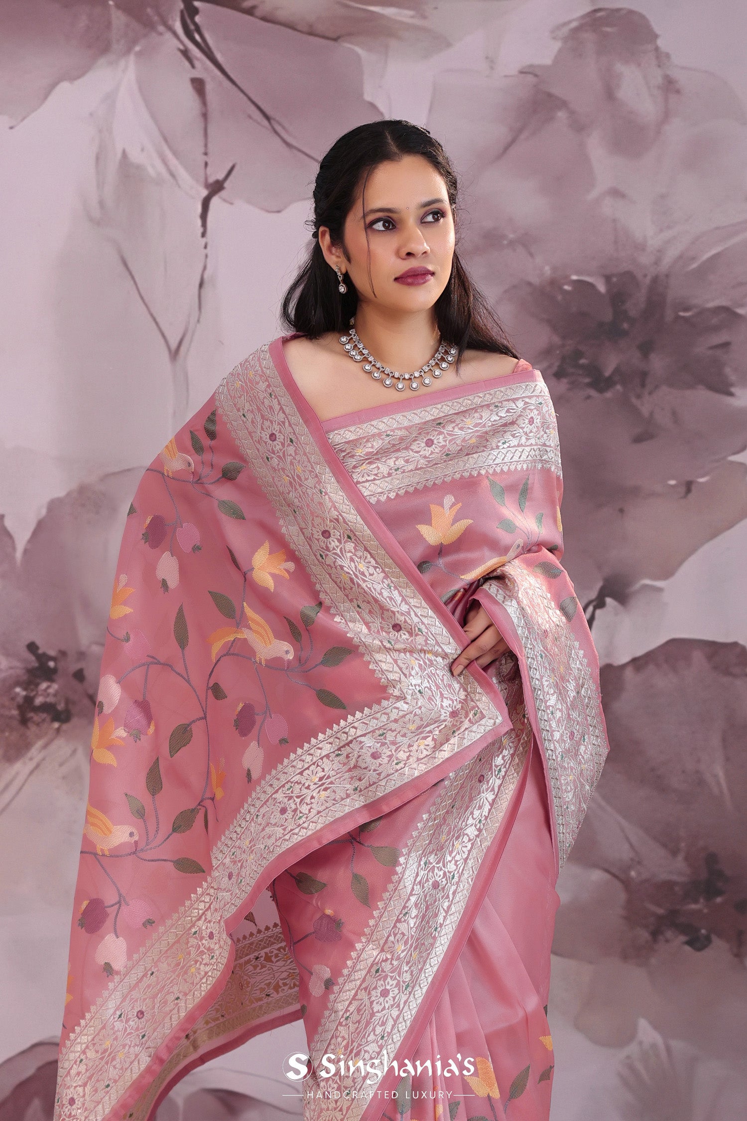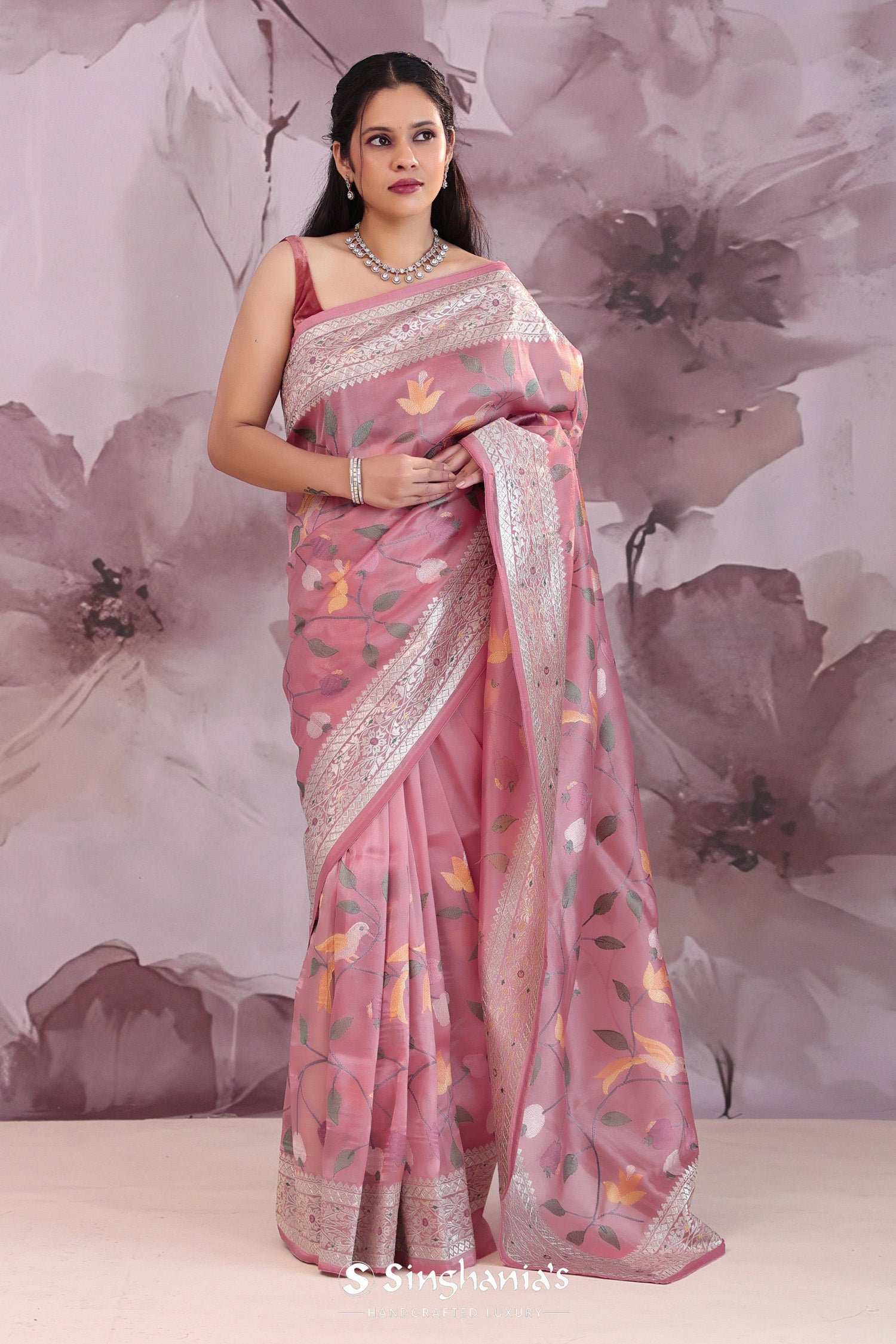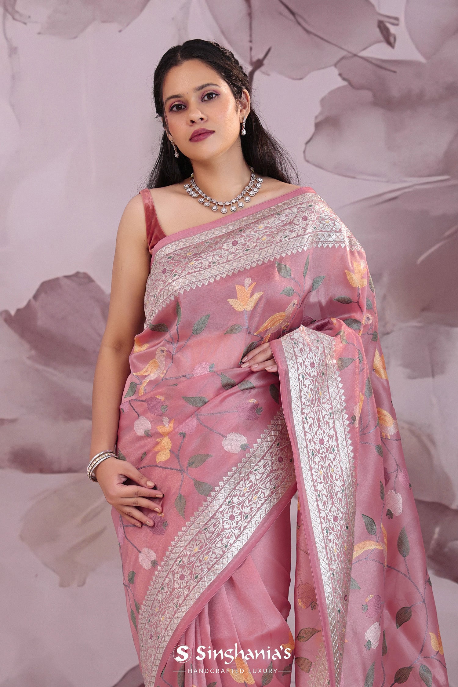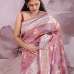 Dusty pink saree features leaf,floral and avian jaal embroidered spread all across the body of saree along with meenakari border which is adding the charm to overall look.