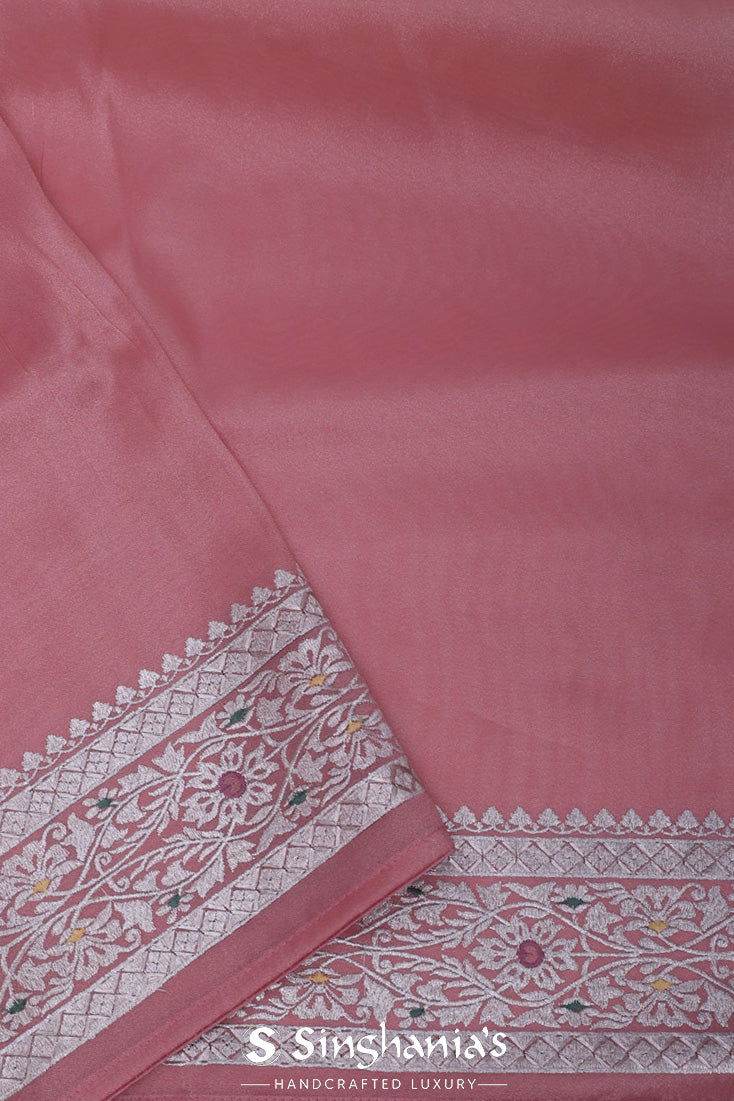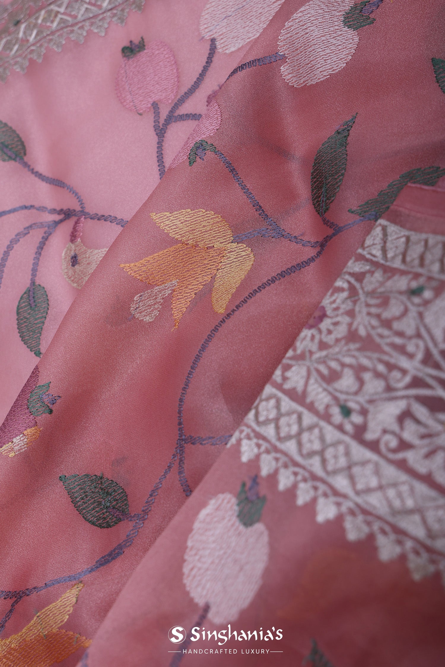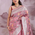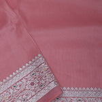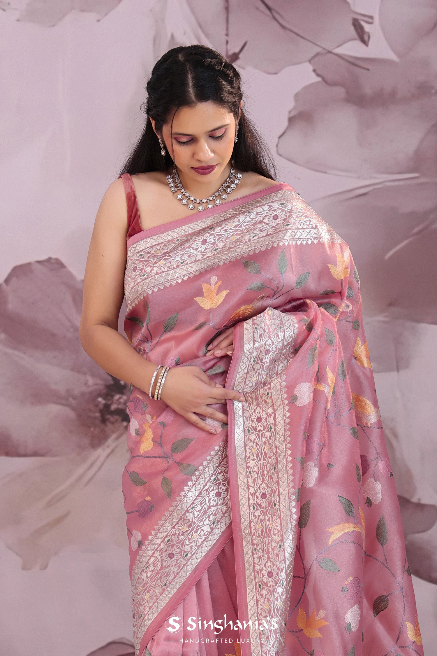 Dusty pink saree features leaf,floral and avian jaal embroidered spread all across the body of saree along with meenakari border which is adding the charm to overall look.