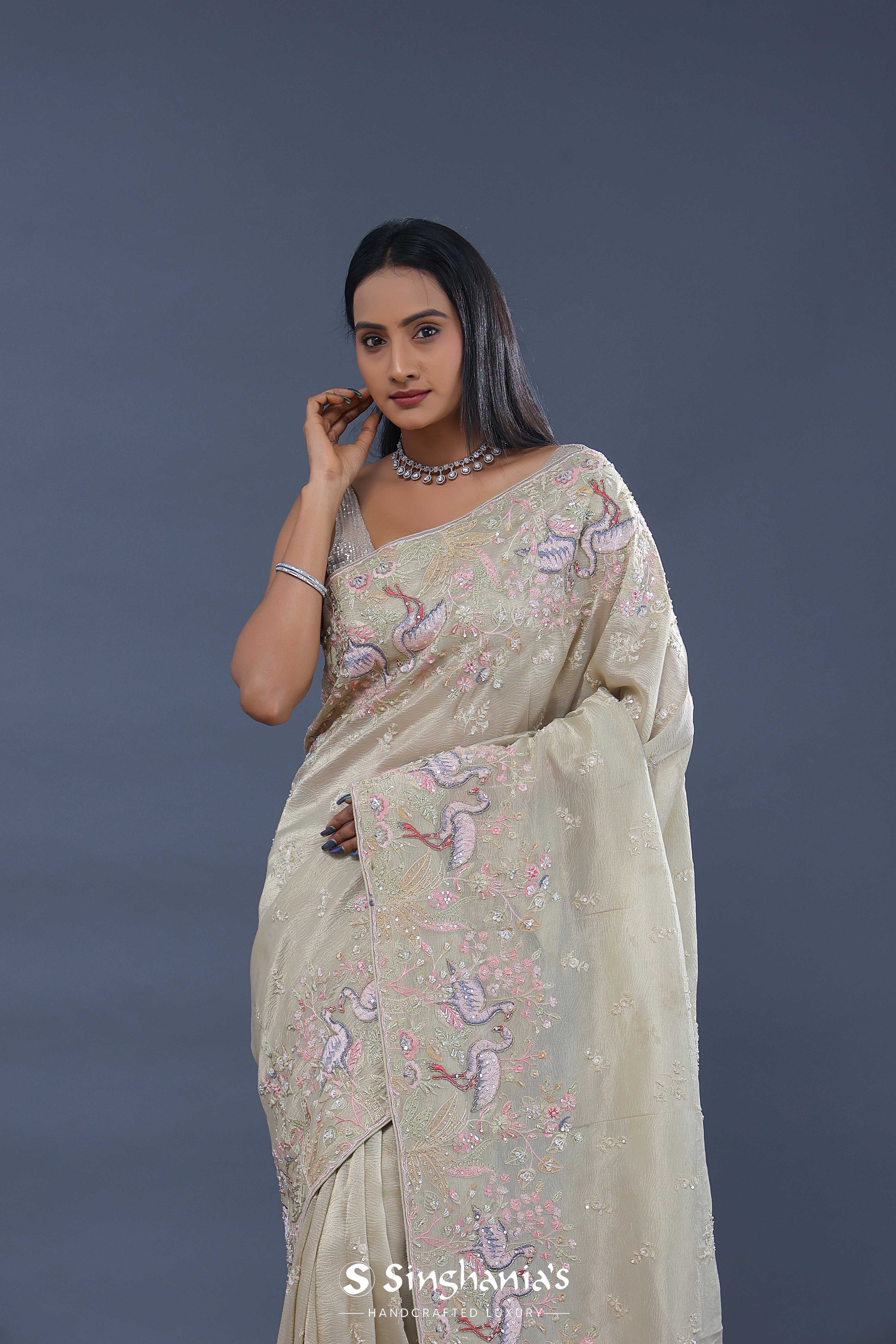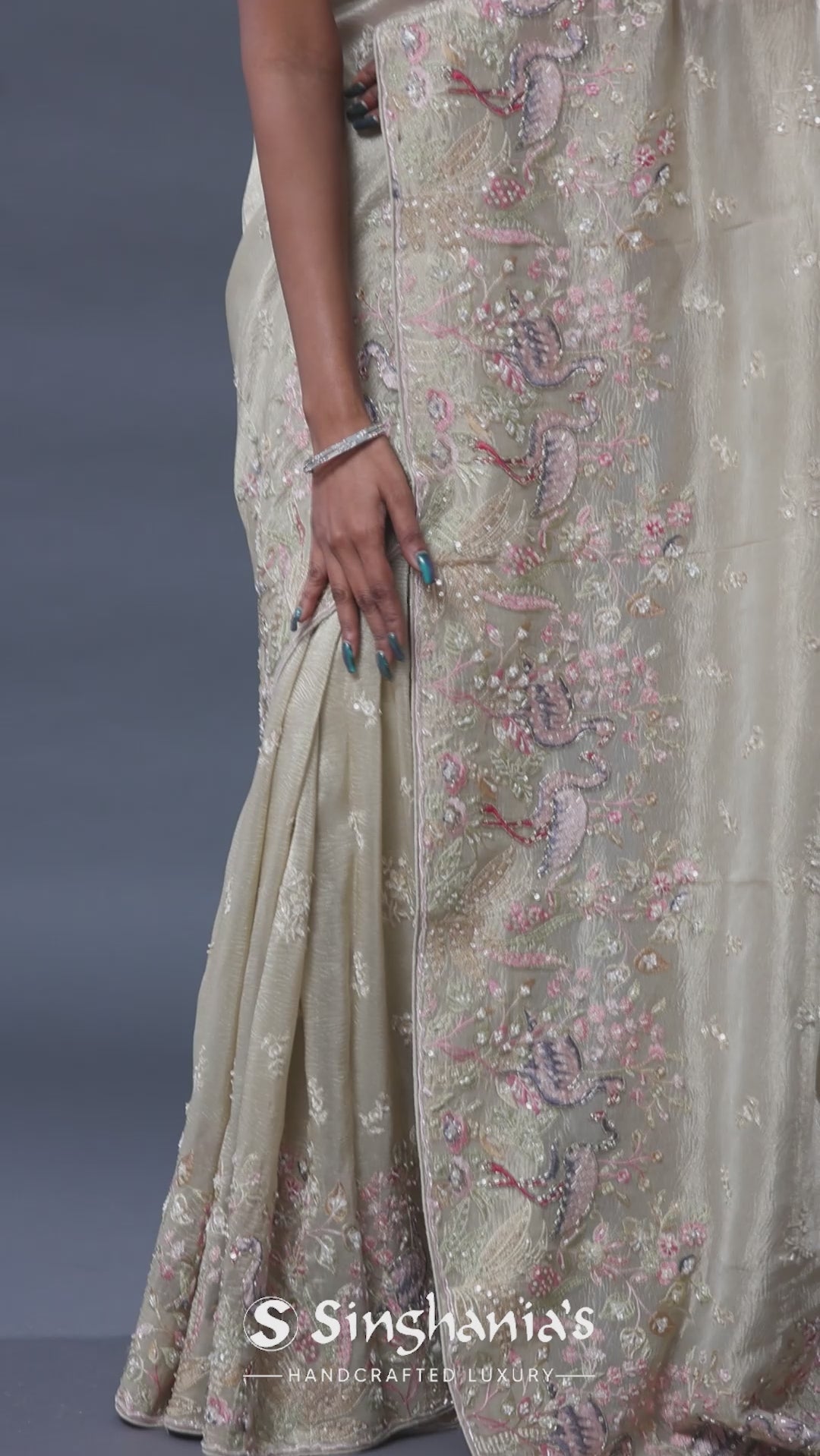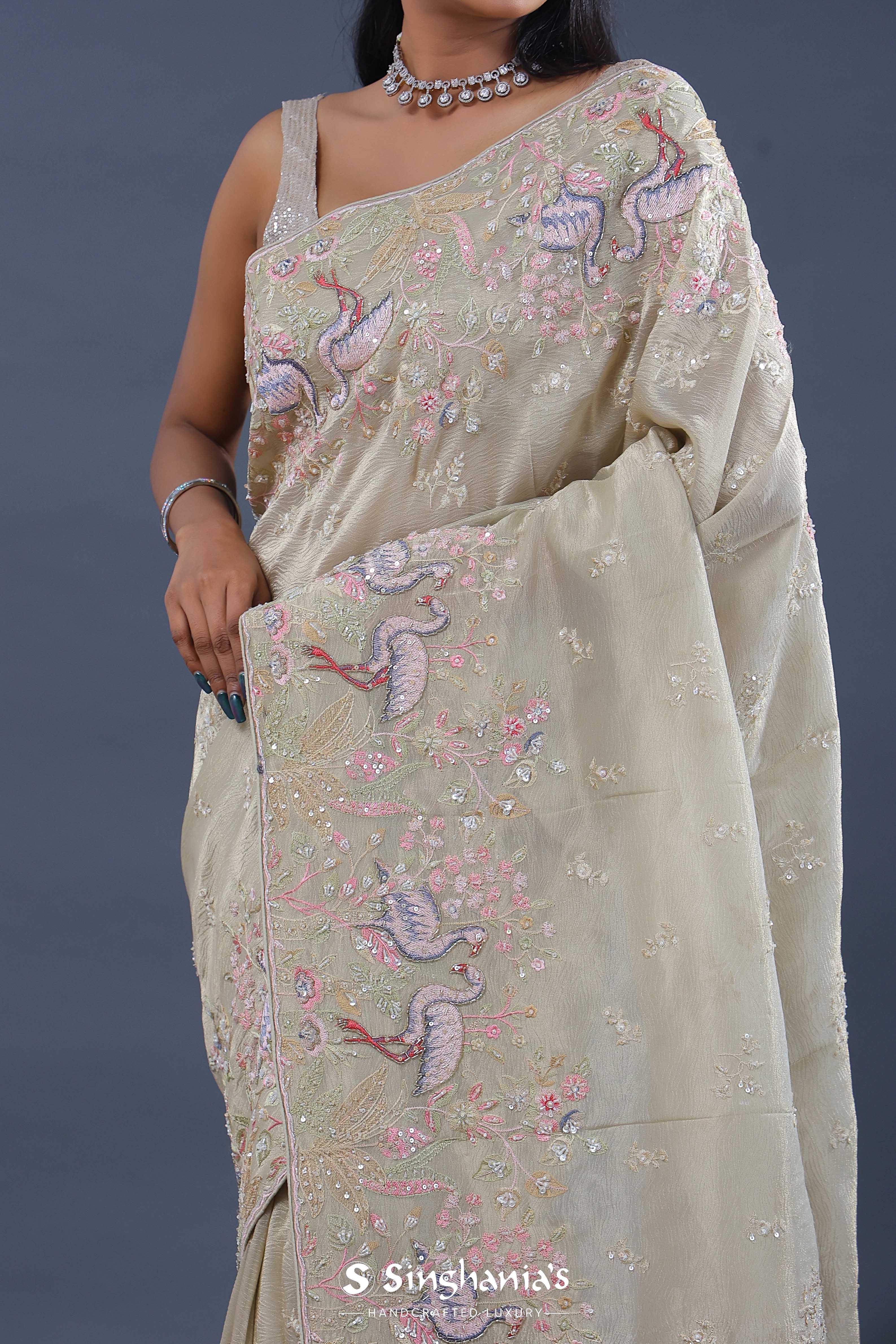 Gin green crushed tissue is luxurious saree woven with intricate embroidery and subtle sequins work featuring flowers, leaves and swans at the border and butti's on entire saree making it ideal choice for any occasions