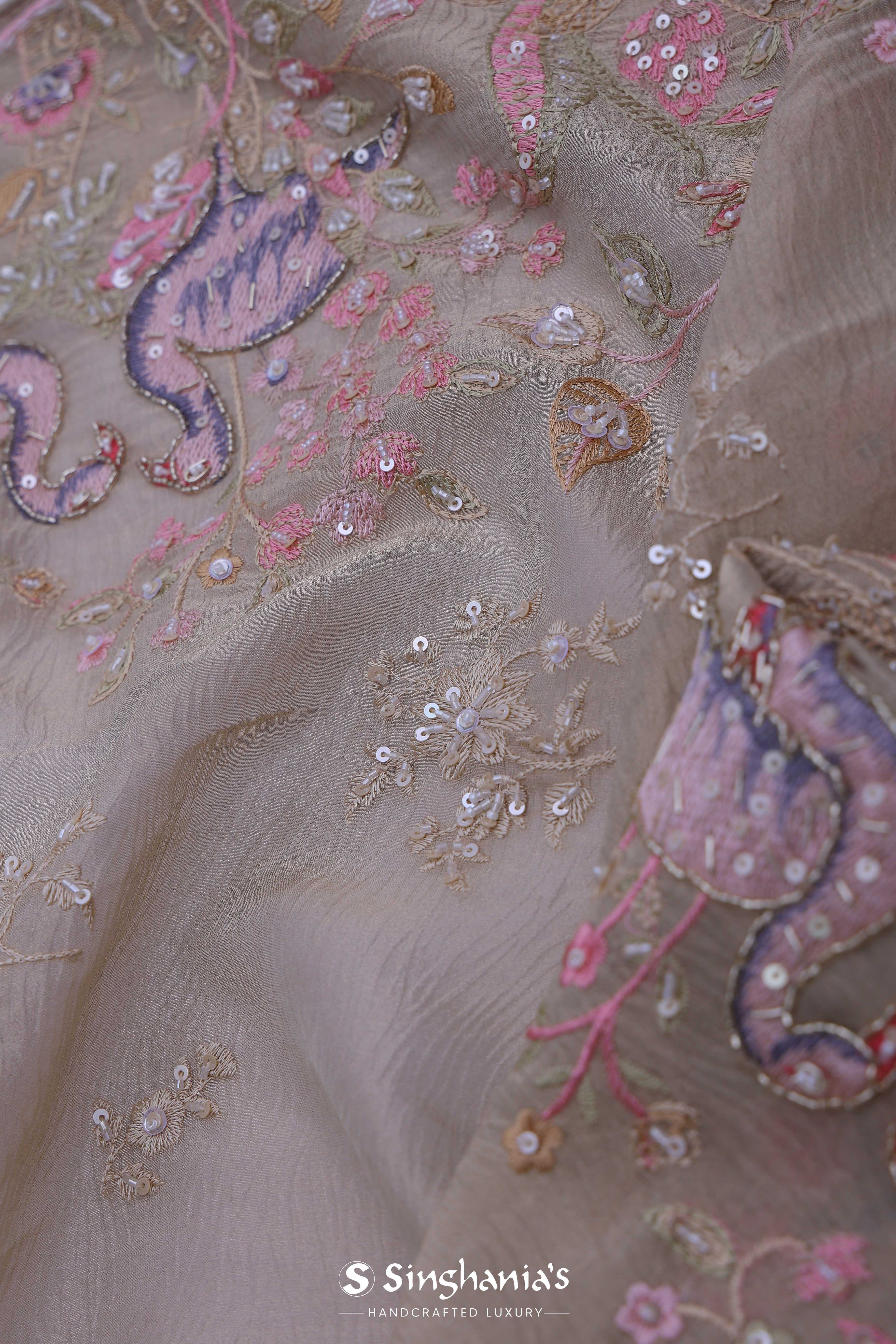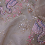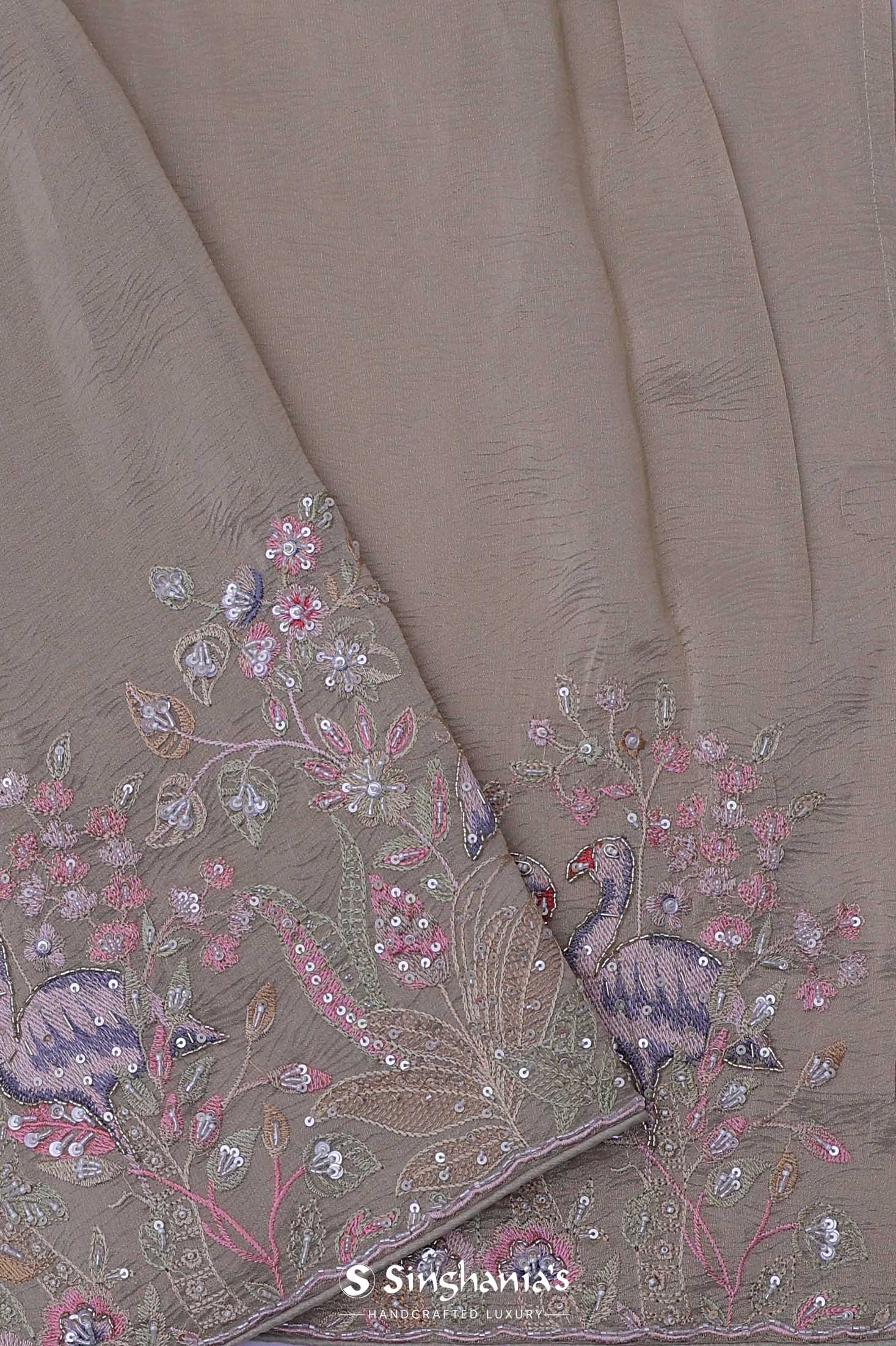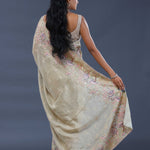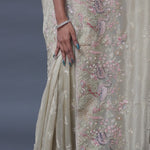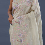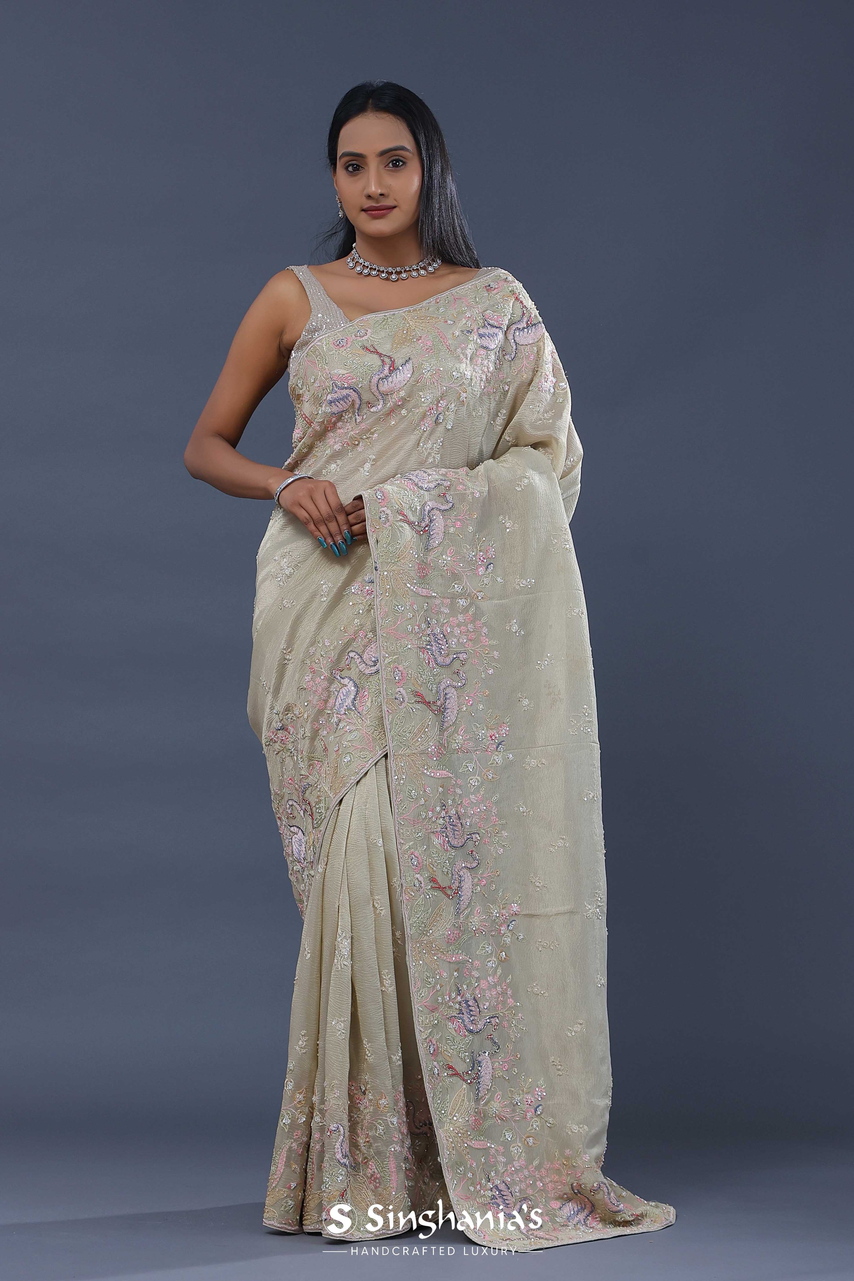 Gin green crushed tissue is luxurious saree woven with intricate embroidery and subtle sequins work featuring flowers, leaves and swans at the border and butti's on entire saree making it ideal choice for any occasions