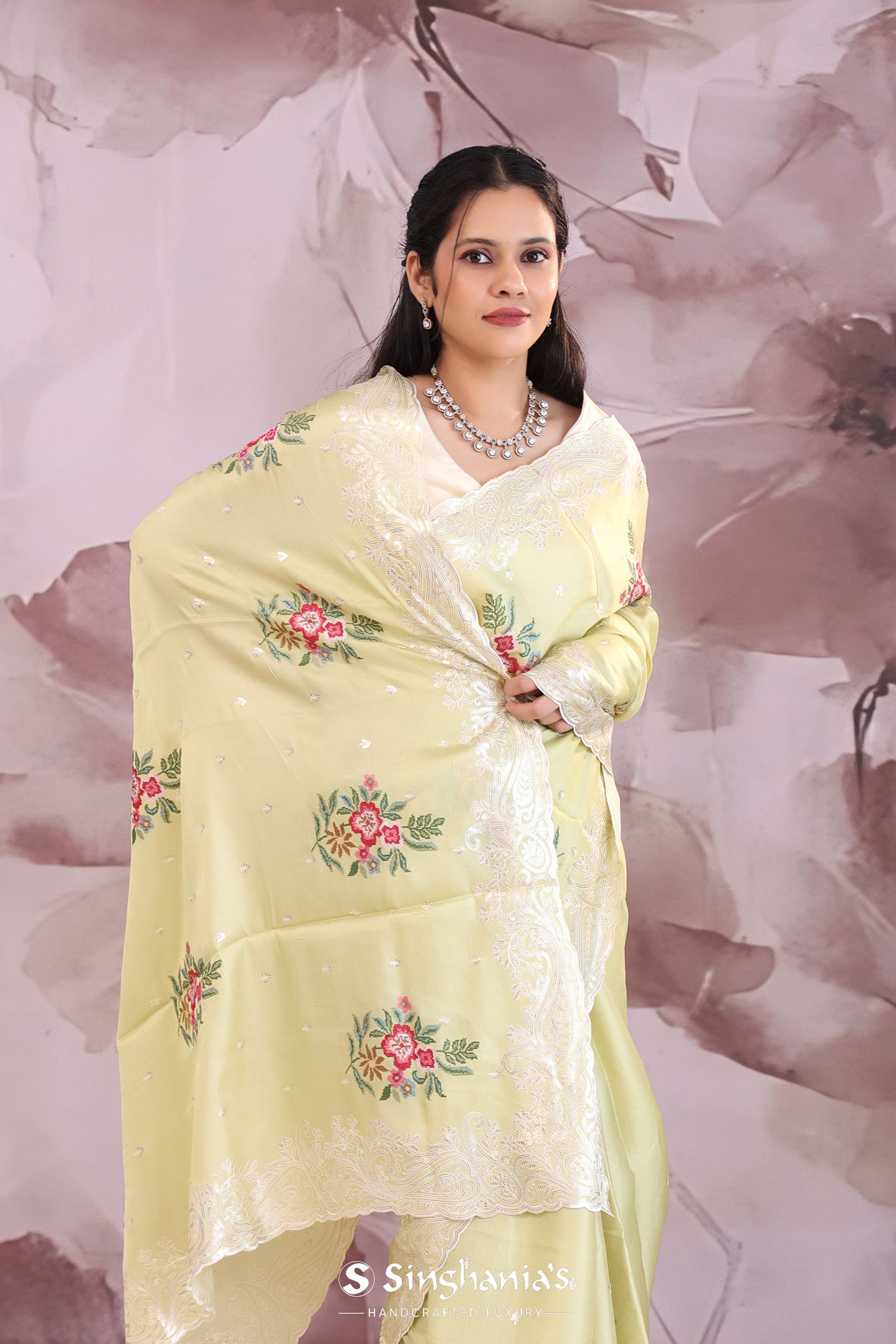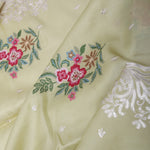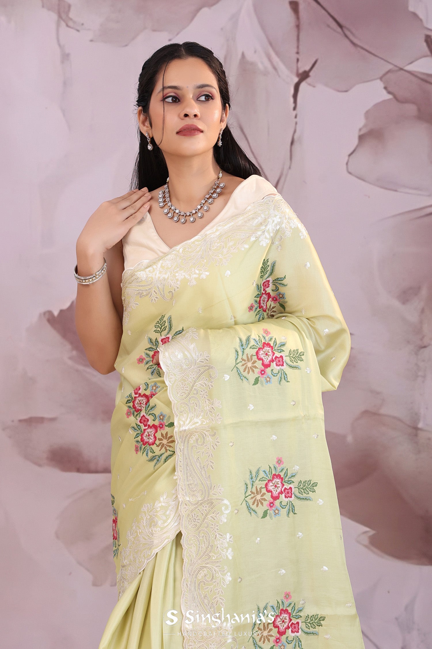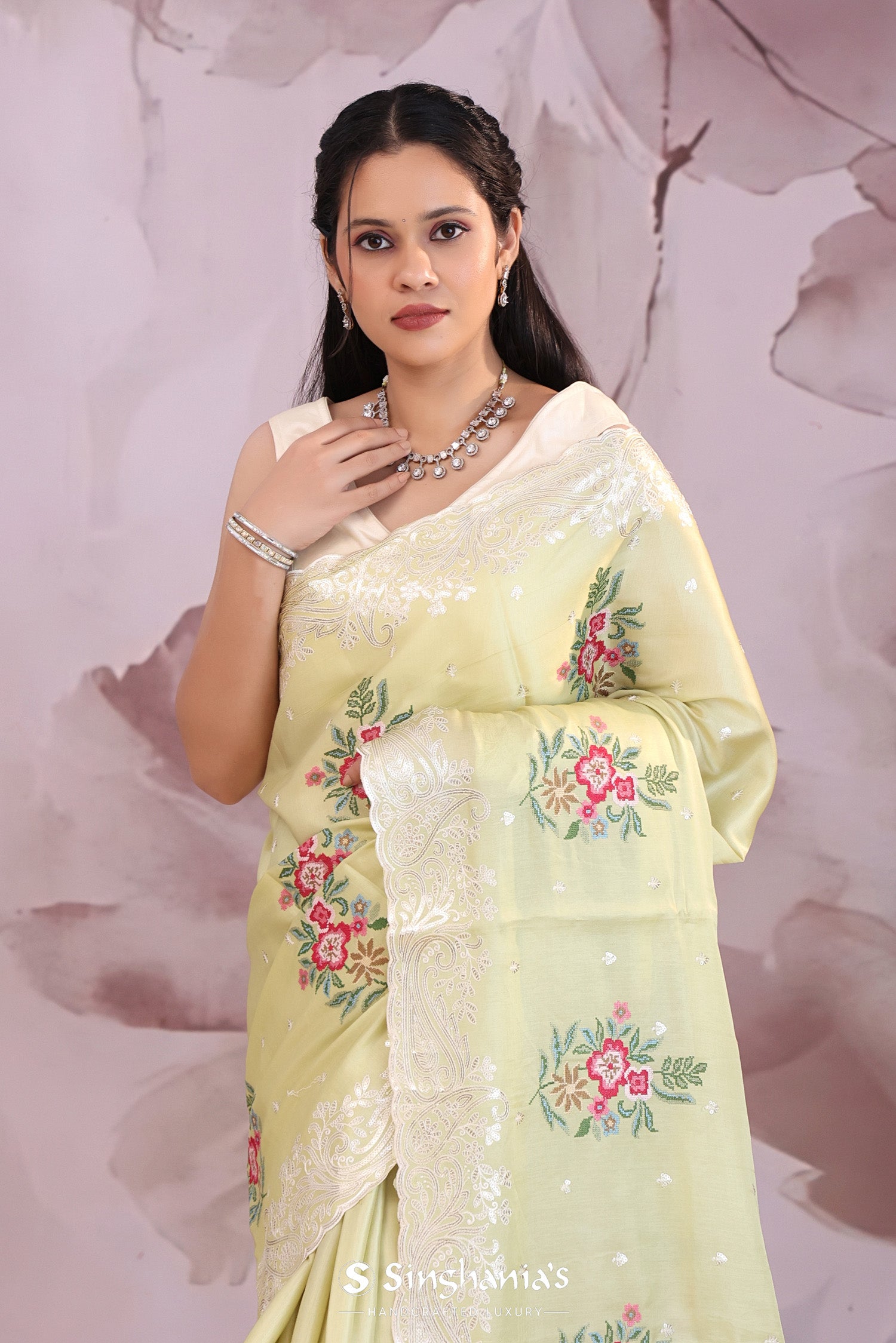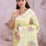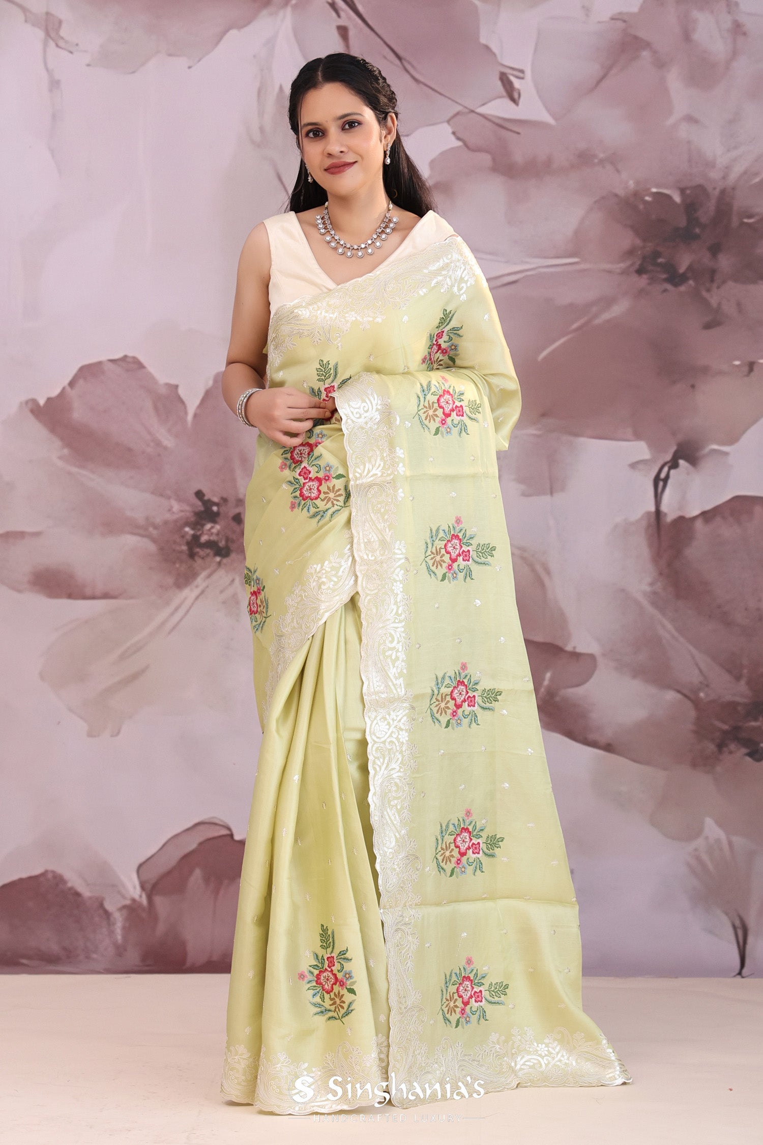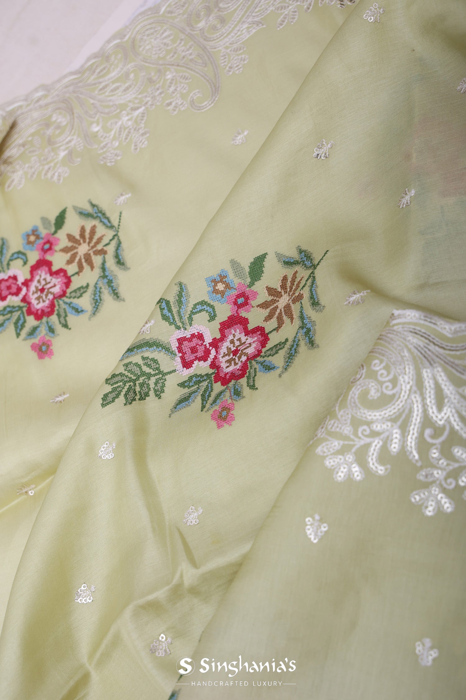 Gin green saree presents petit point embroidery forming a floral pattern in vibrant colors and buttis's formed with sequins. The scallop border embellished with sequins work makes it stand out from other saree.