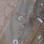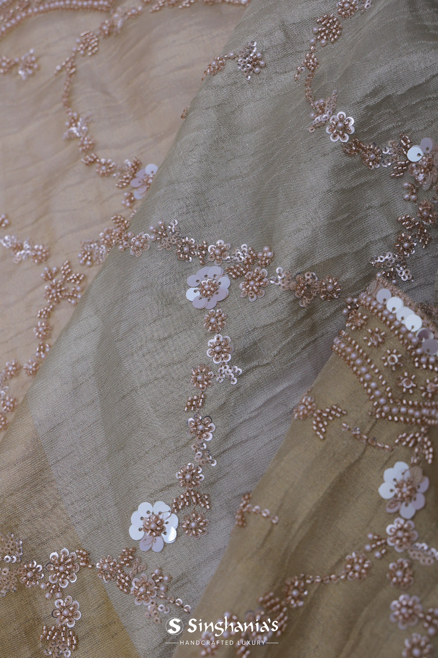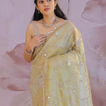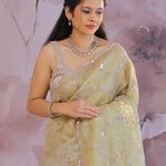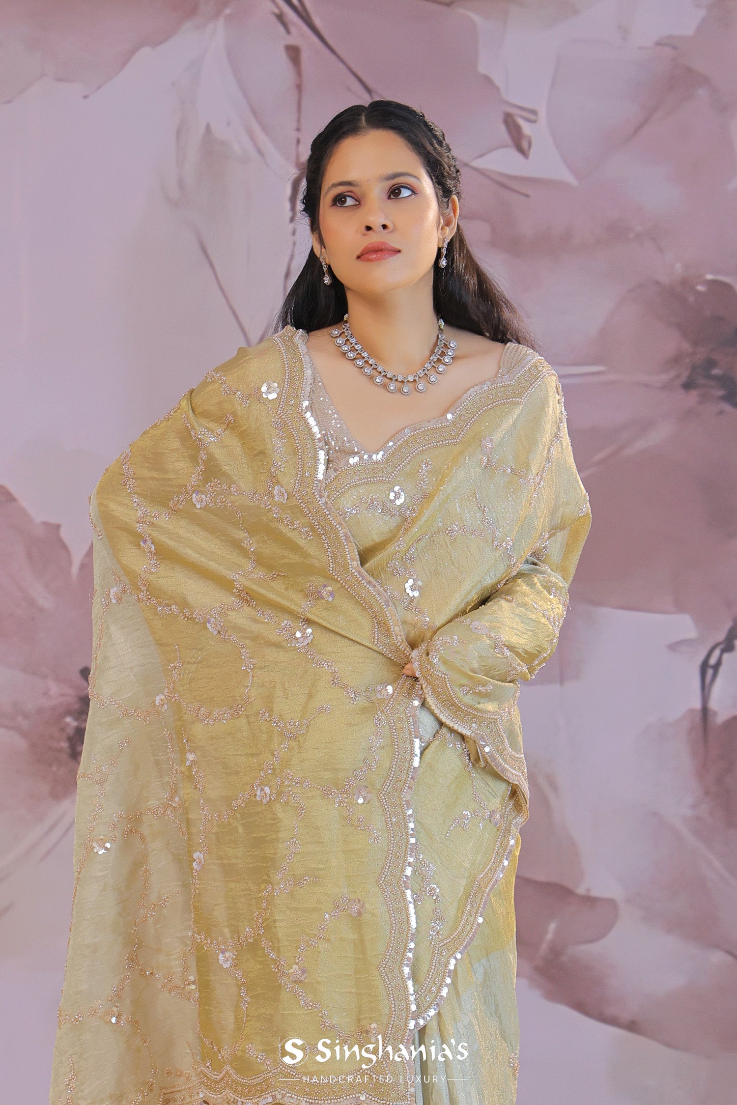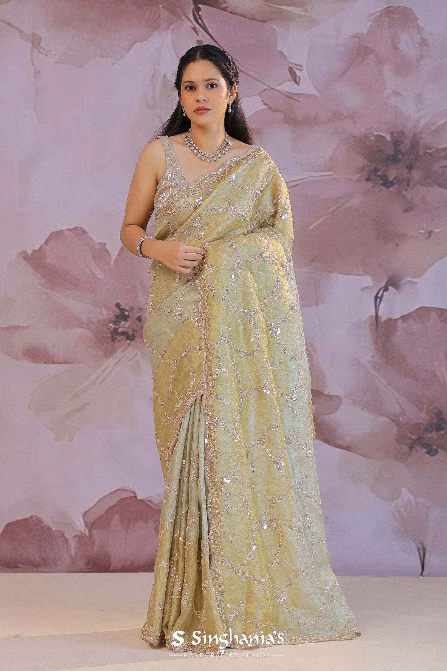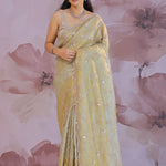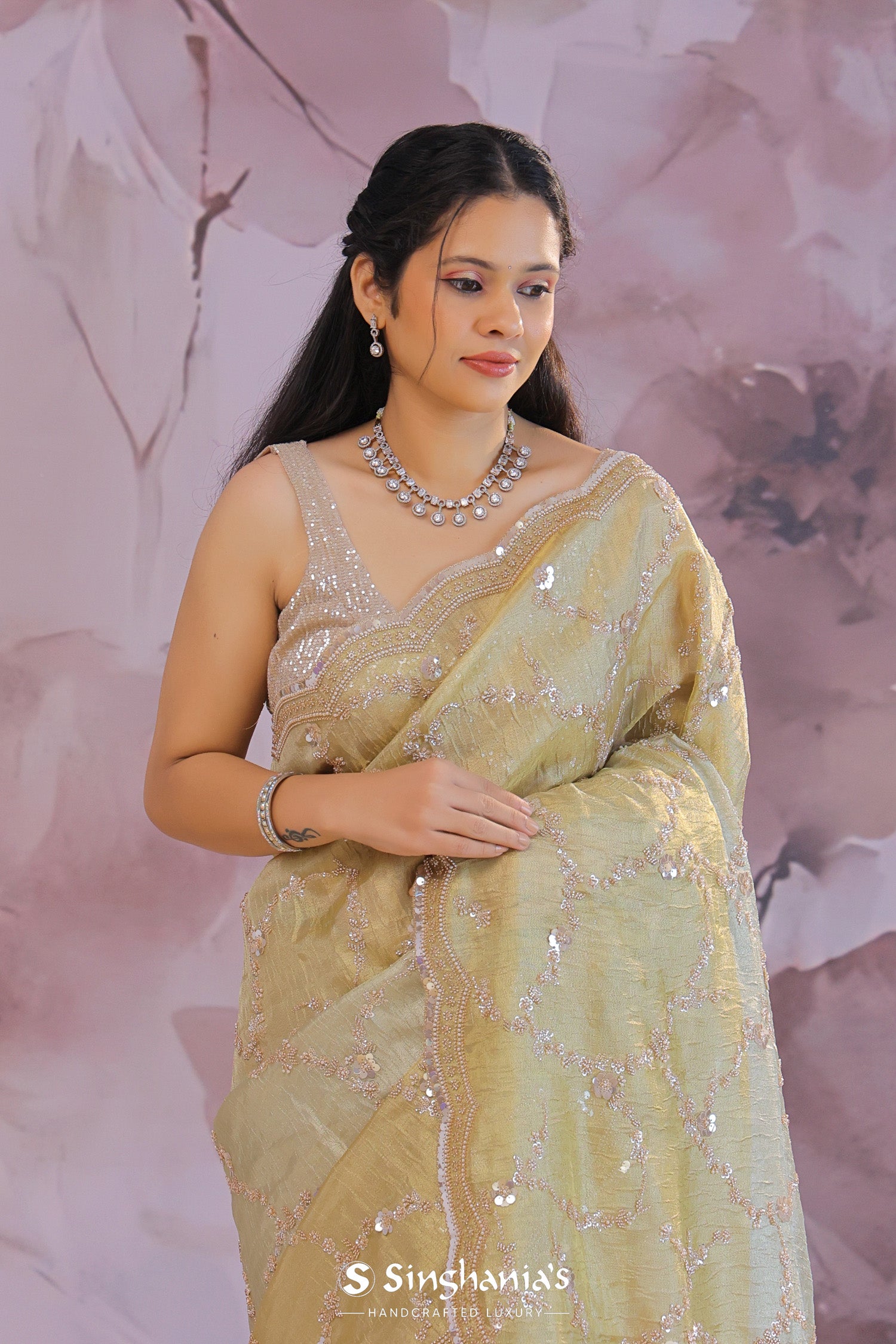 Golden fancy tissue saree features sequins and beads jaal spread all over the body with fancy scallop border which would light up every moment when you drape yourself with this .