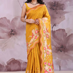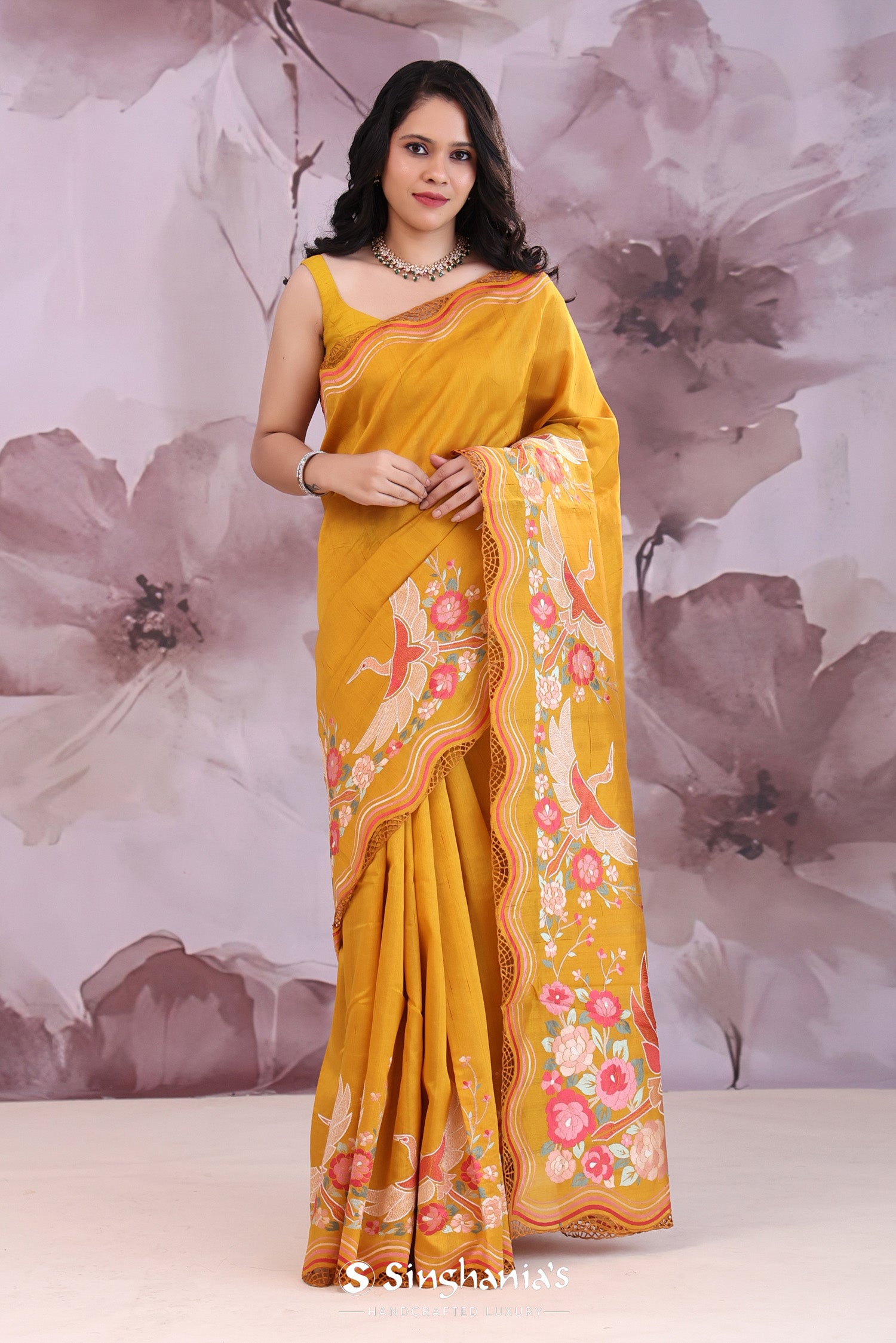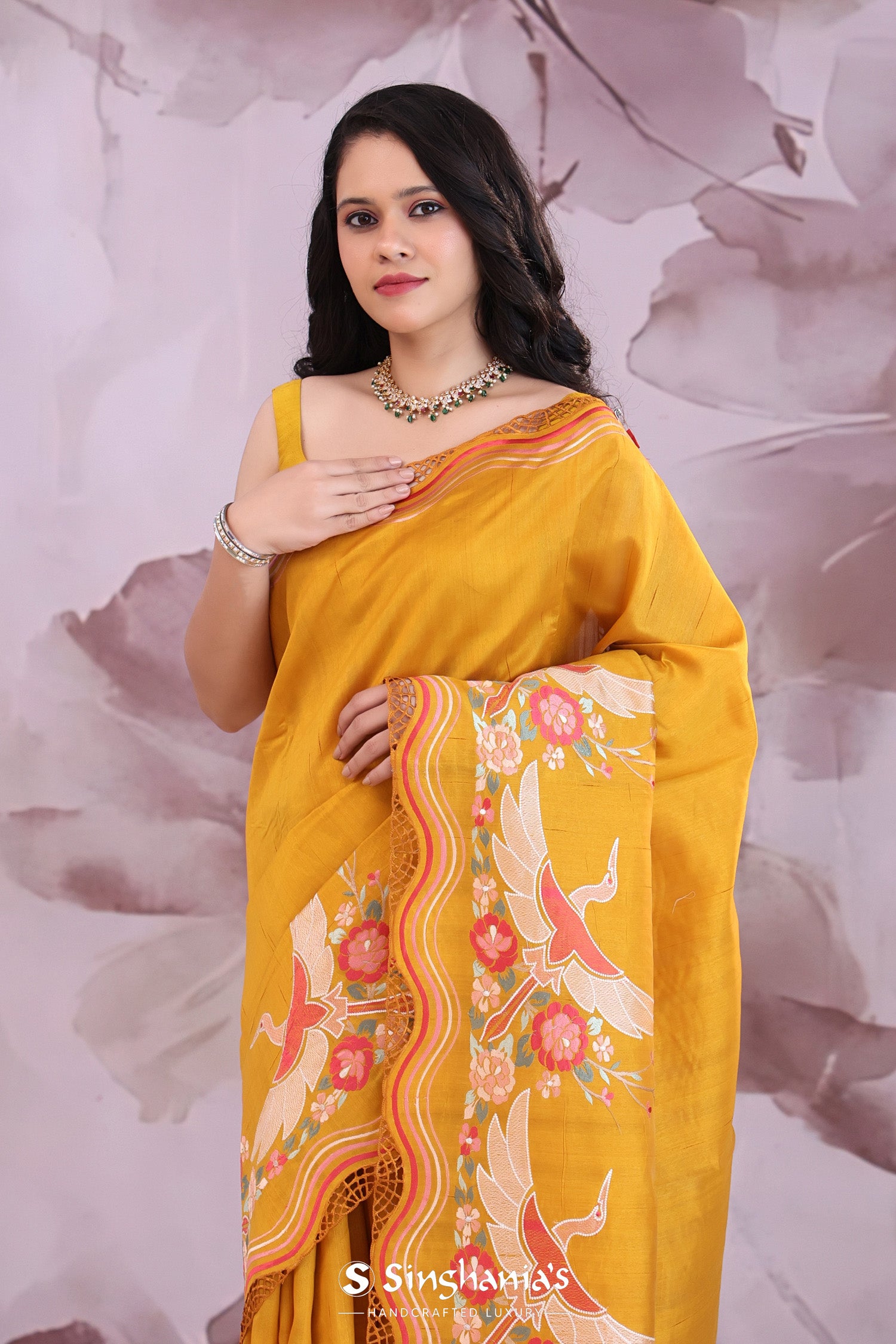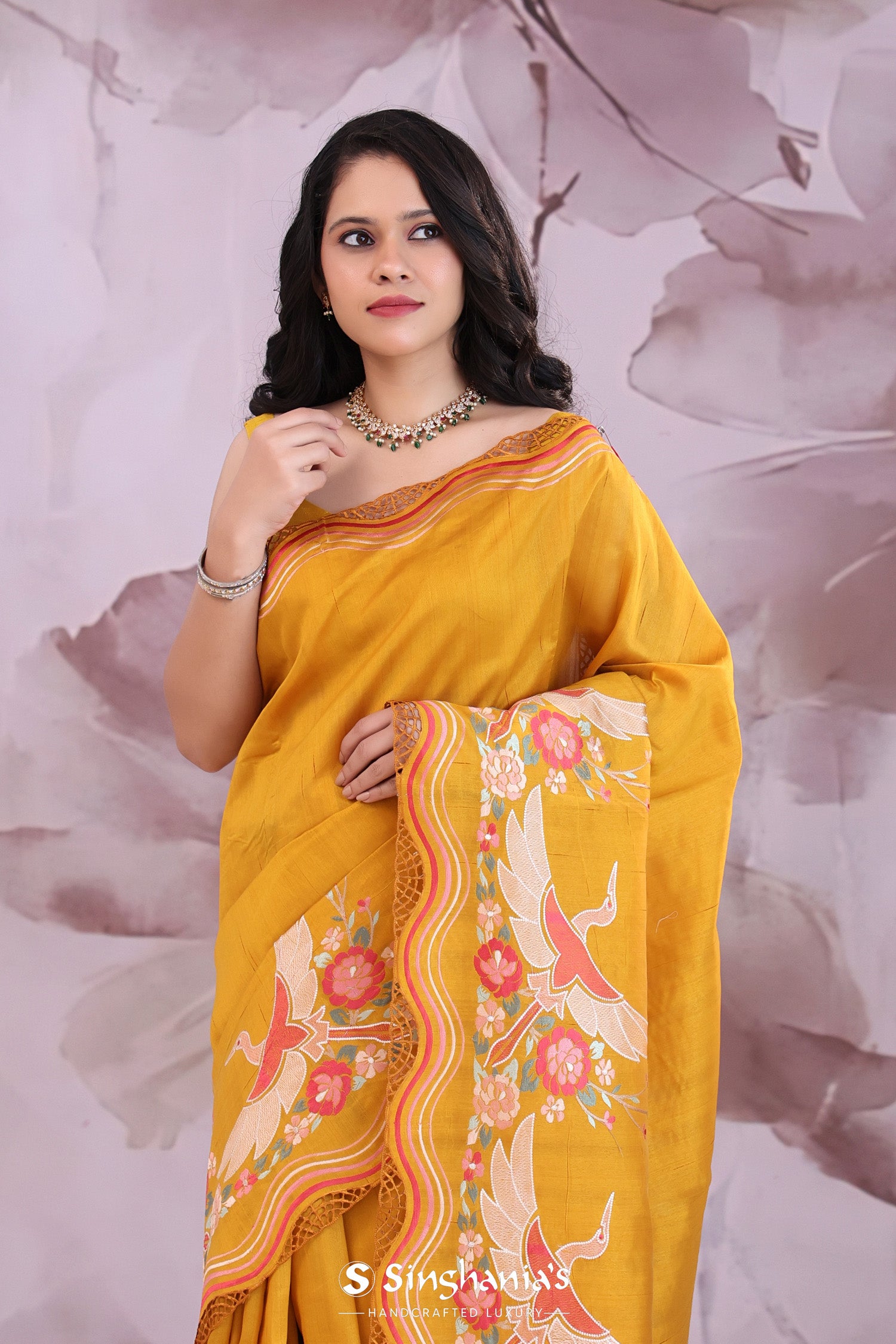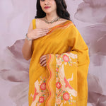 This vibrant Honey orange tussar saree presenting a wave pattern in contrast colors all over the border along with avian and floral embroidery embellished which is adding the charm to overall look.