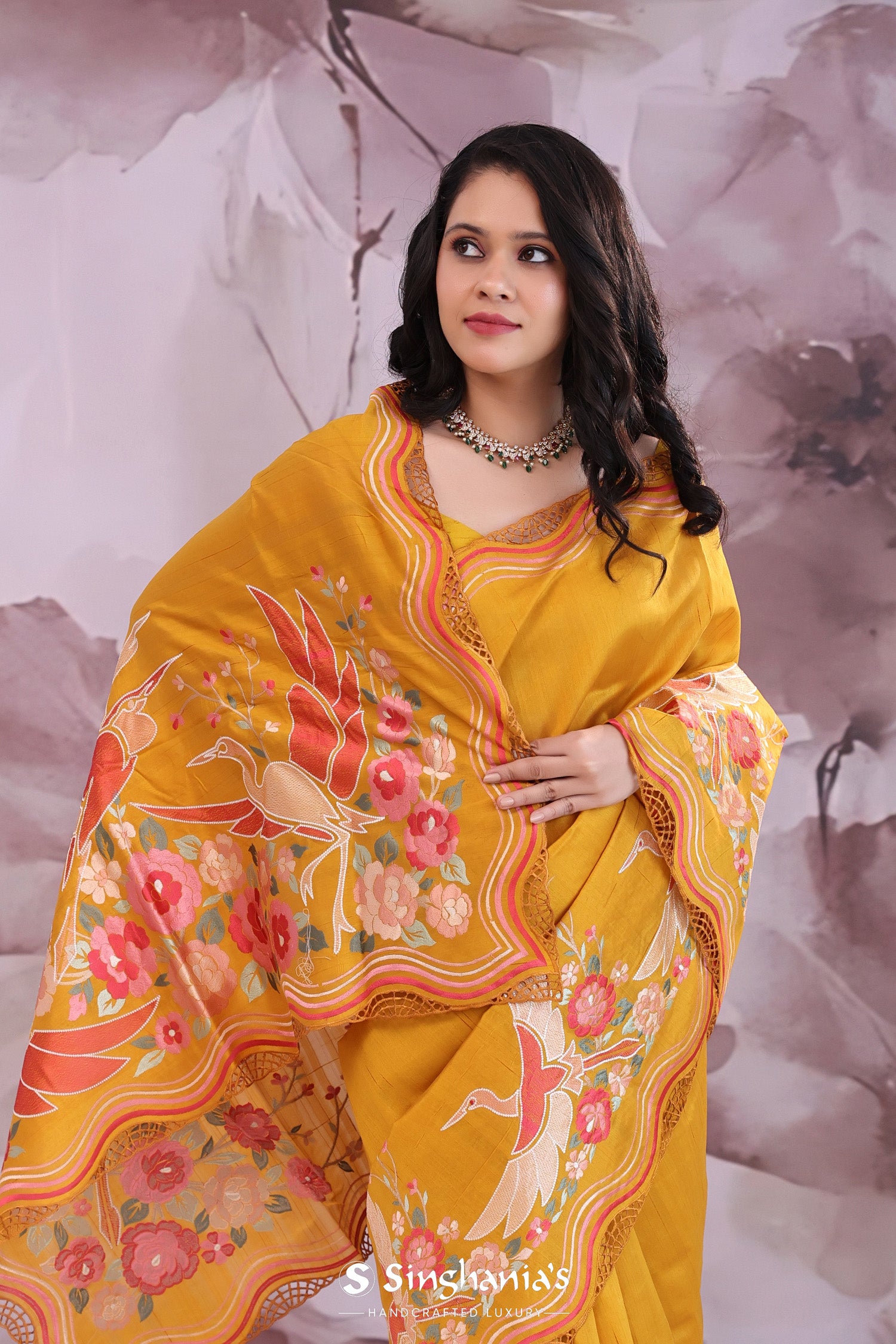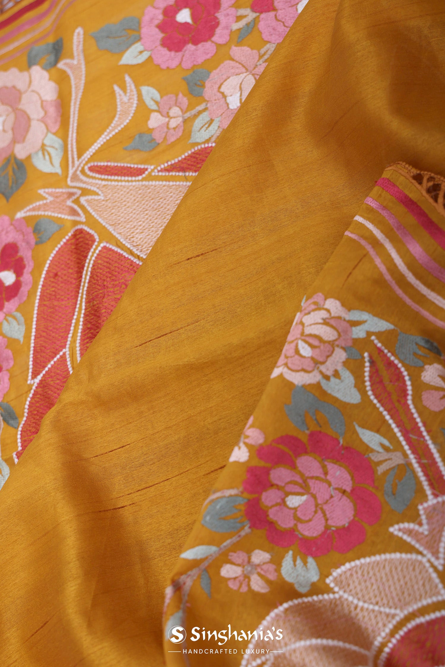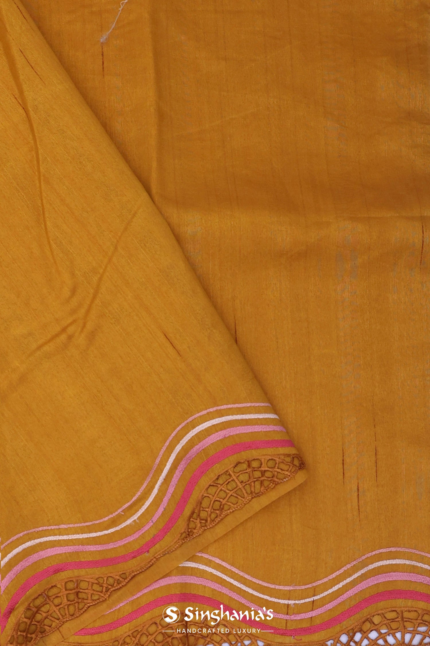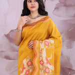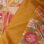 This vibrant Honey orange tussar saree presenting a wave pattern in contrast colors all over the border along with avian and floral embroidery embellished which is adding the charm to overall look.