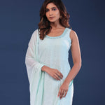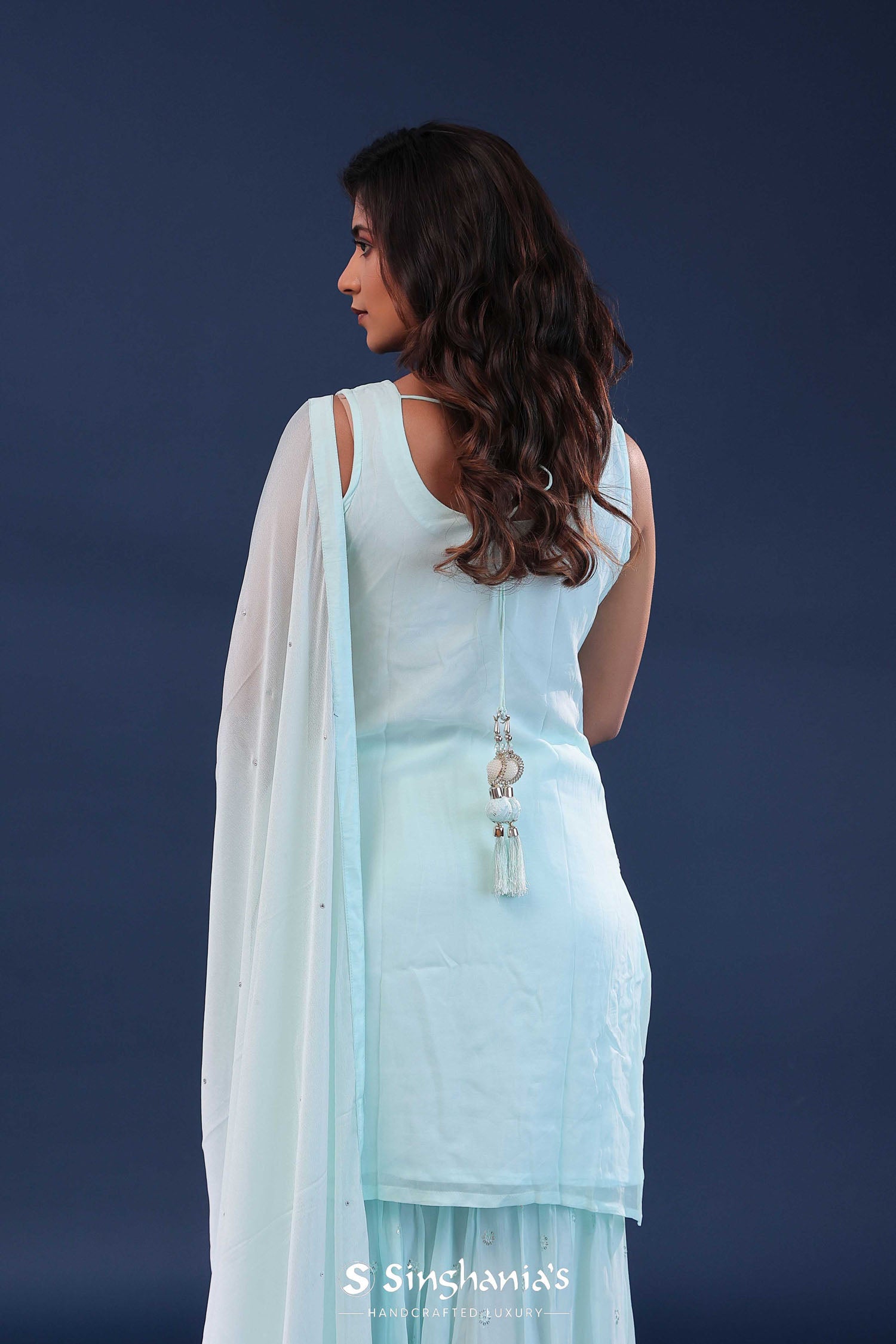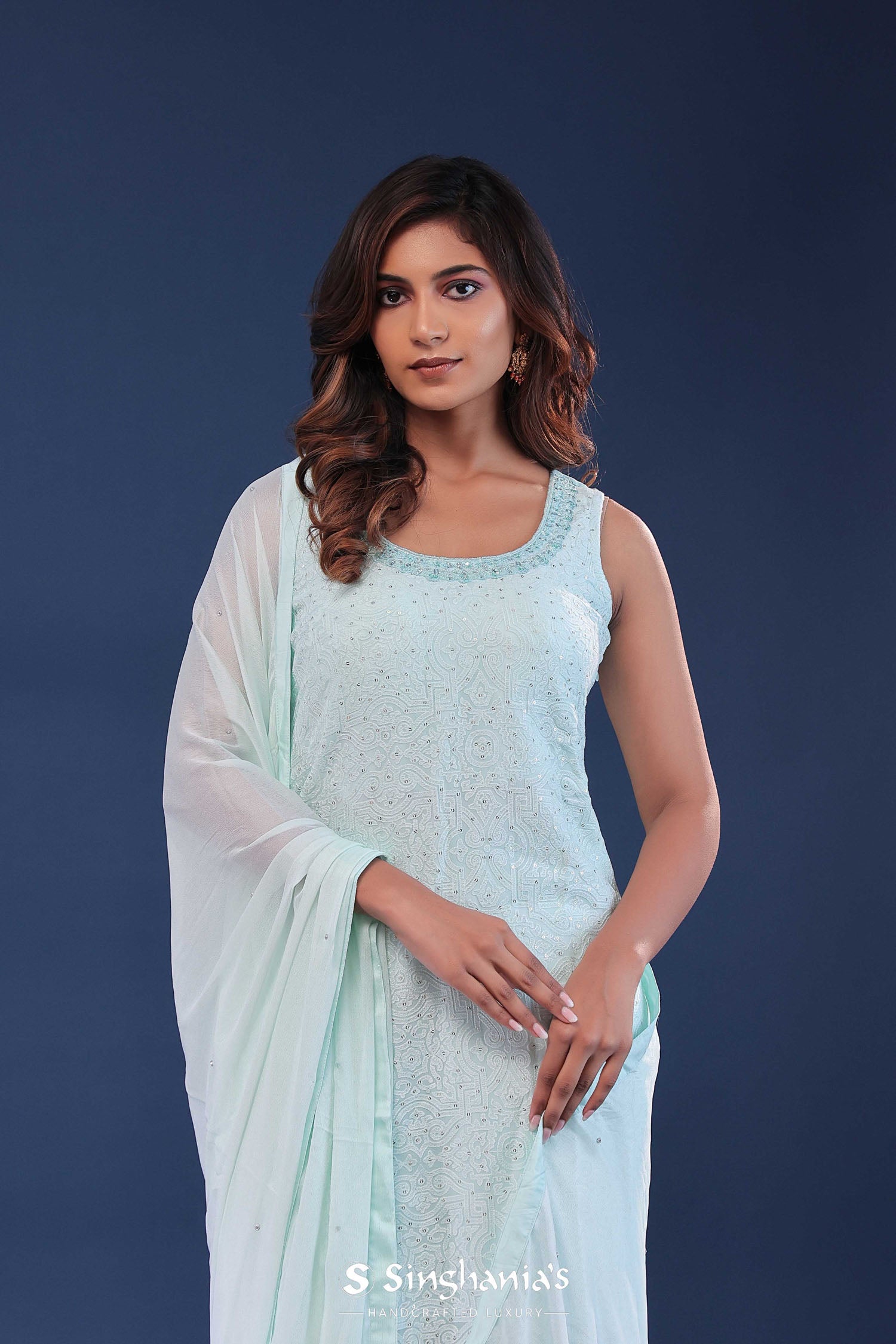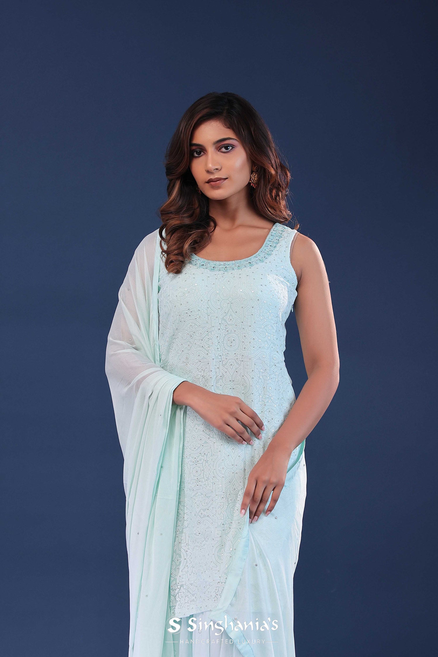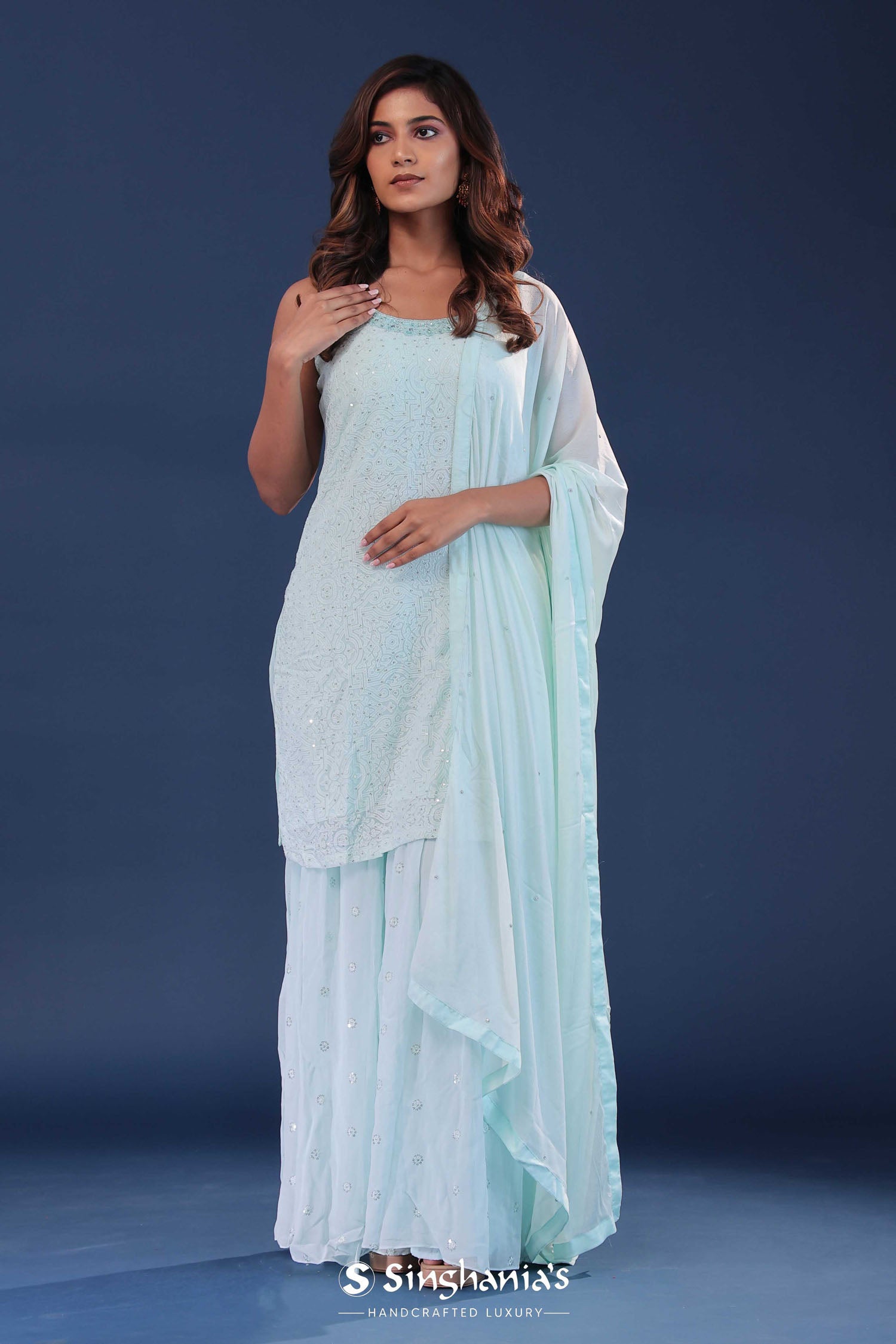 Light celeste blue georgette straight cut palazzo set features sleeveless kurti adorned with abstract design and subtle sequins work along with palazzo pants with sequins butti's . The silk plain dupatta adds the finishing touch to the this elegant garment.