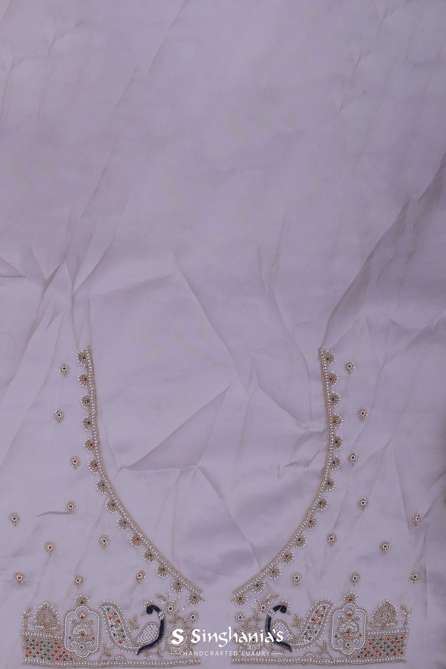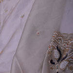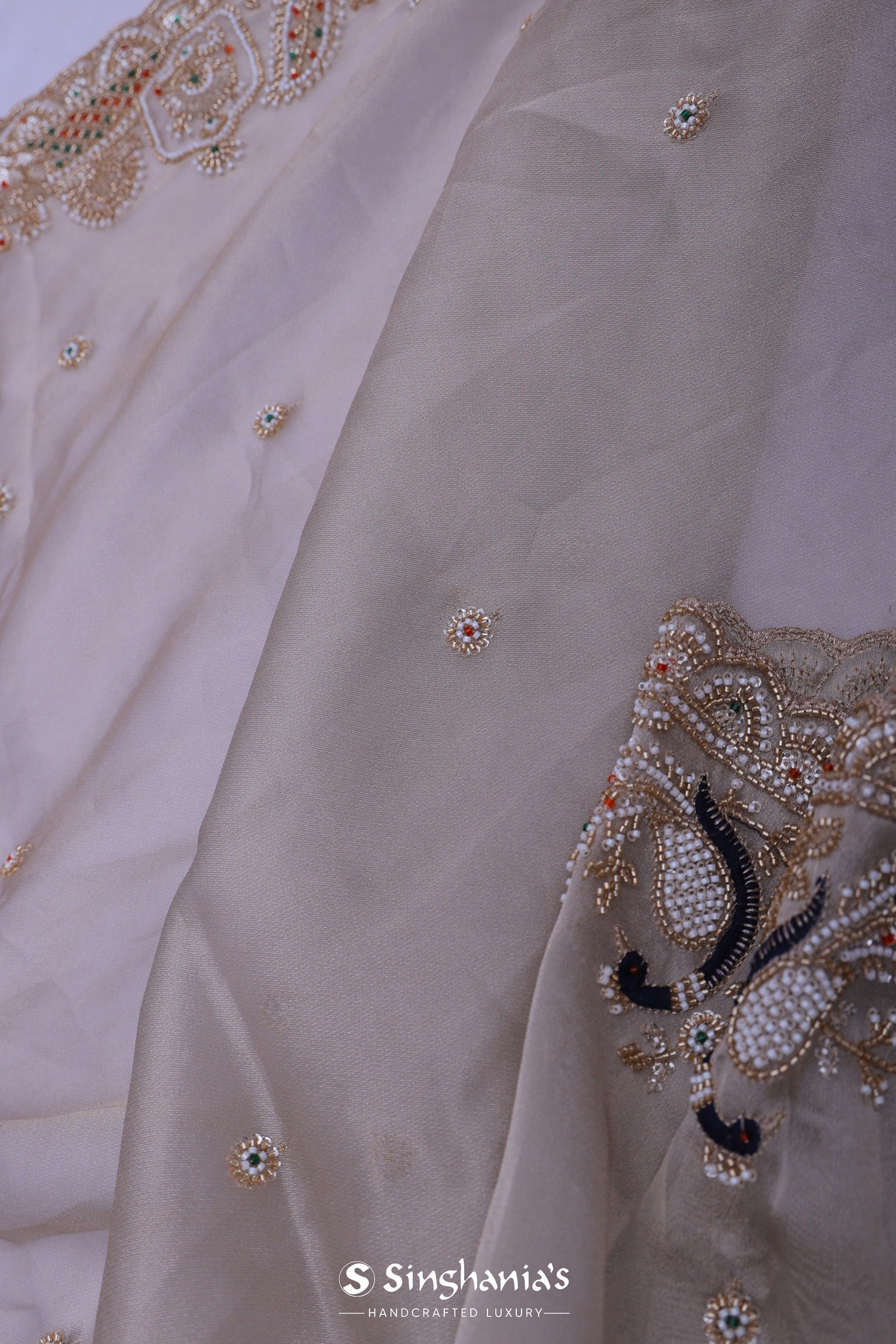 Light cream gray organza tissue saree features butti's formed with beads spread all across the saree along with scallop border embellished with beads forming peacock figure which would light up every moment when you drape yourself with this .