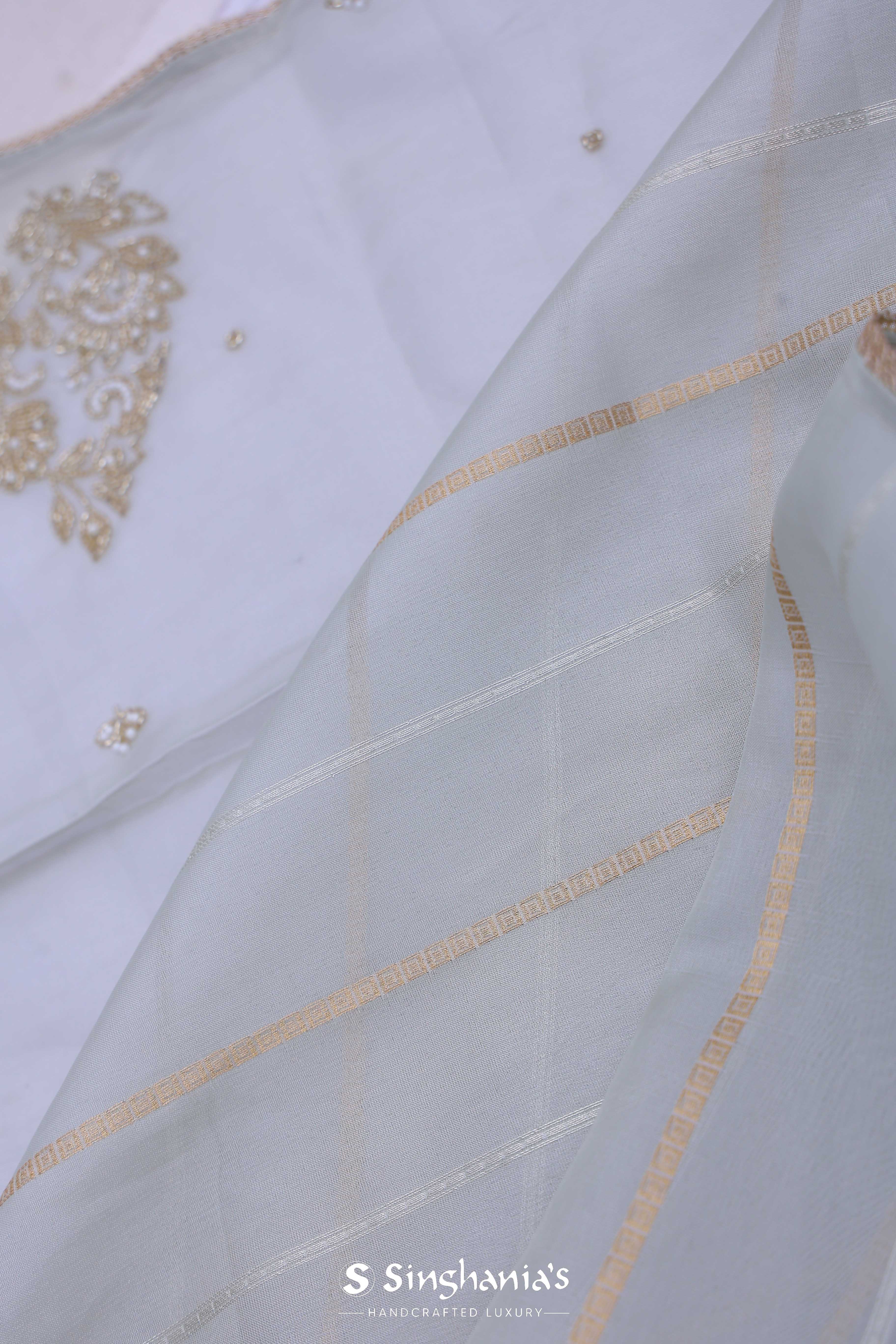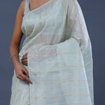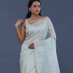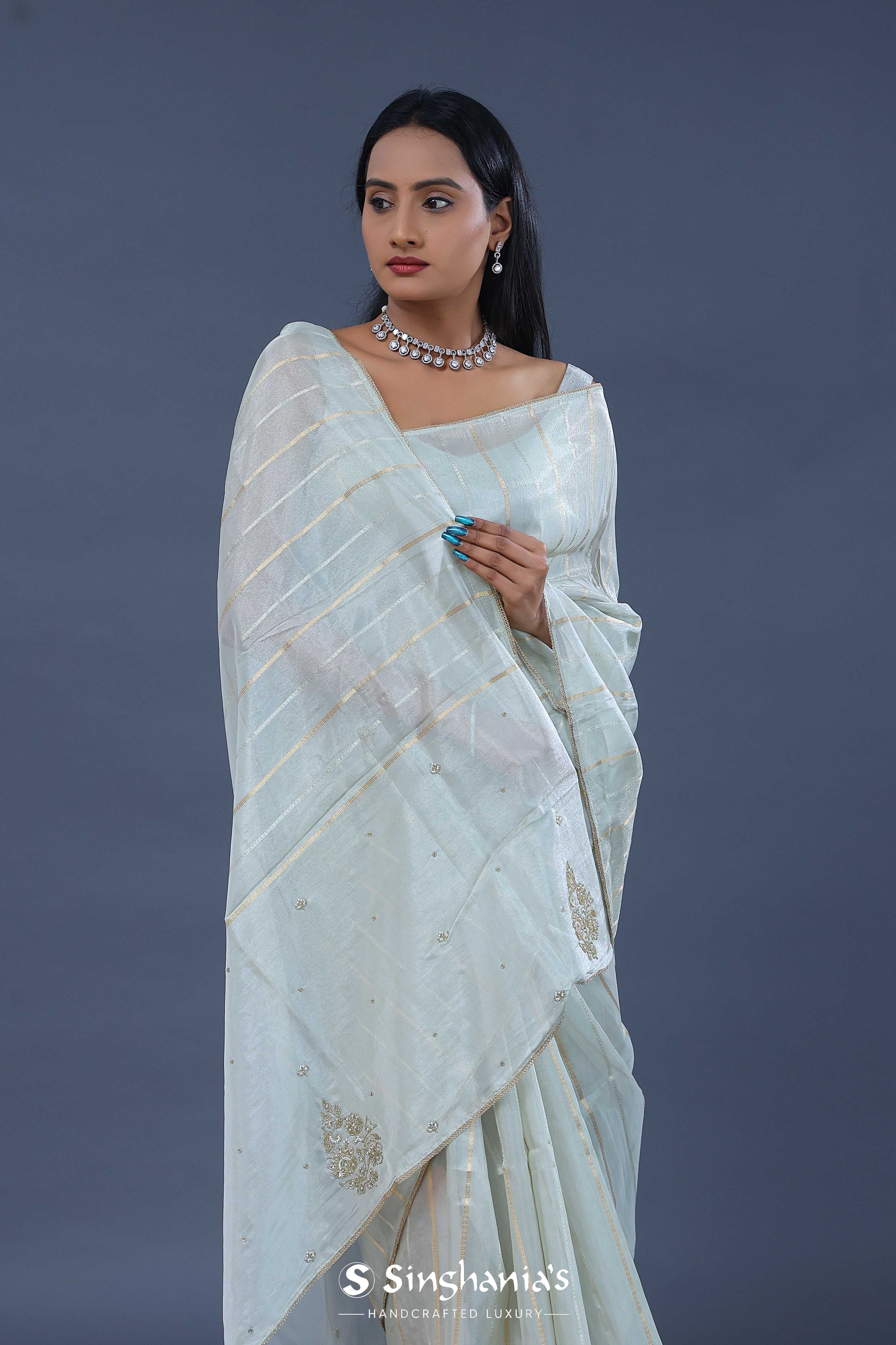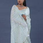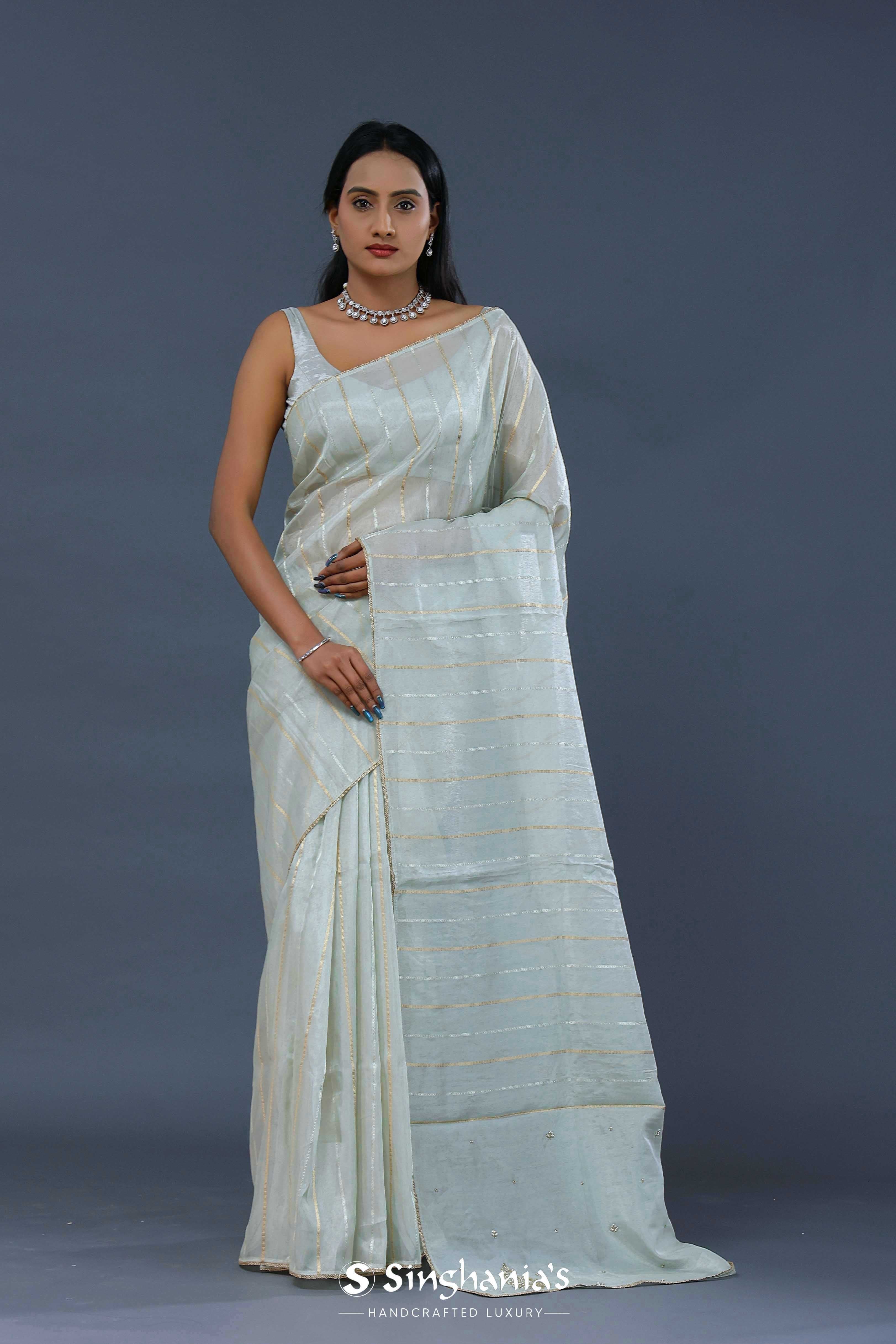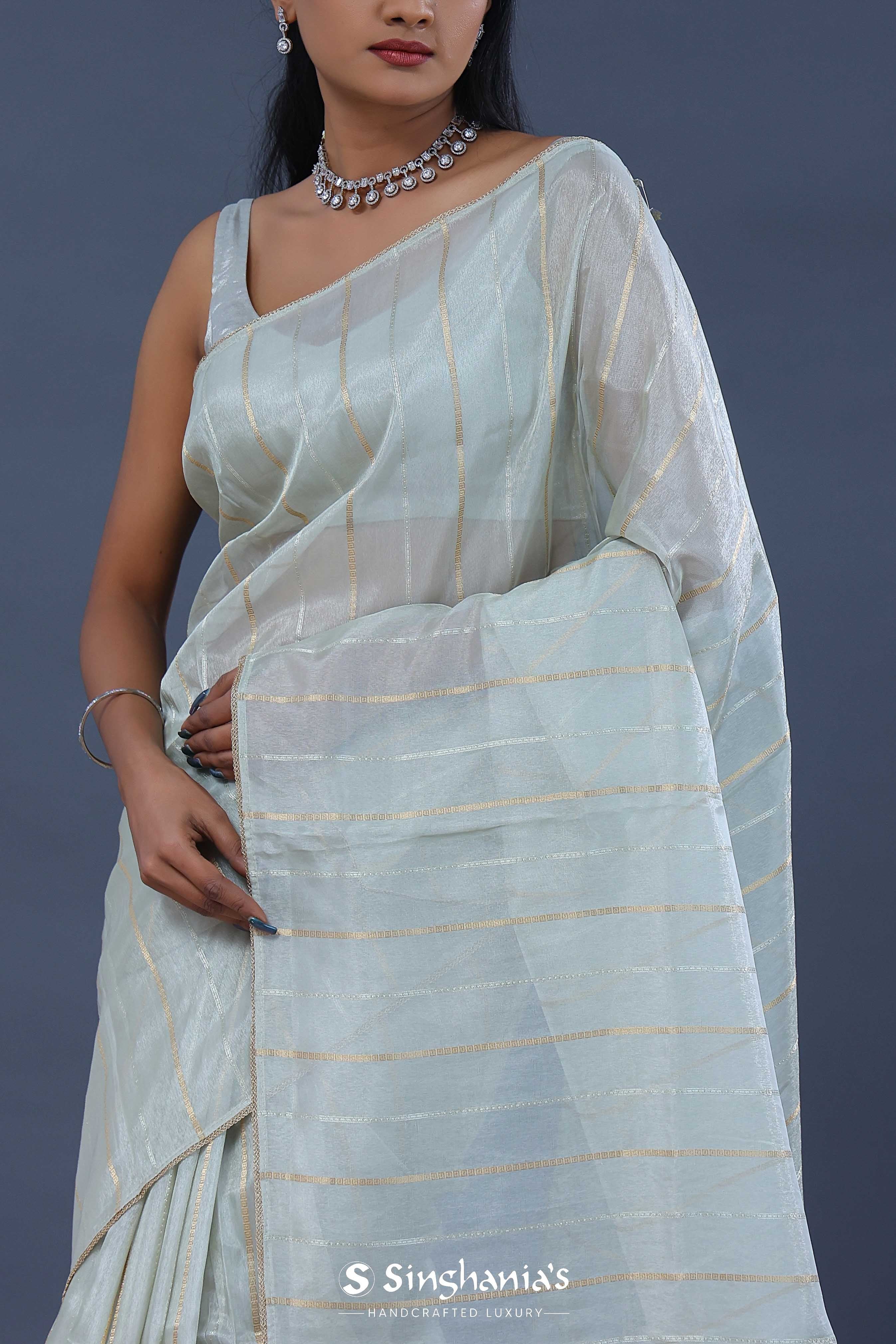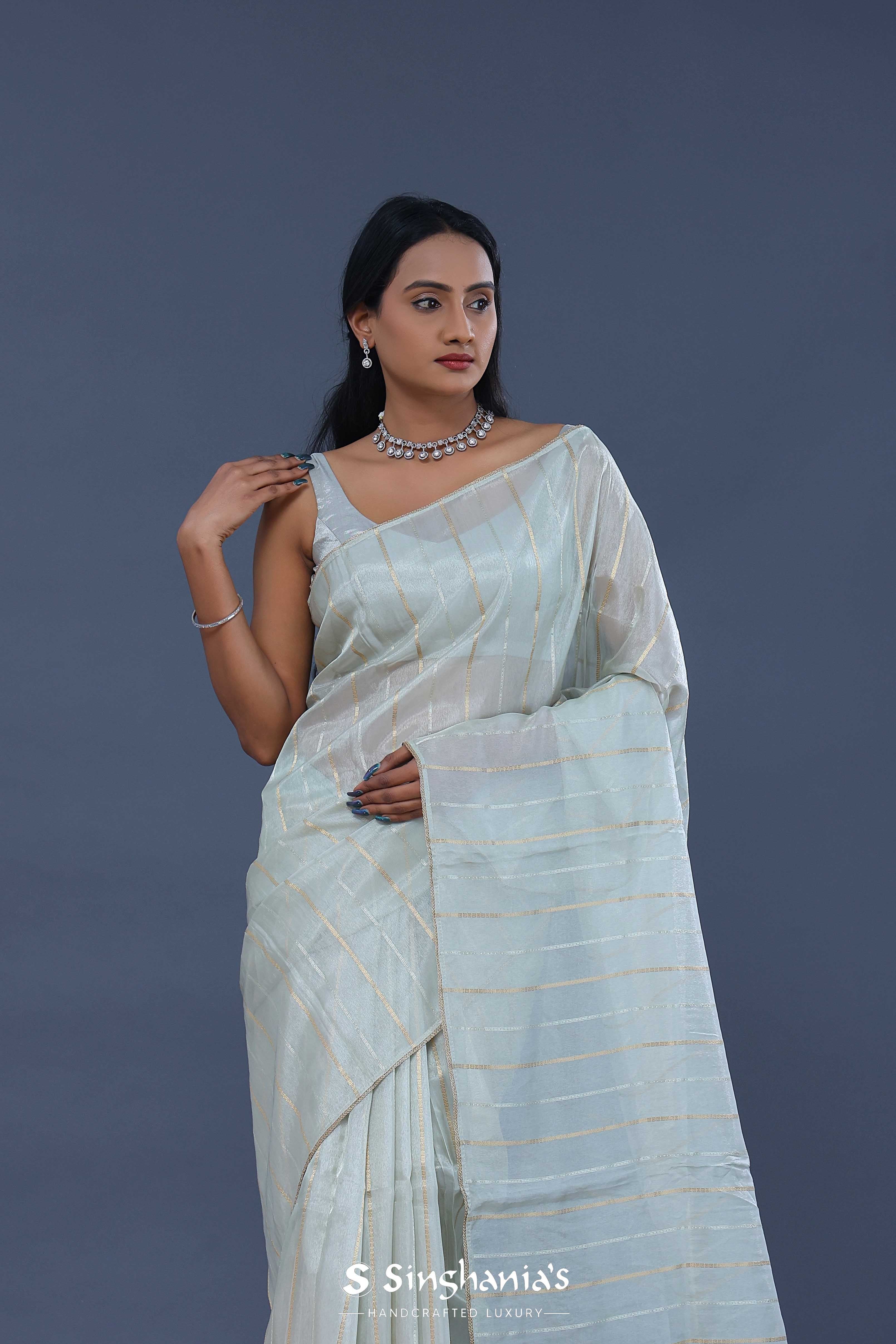This gold and silver zari stripes woven on entire pale green organza tissue saree radiates simplicity and grace by draping it on any classy event.