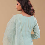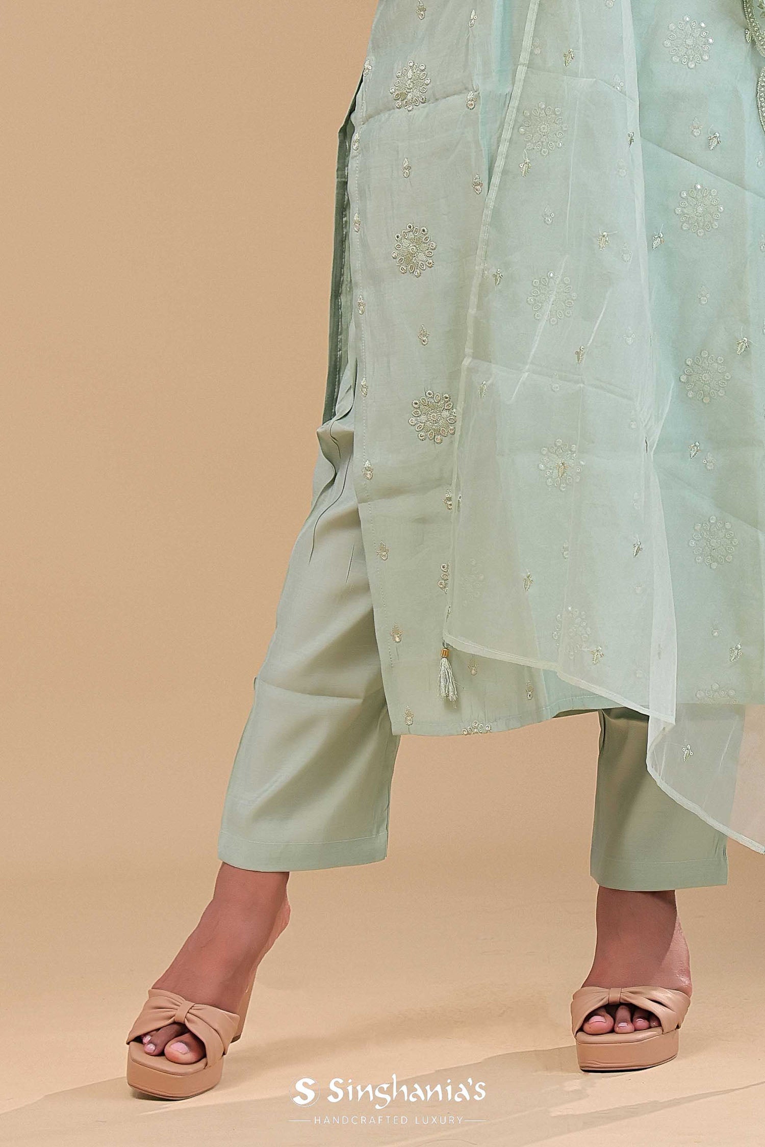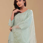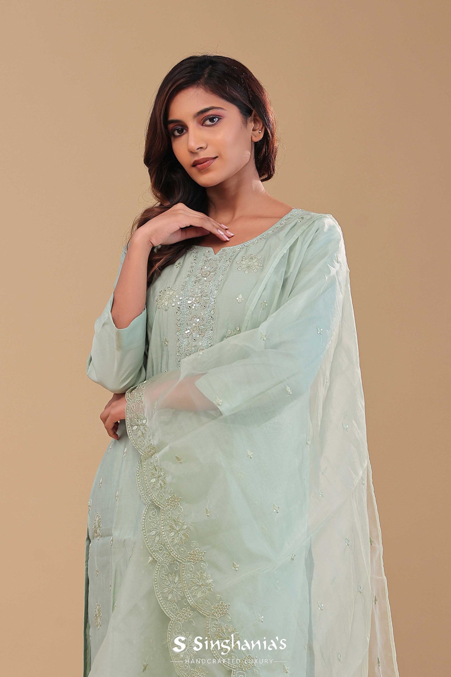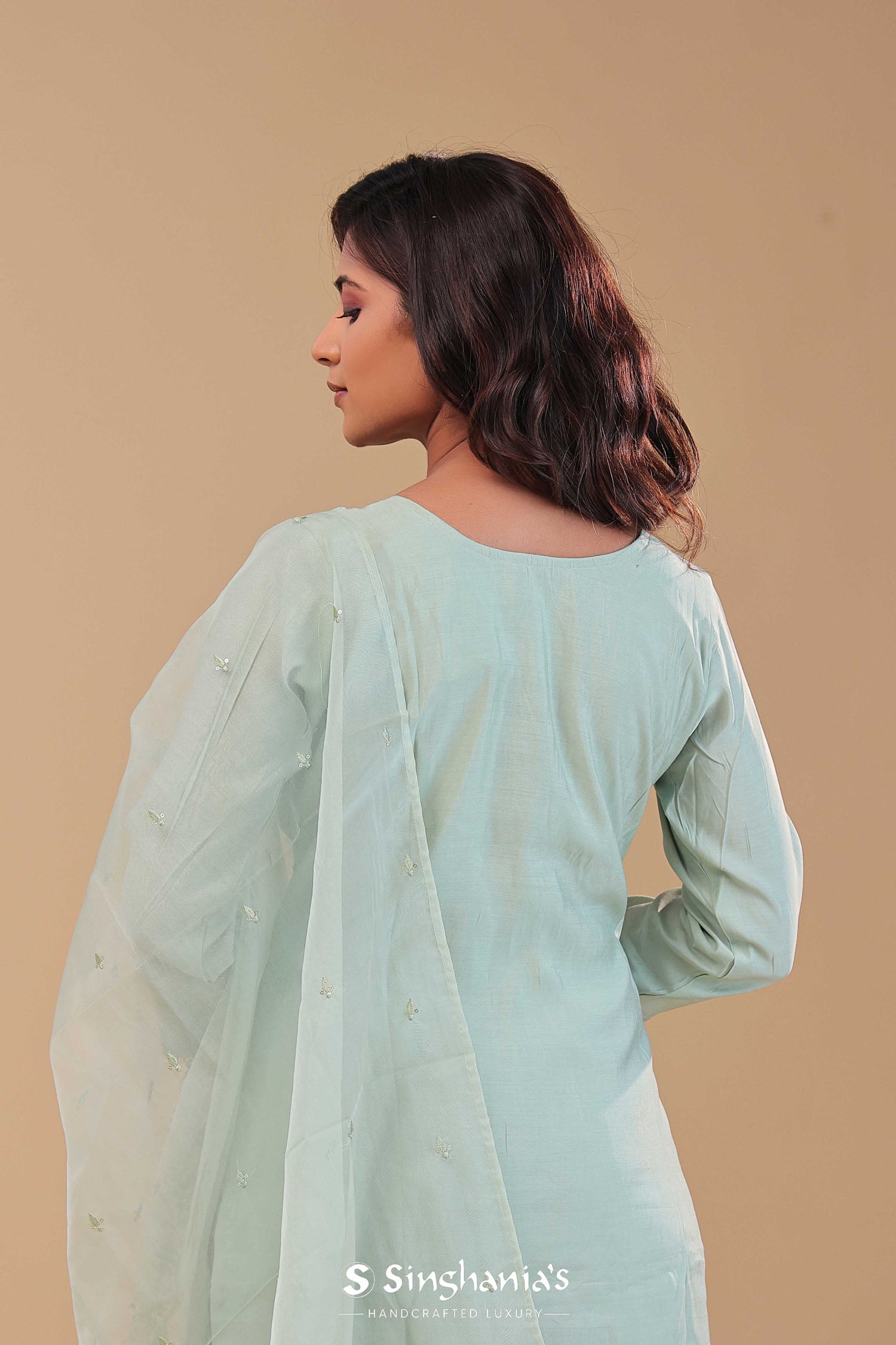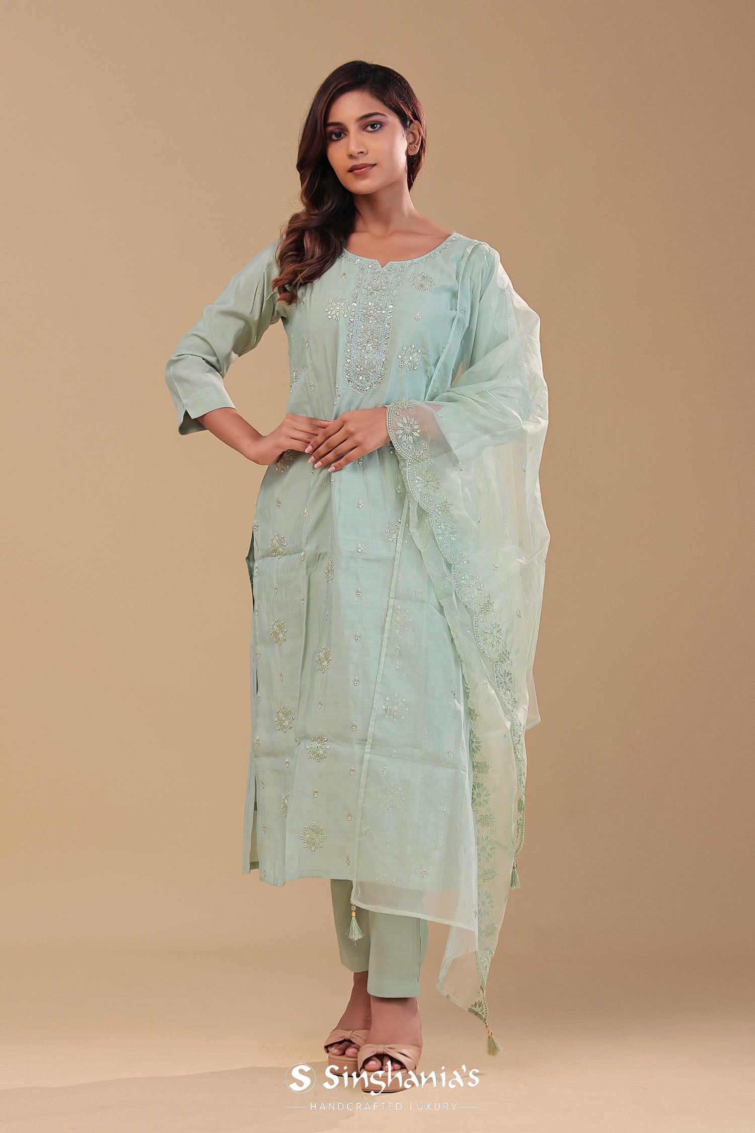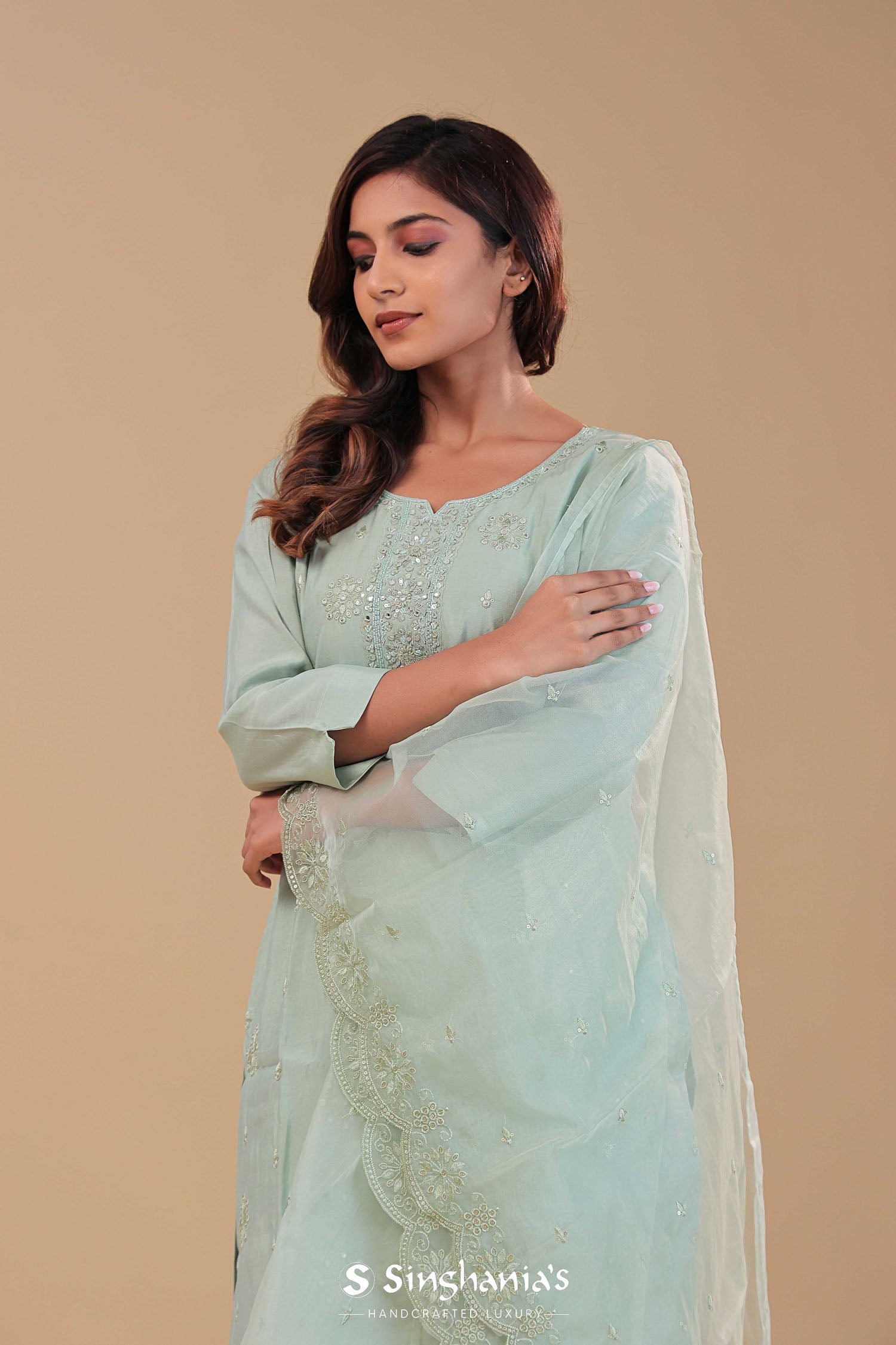 Pale mint green chanderi silk kurta set features mid-forearm sleeves and embroidery work around the neckline and butti's along with straight pant .The organza scallop dupatta adorned with floral embroidery spread across the dupatta