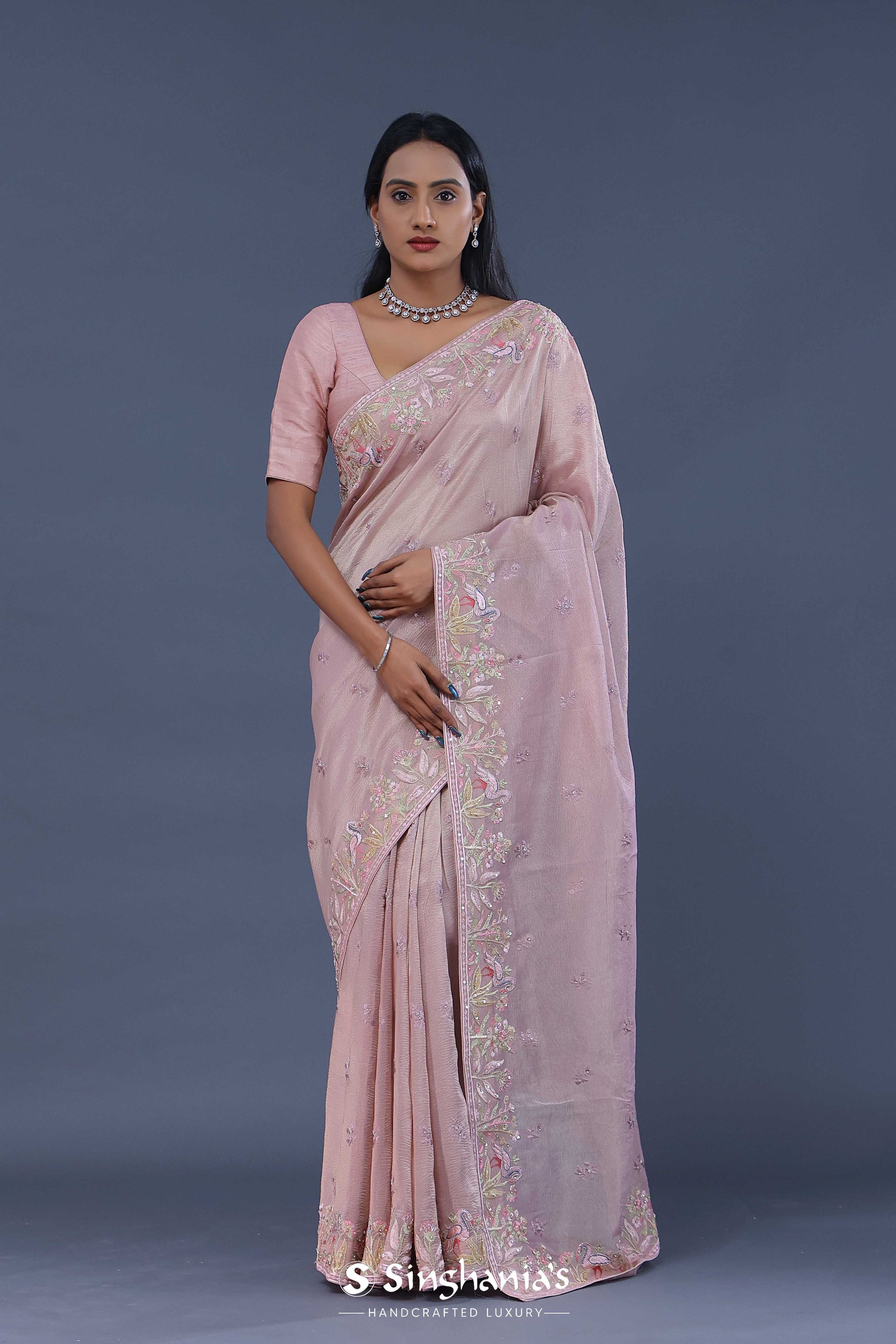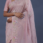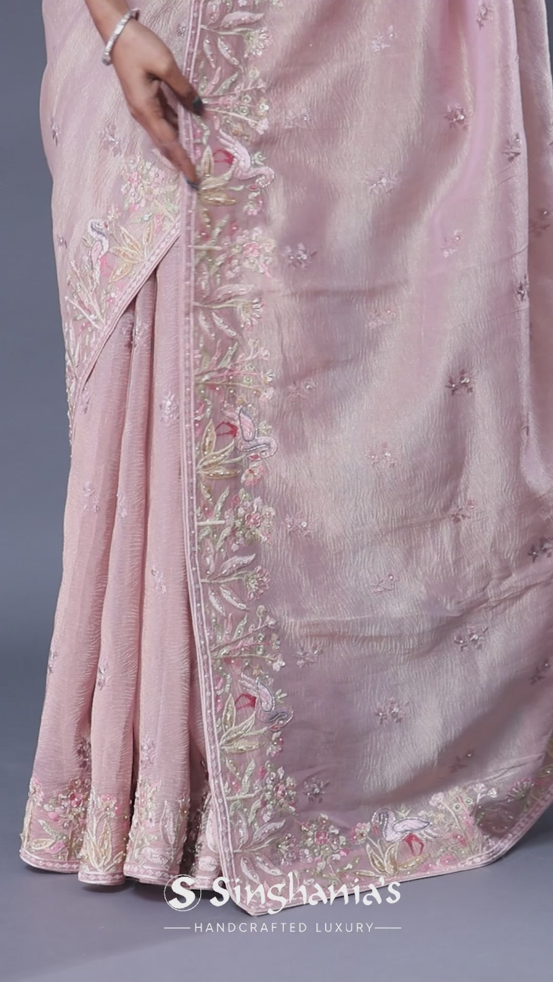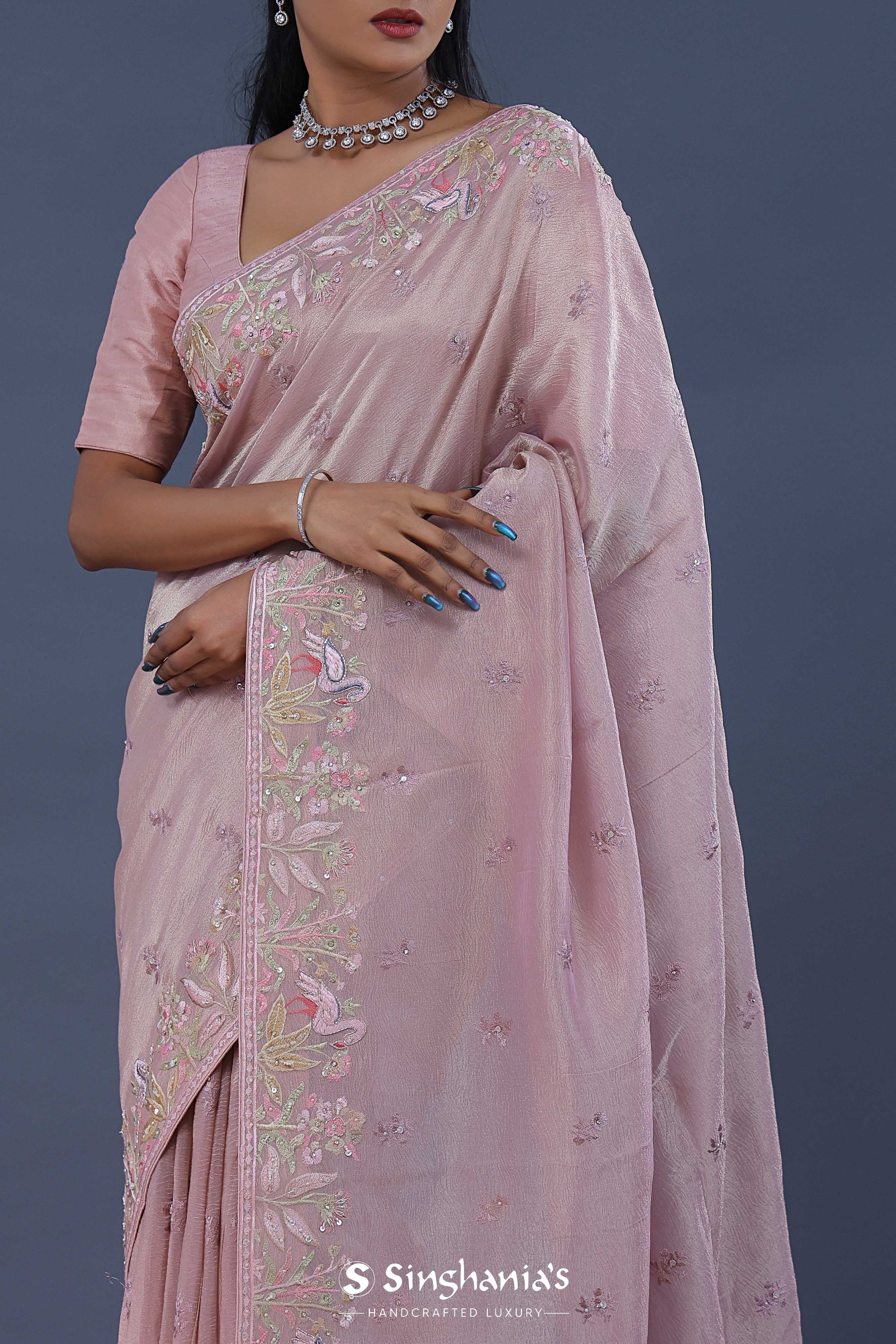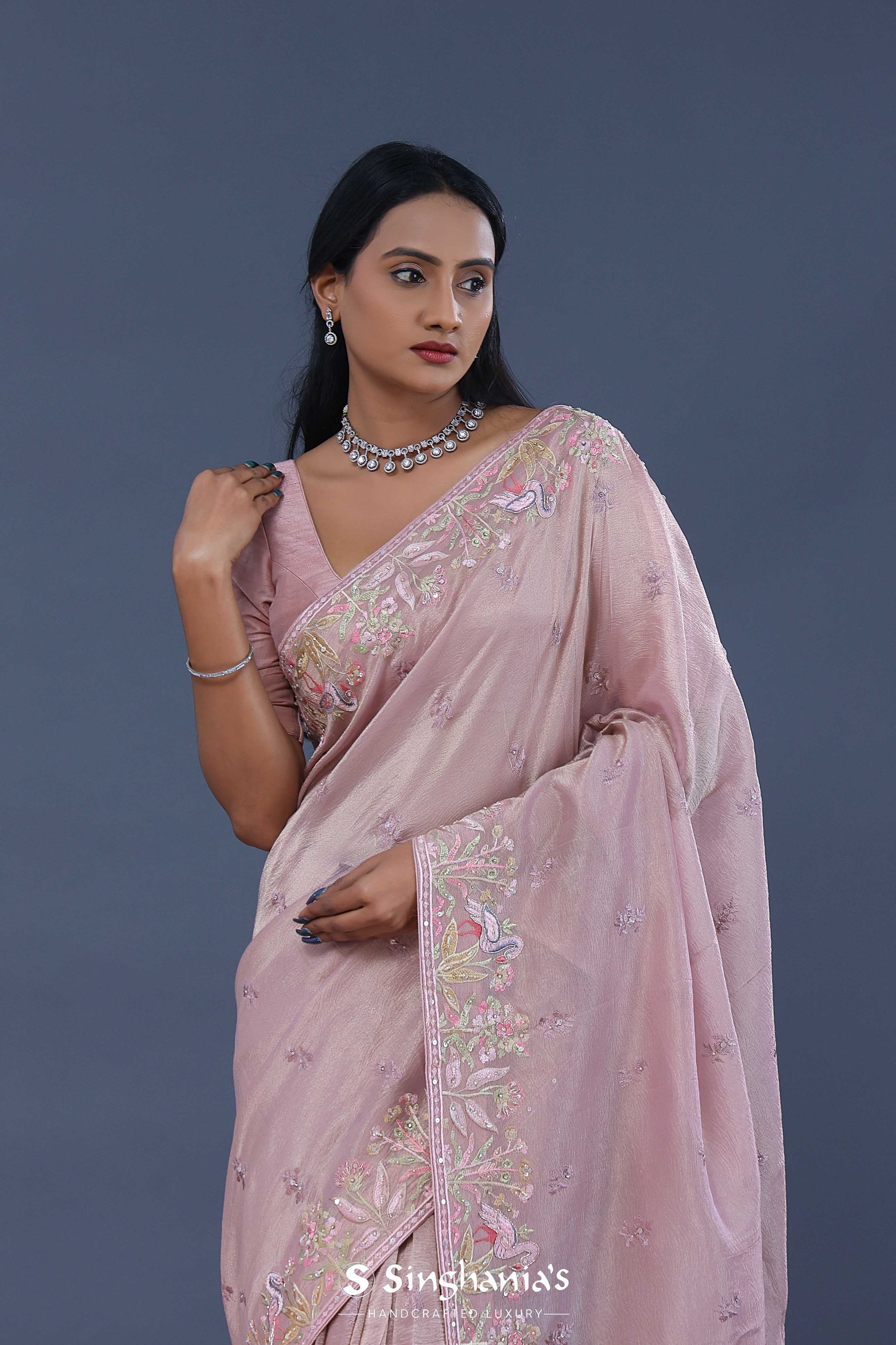 Pastel pink crushed tissue saree with open border which is adorned with floral embroidery is a ideal choice for any occasion.Making you satisfy with each drape.