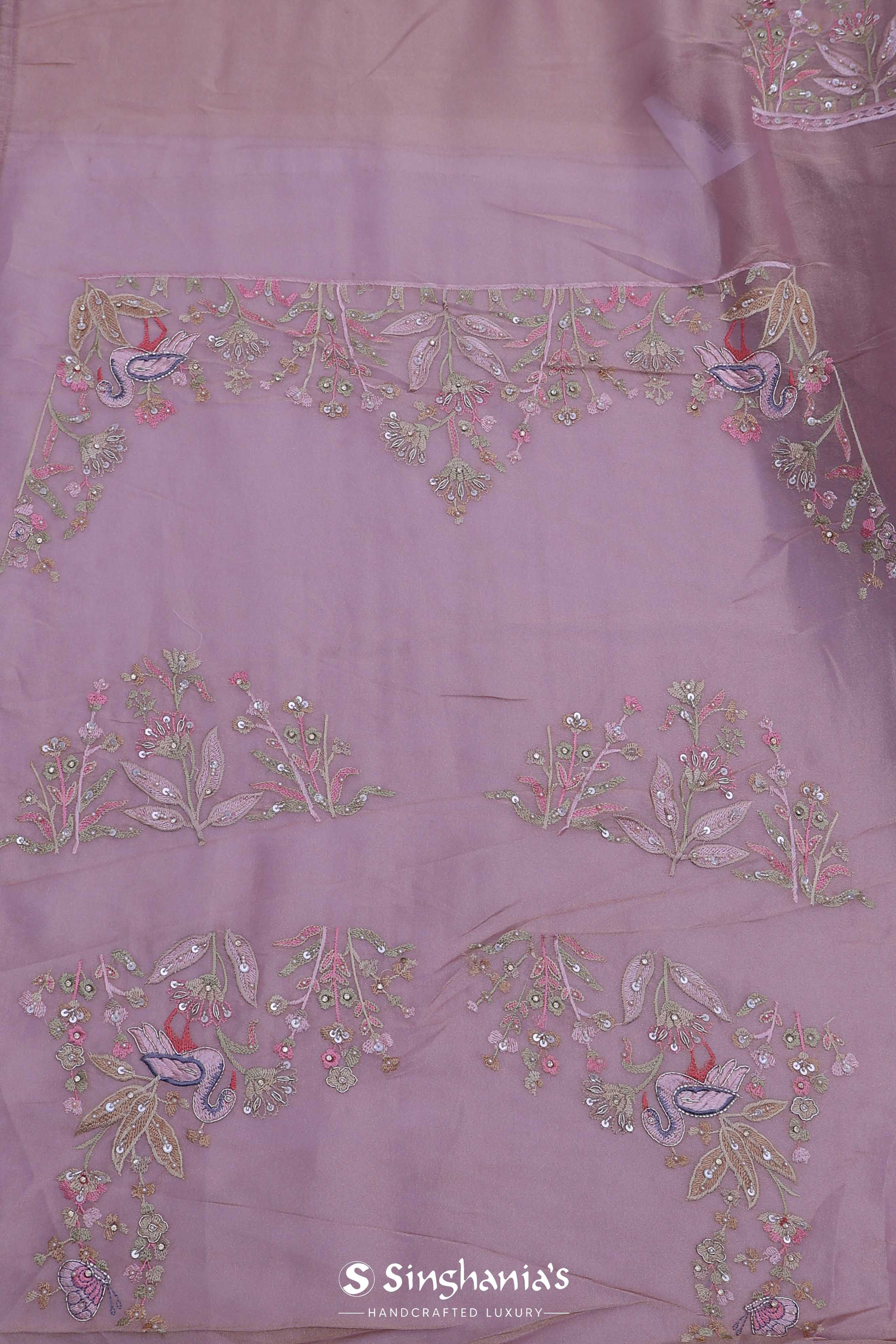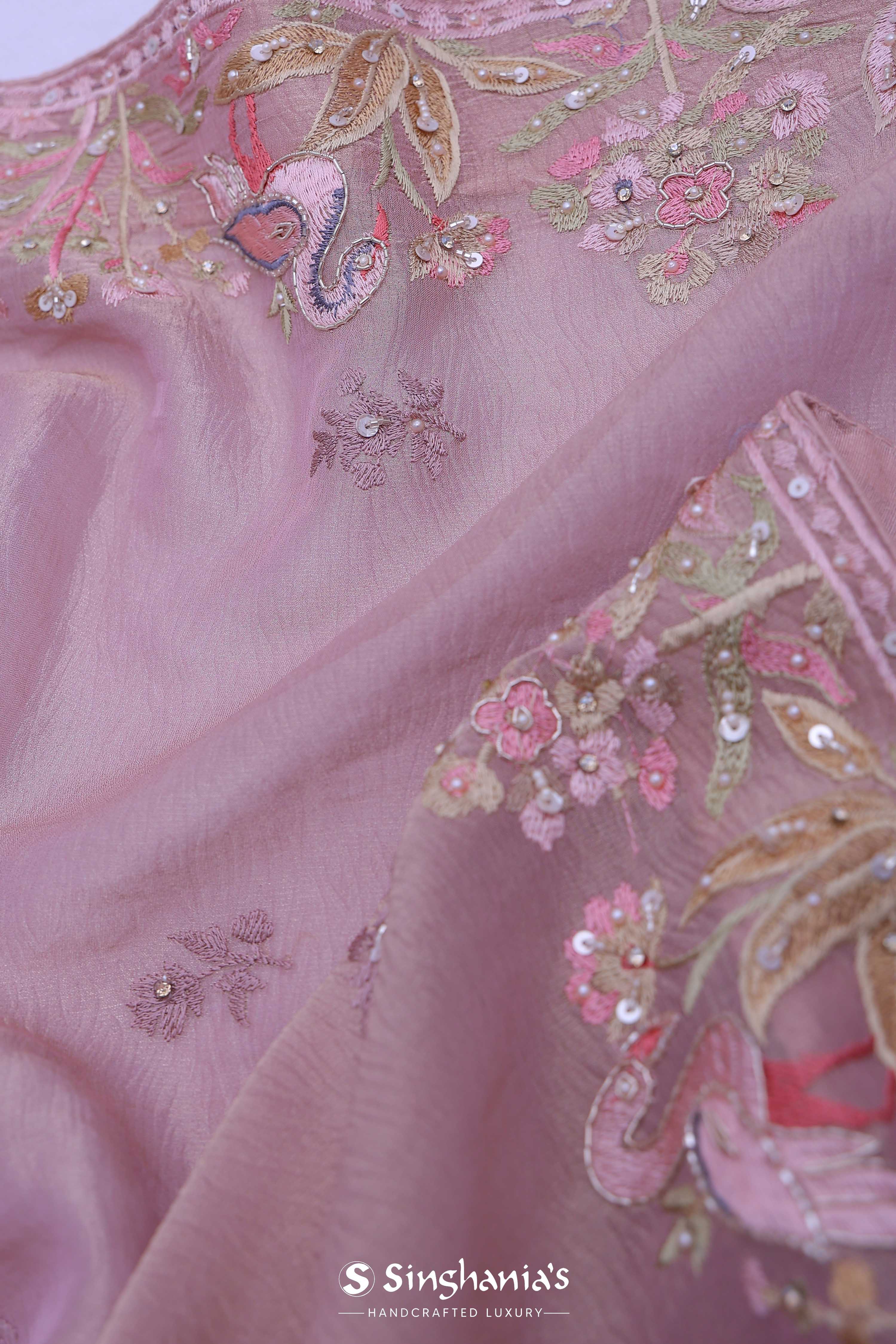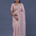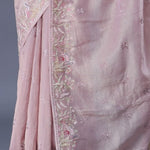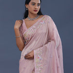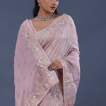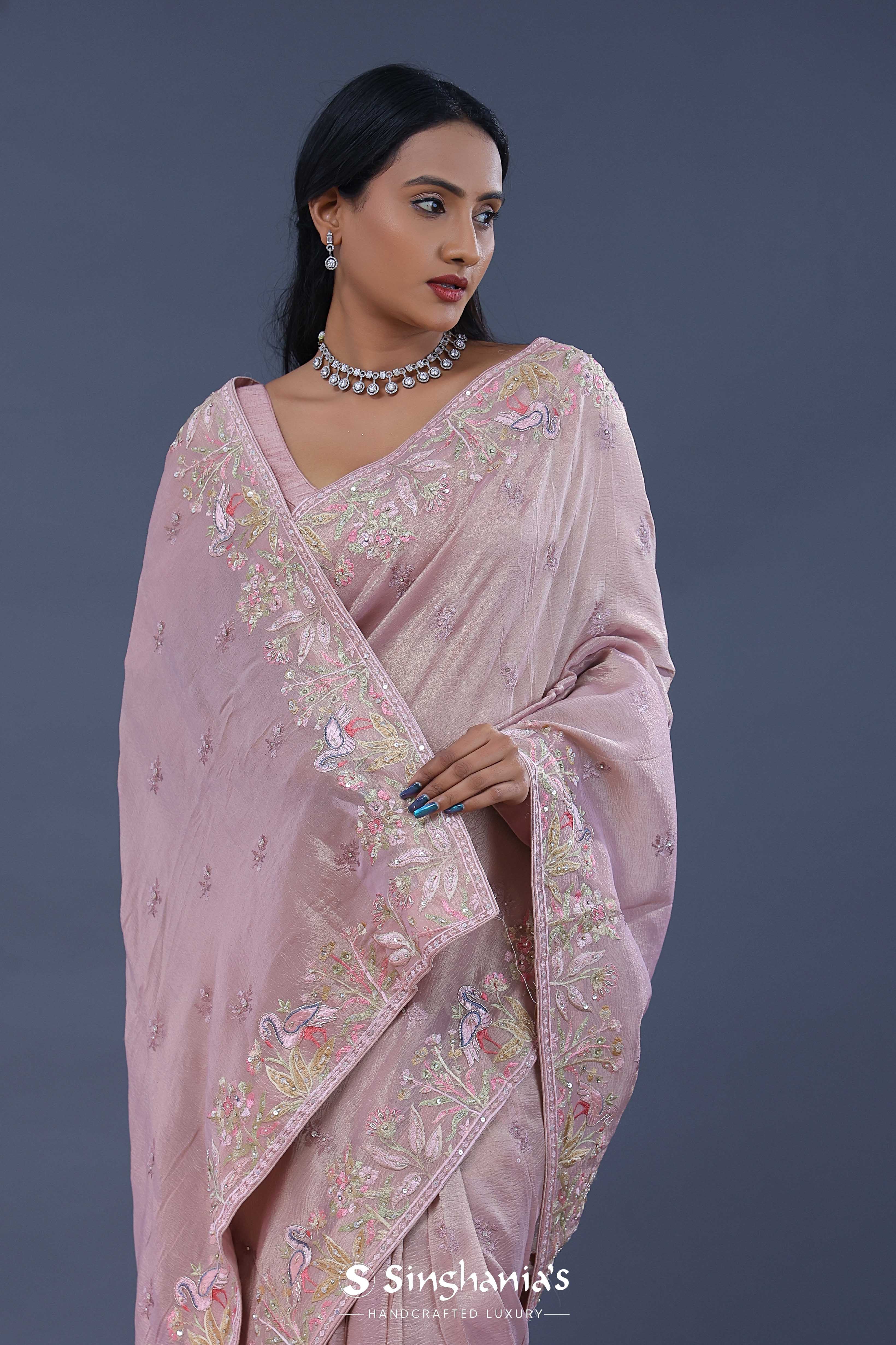Pastel pink crushed tissue saree with open border which is adorned with floral embroidery is a ideal choice for any occasion.Making you satisfy with each drape.