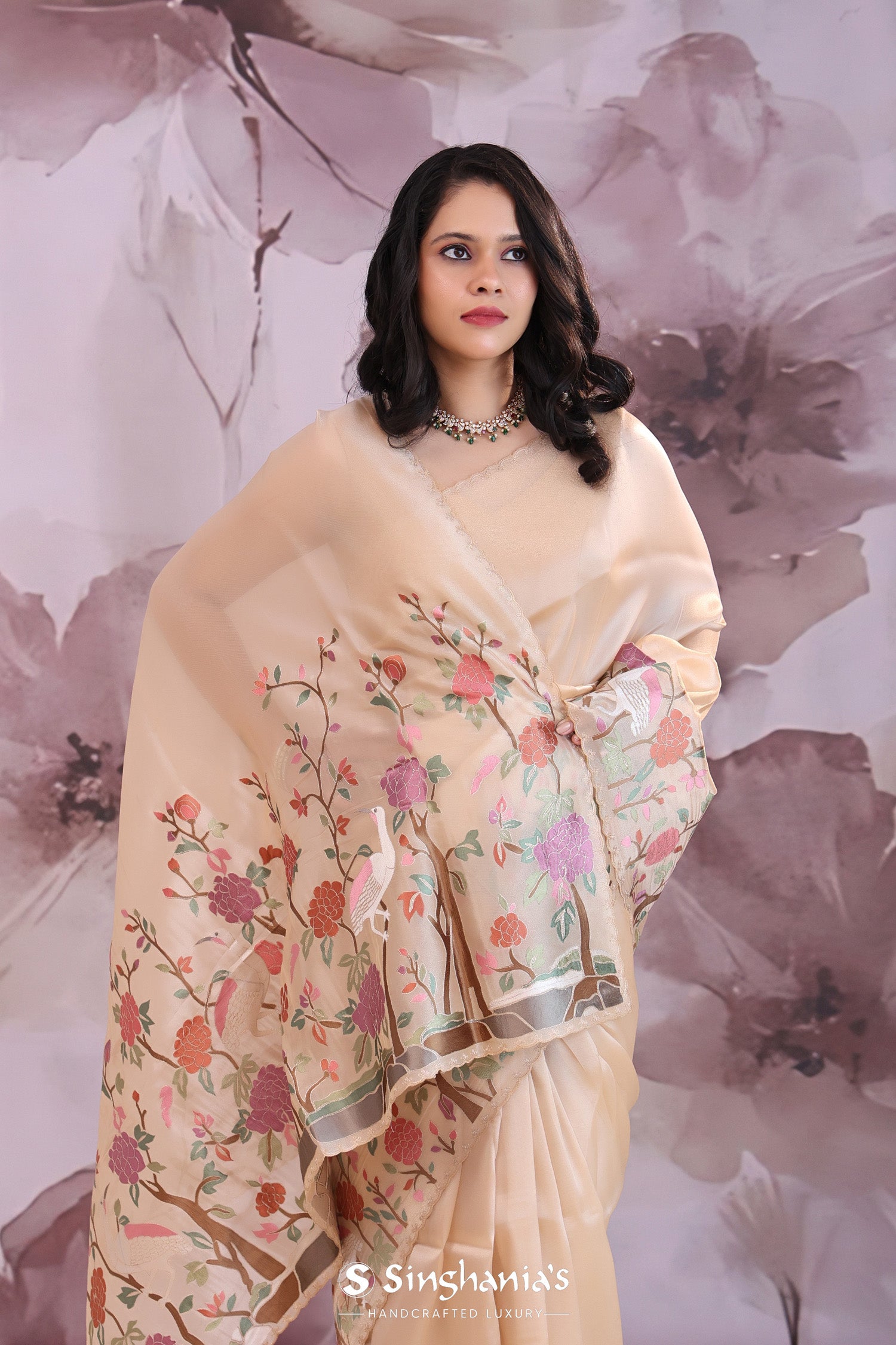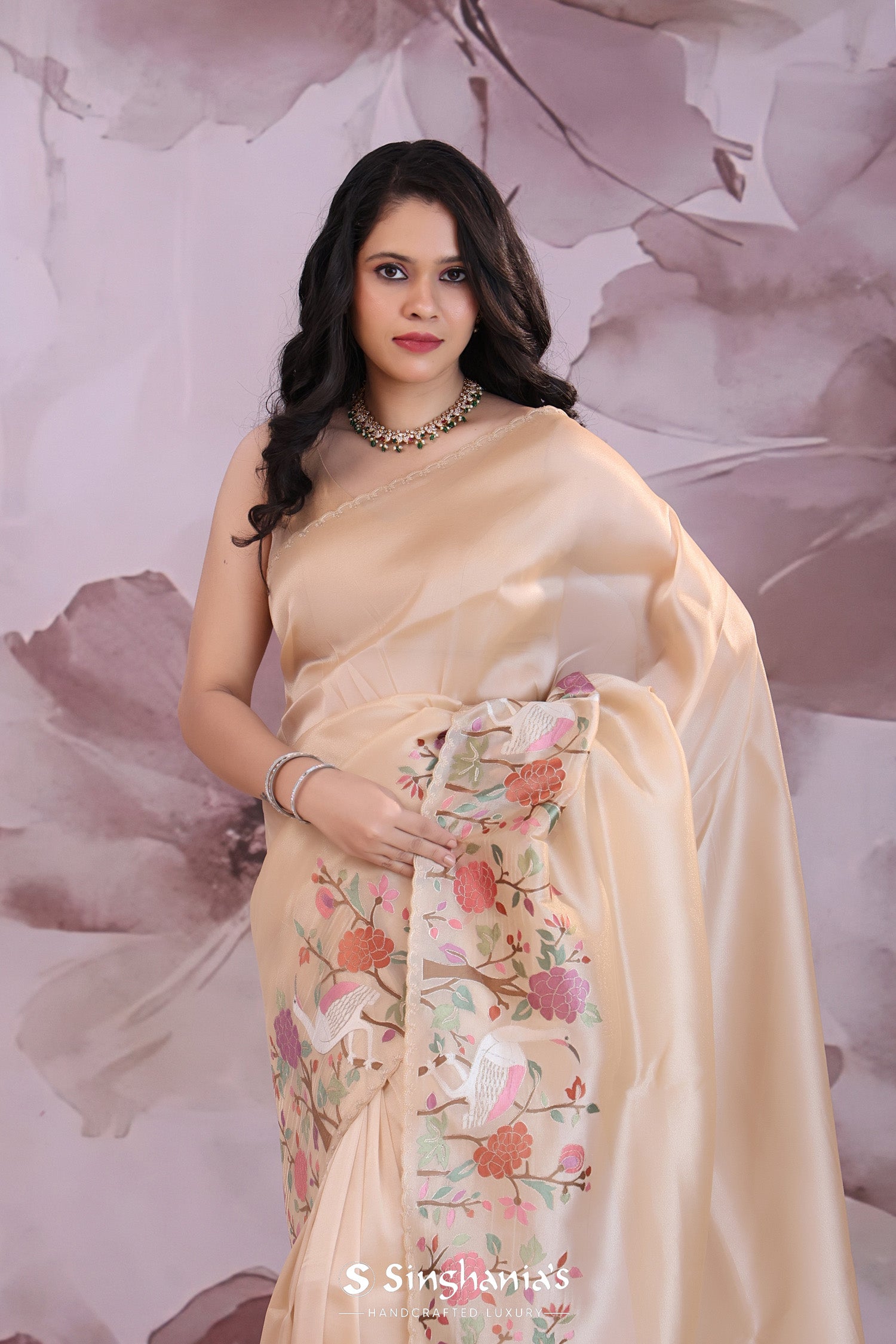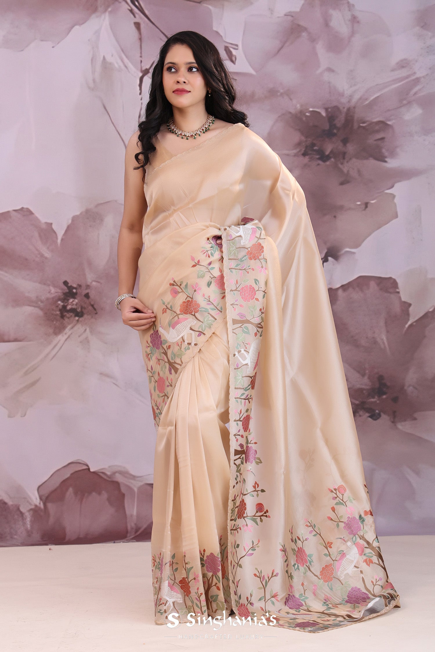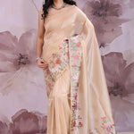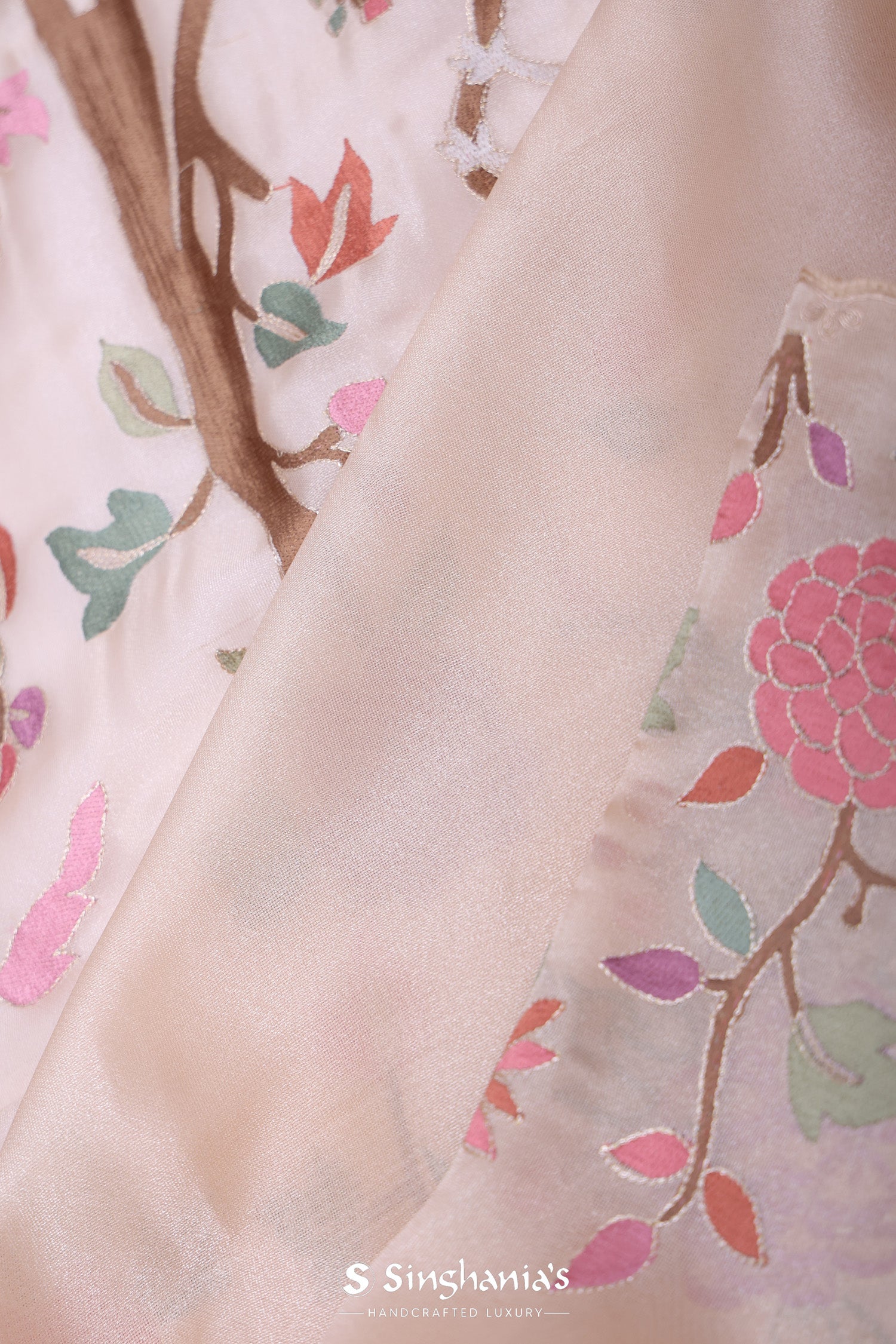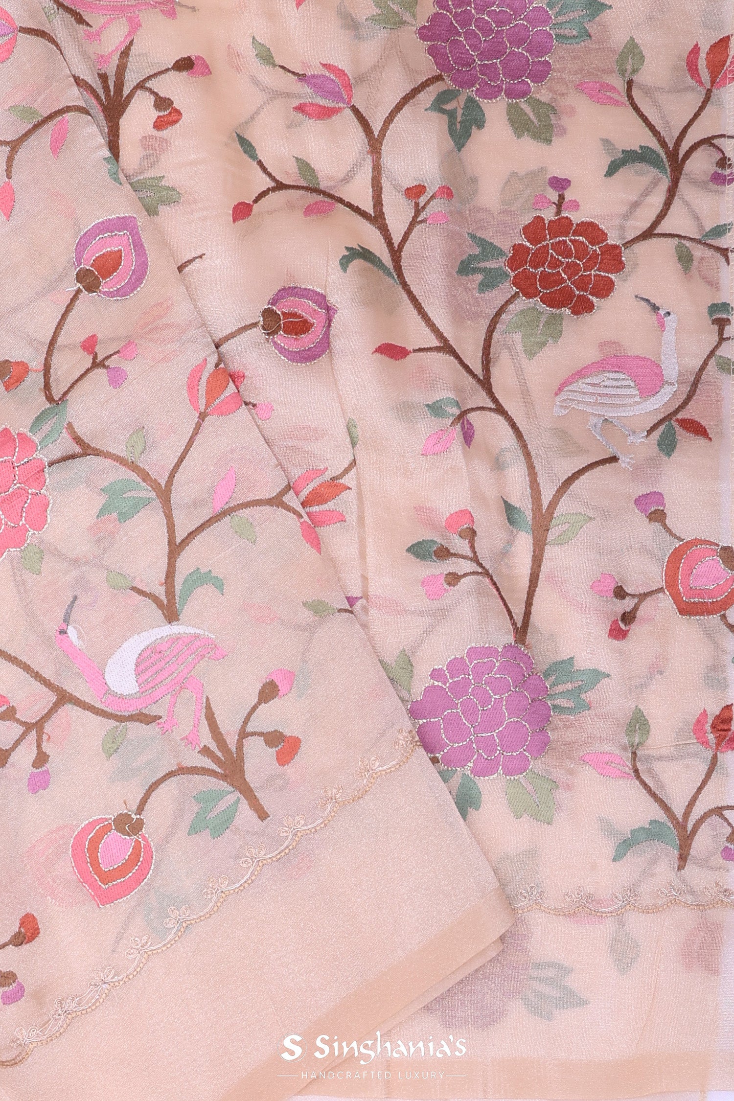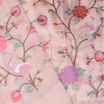 This elegant Pink beige tissue saree features embroidery work forming trees and swan figures all along the border and on pallu making every moment picture perfect.