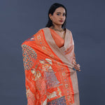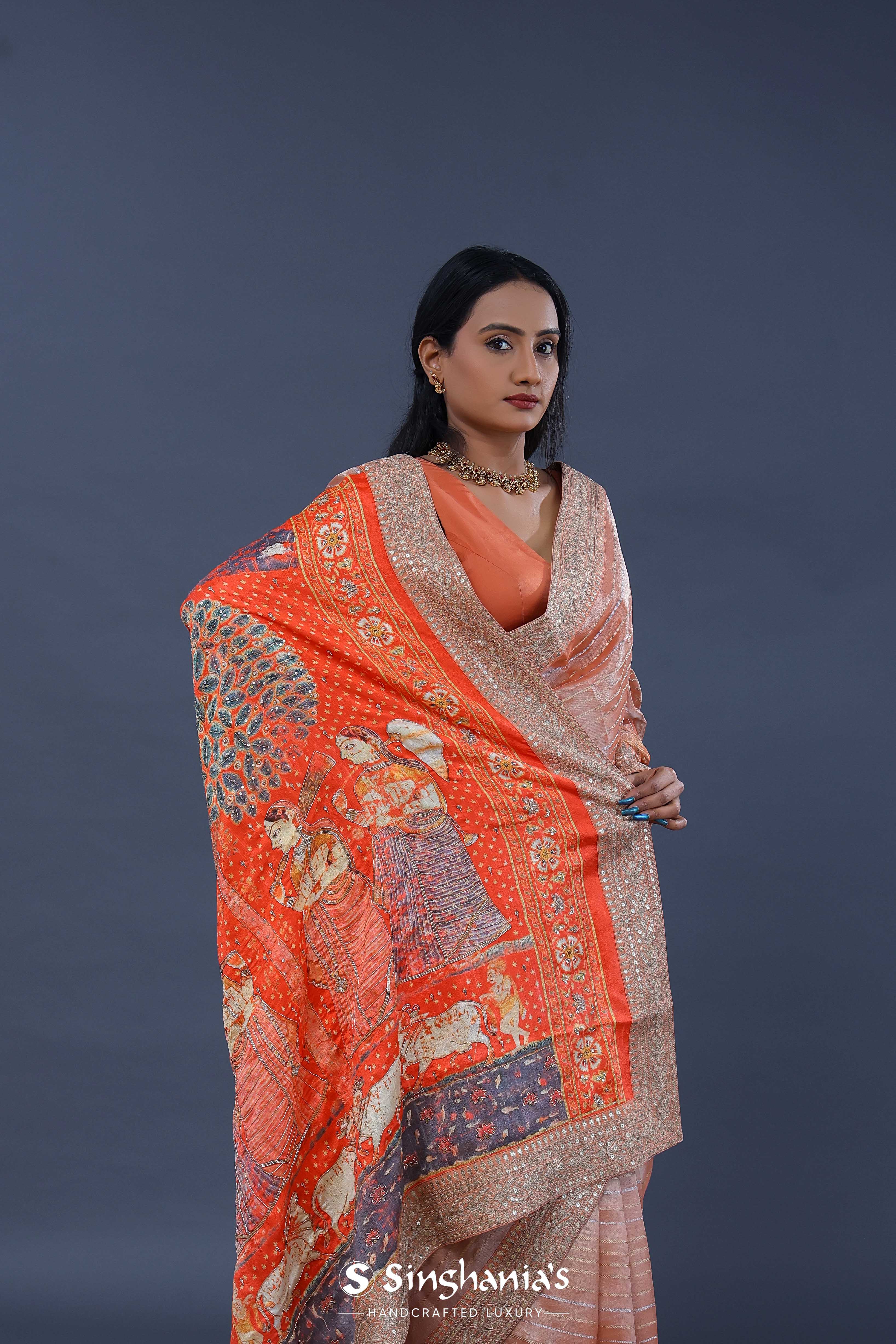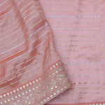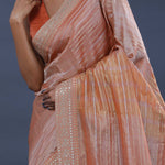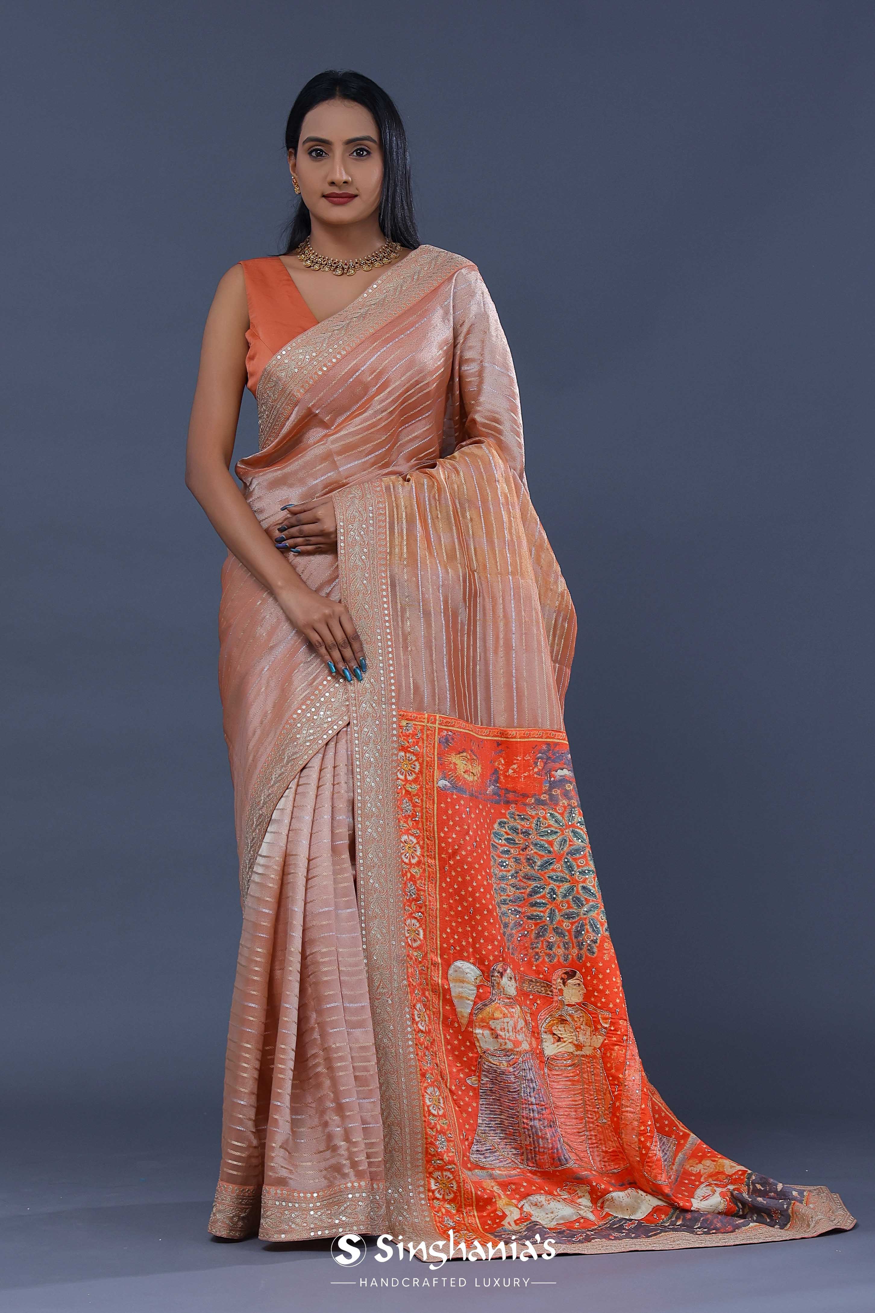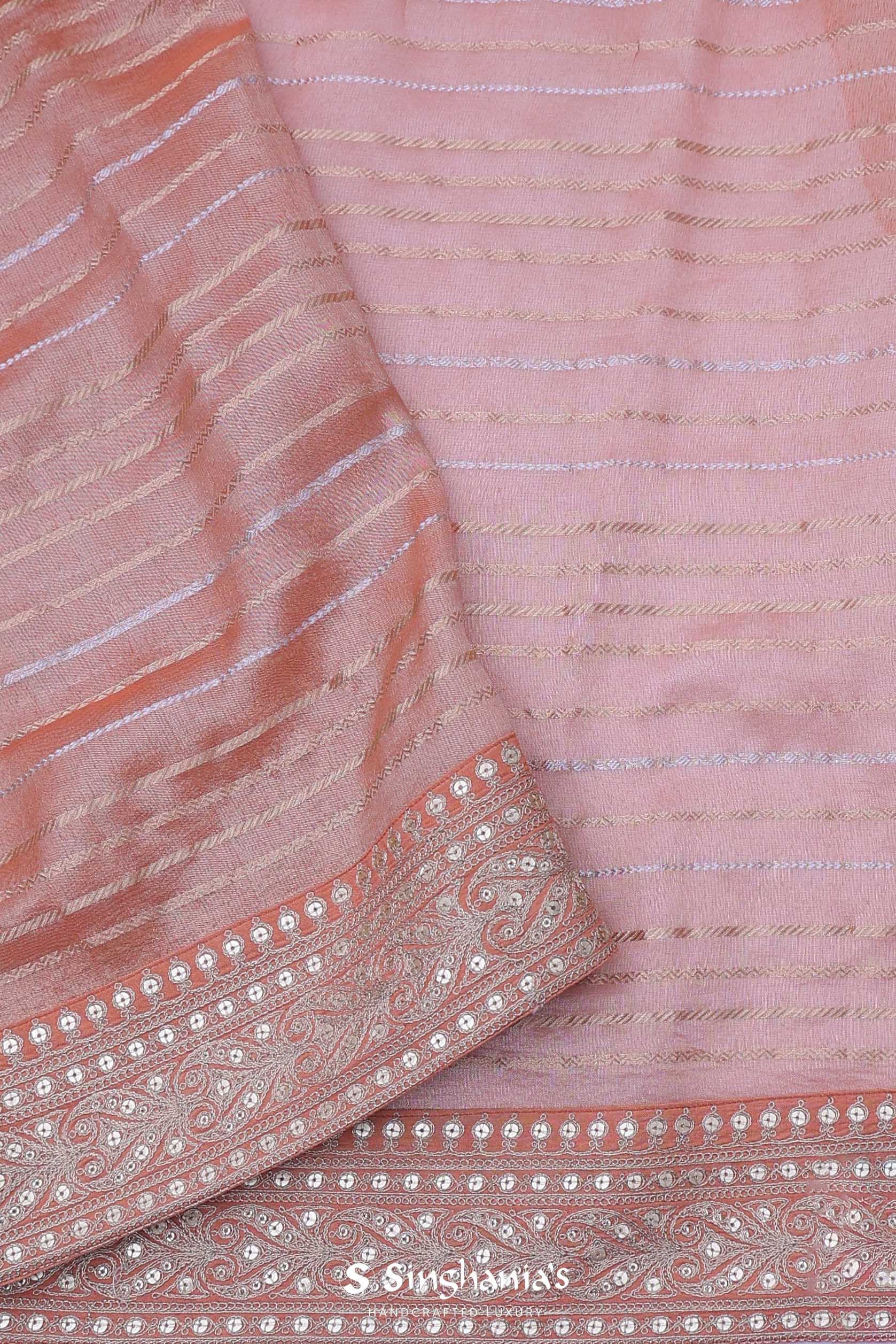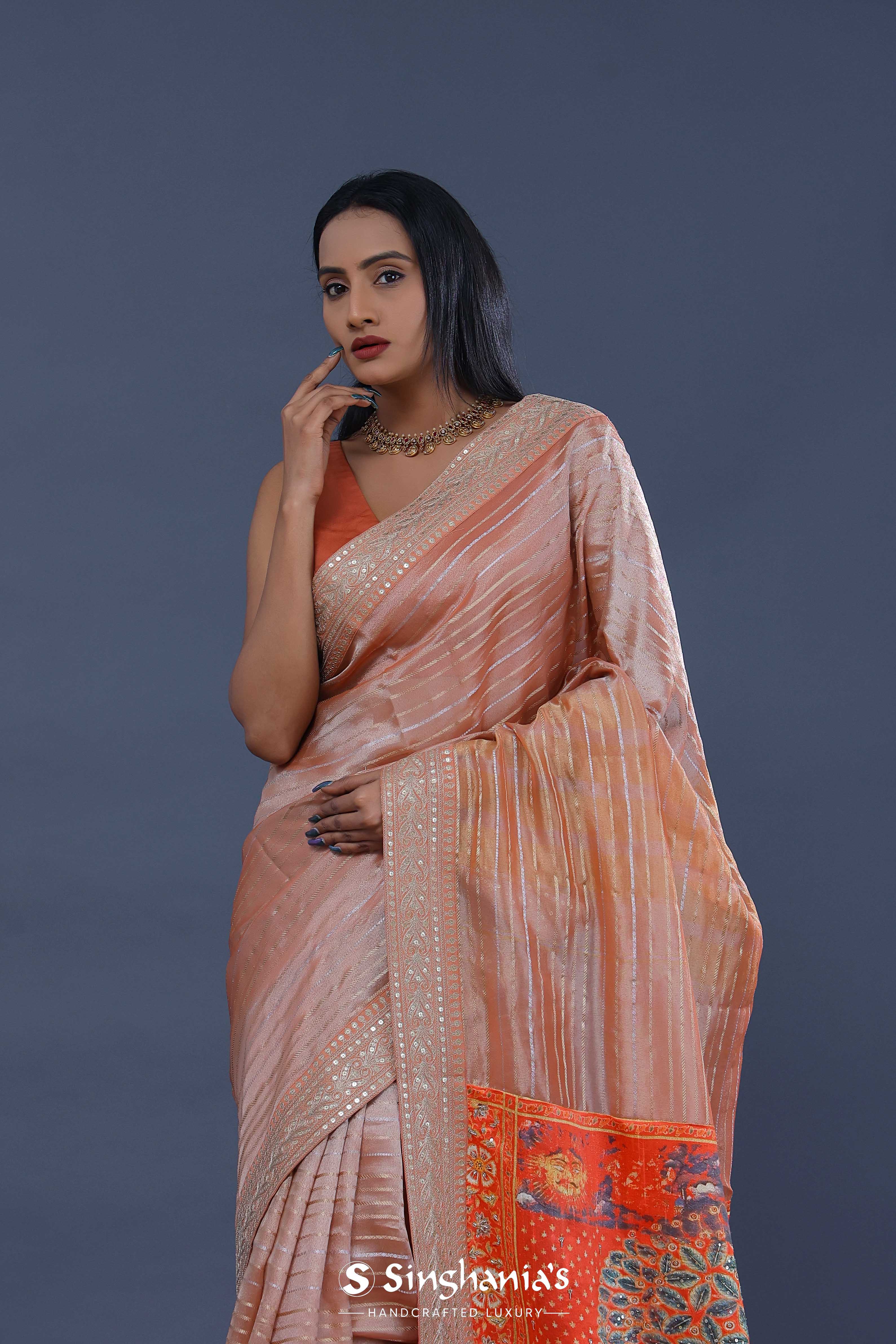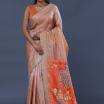 This lightweight and flowy pinkish brown fancy tissue saree and comfortable to drape adorned with embroidery border and vertical stripes of gold and silver zari work on body pichwai design on pallu making it elegent
