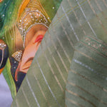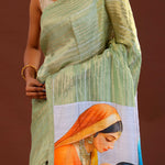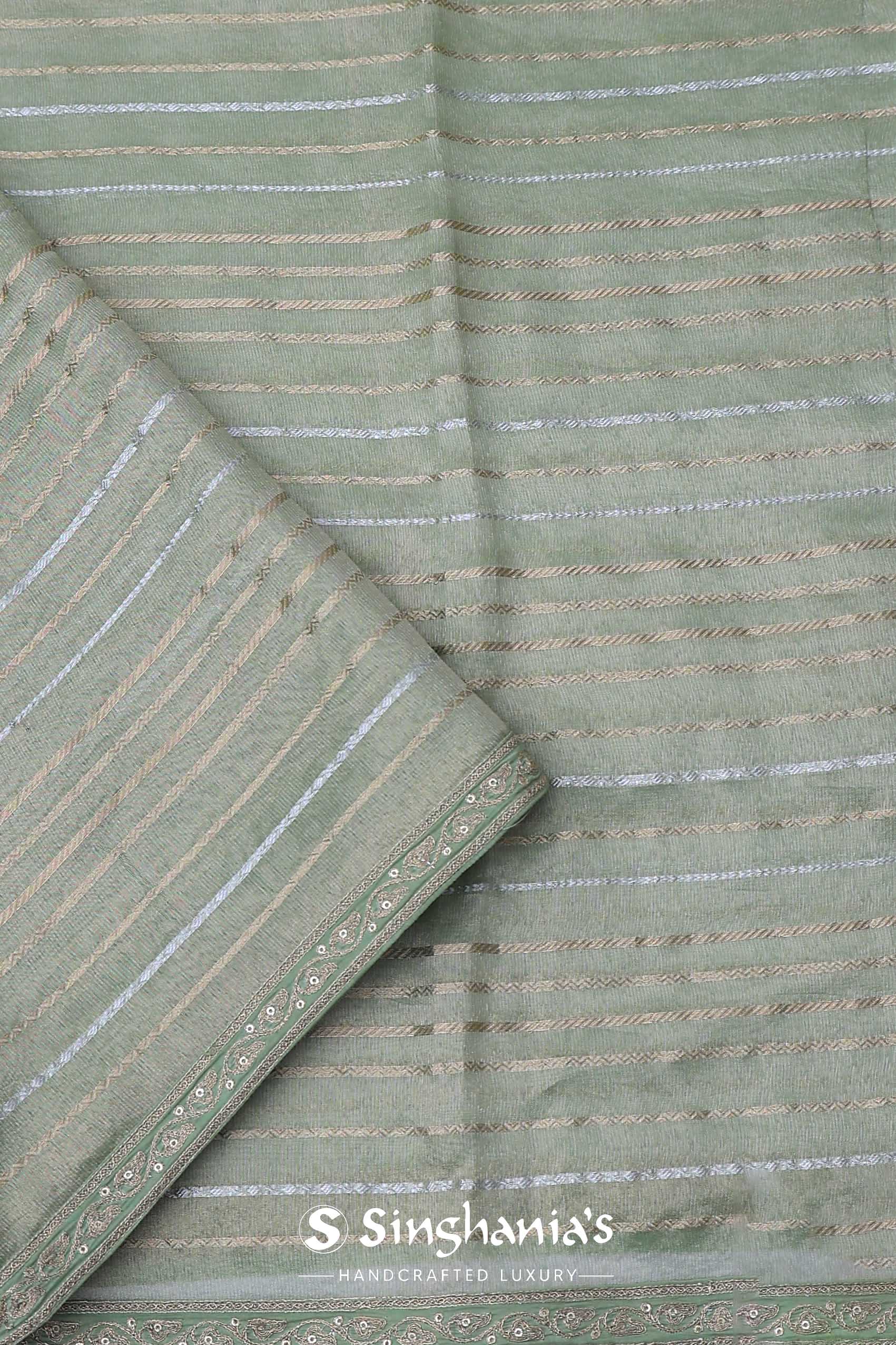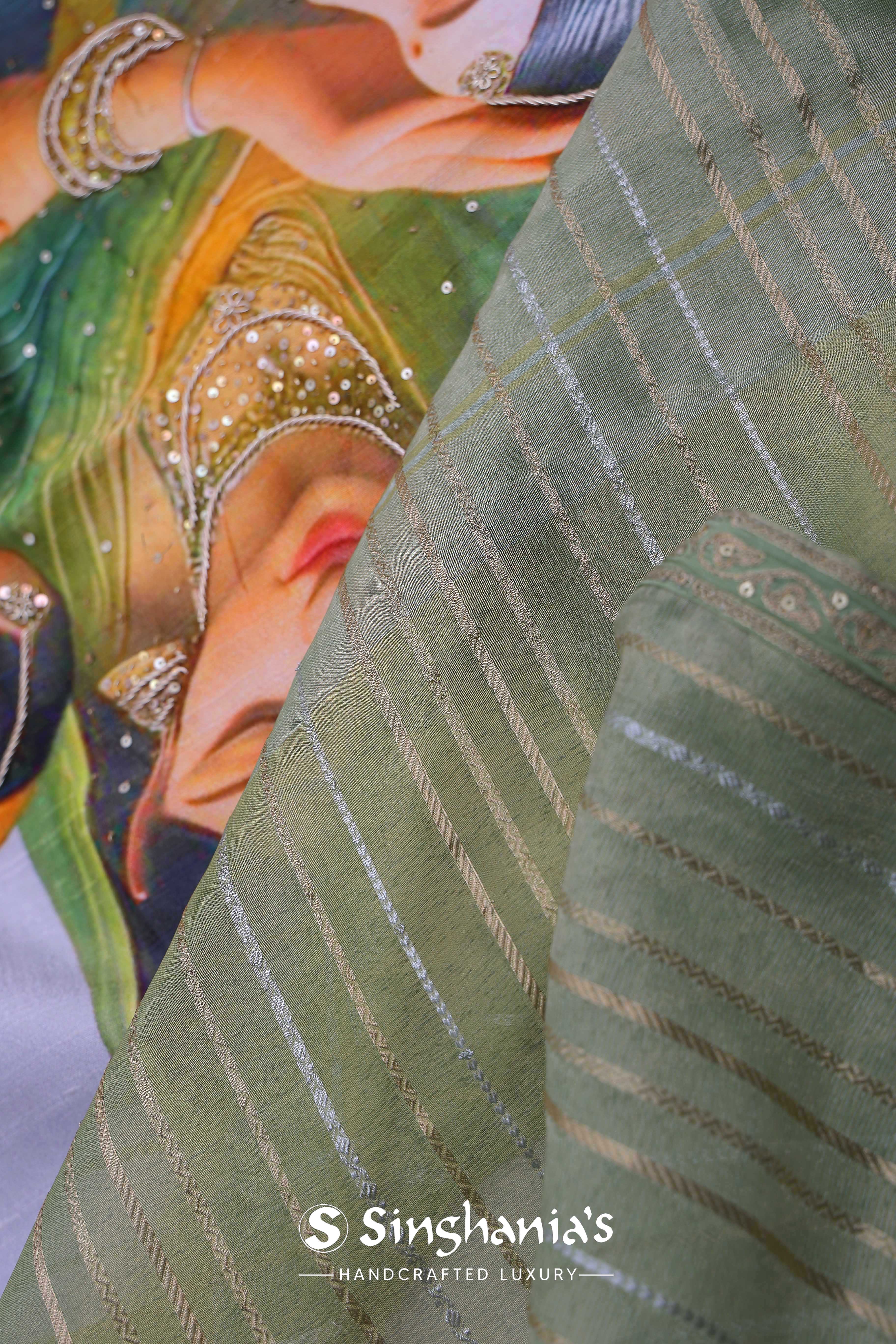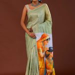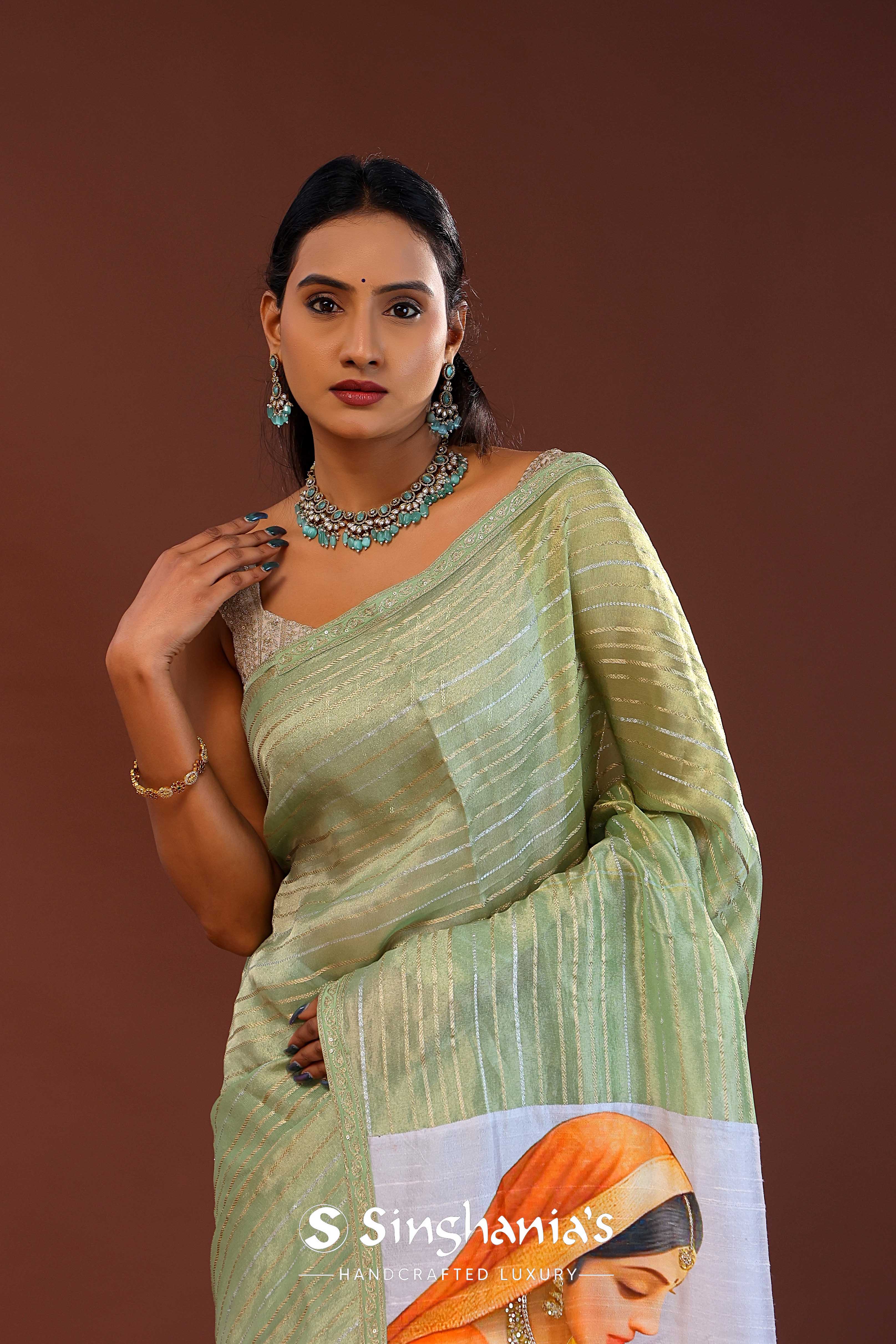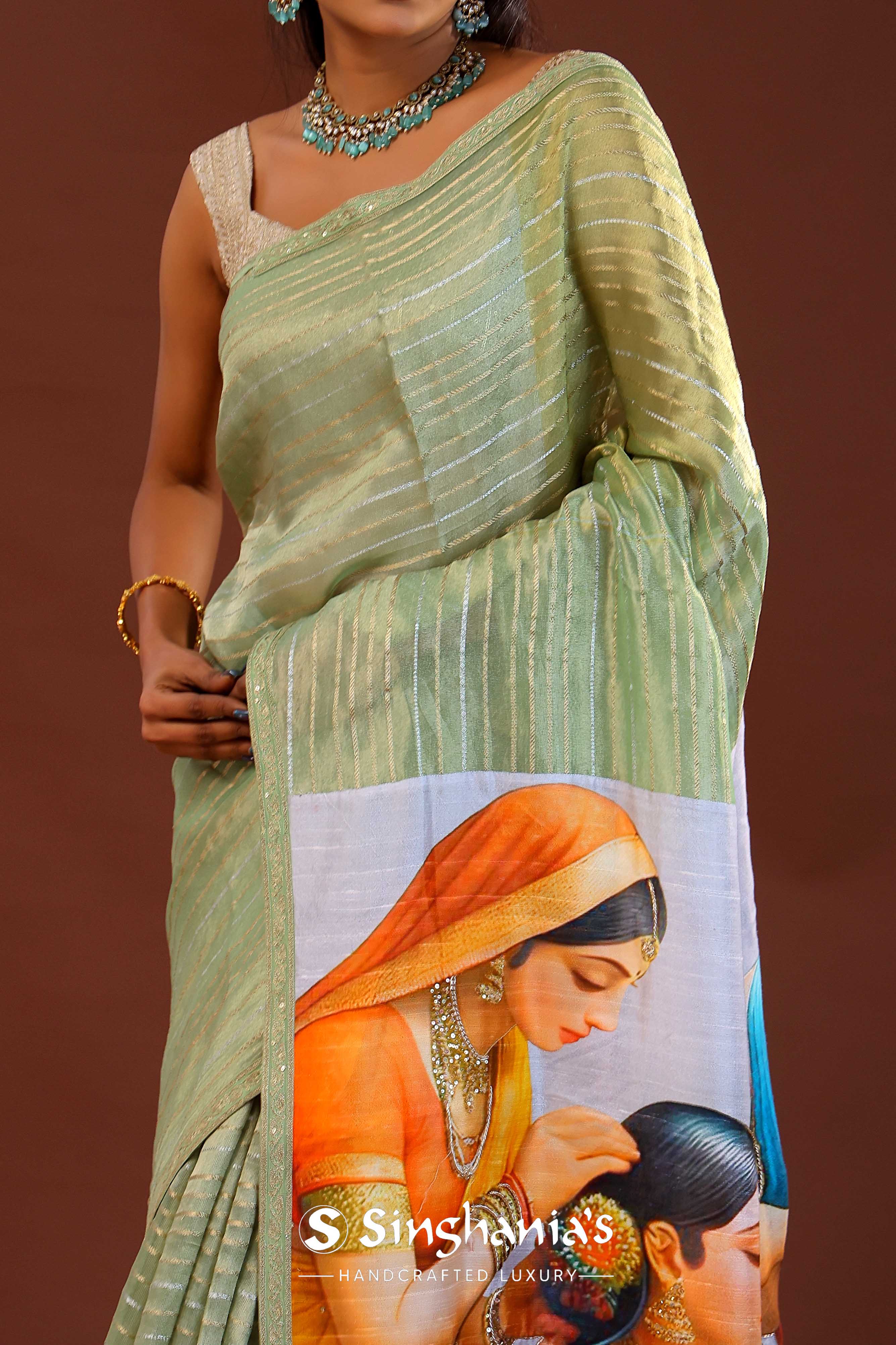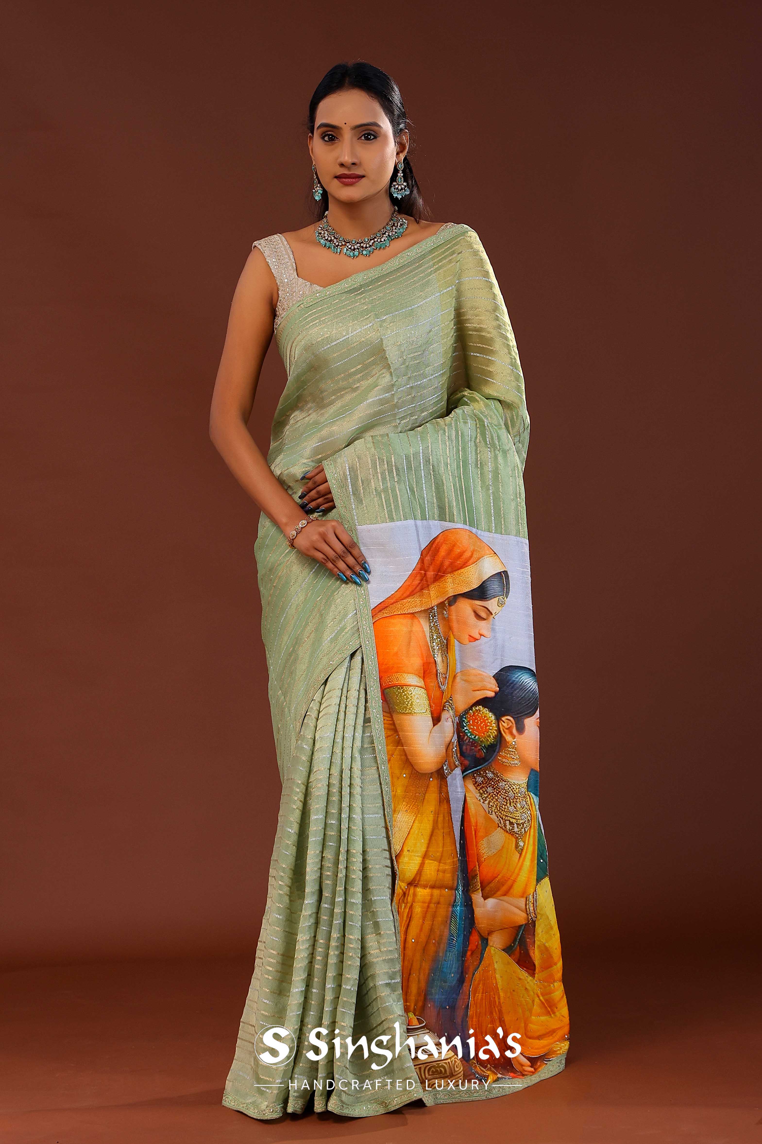 This sheen and delicate texture of the pista green tissue organza saree embellished with silver and gold zari stripes on body and pallu is adorned with digital printed making it special for your favourite occasions .