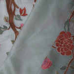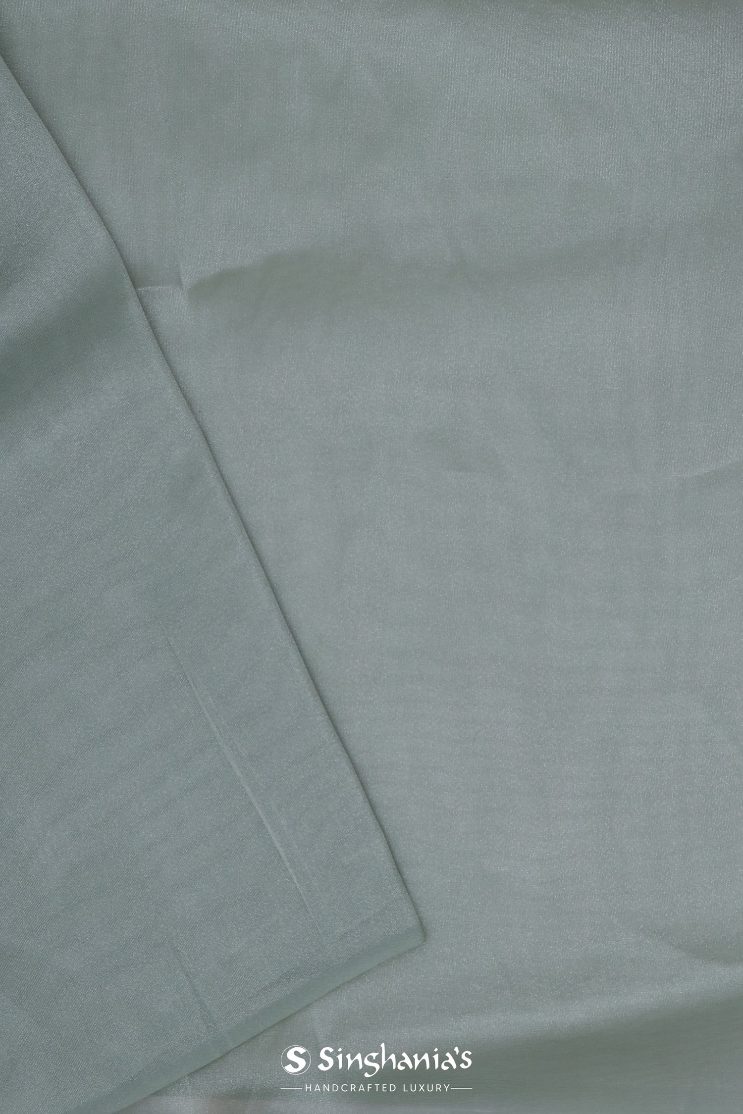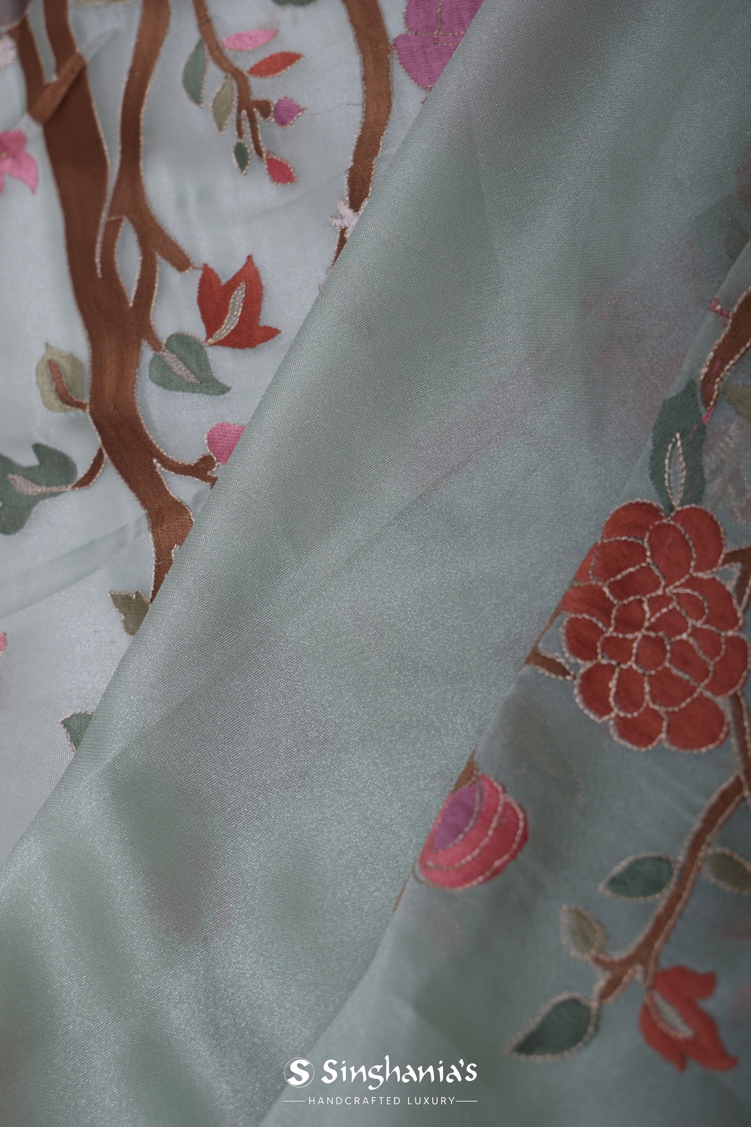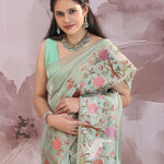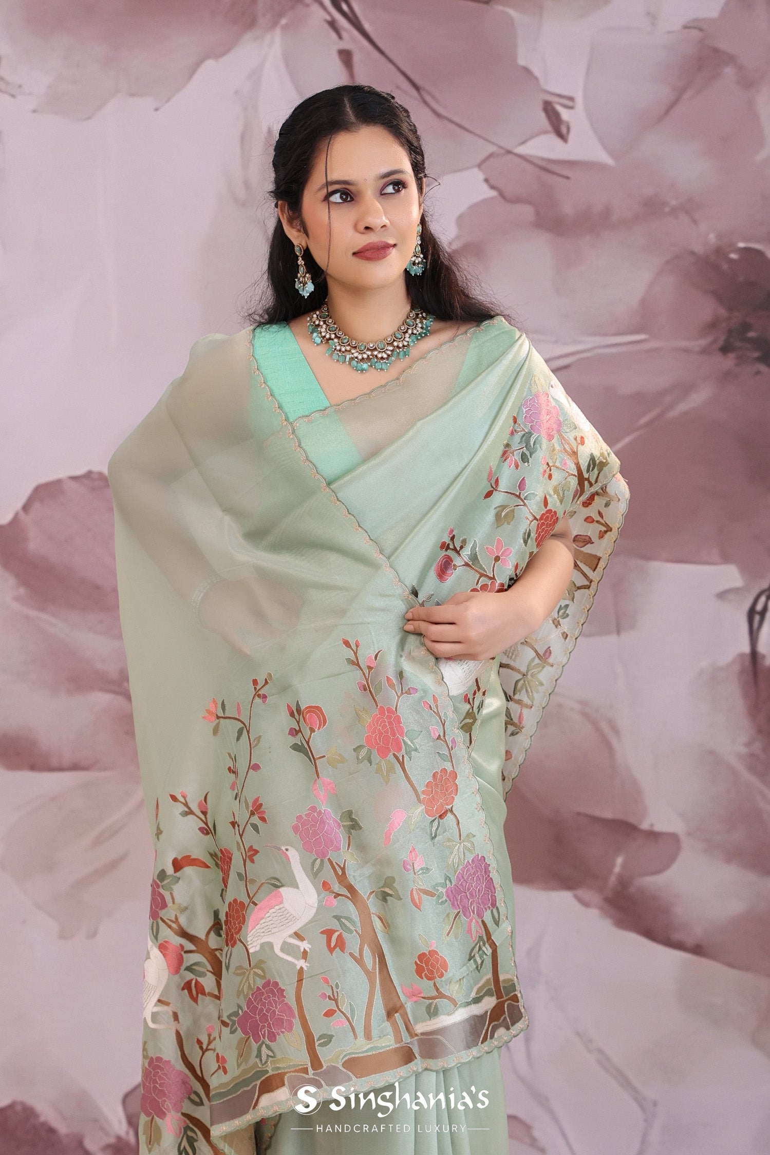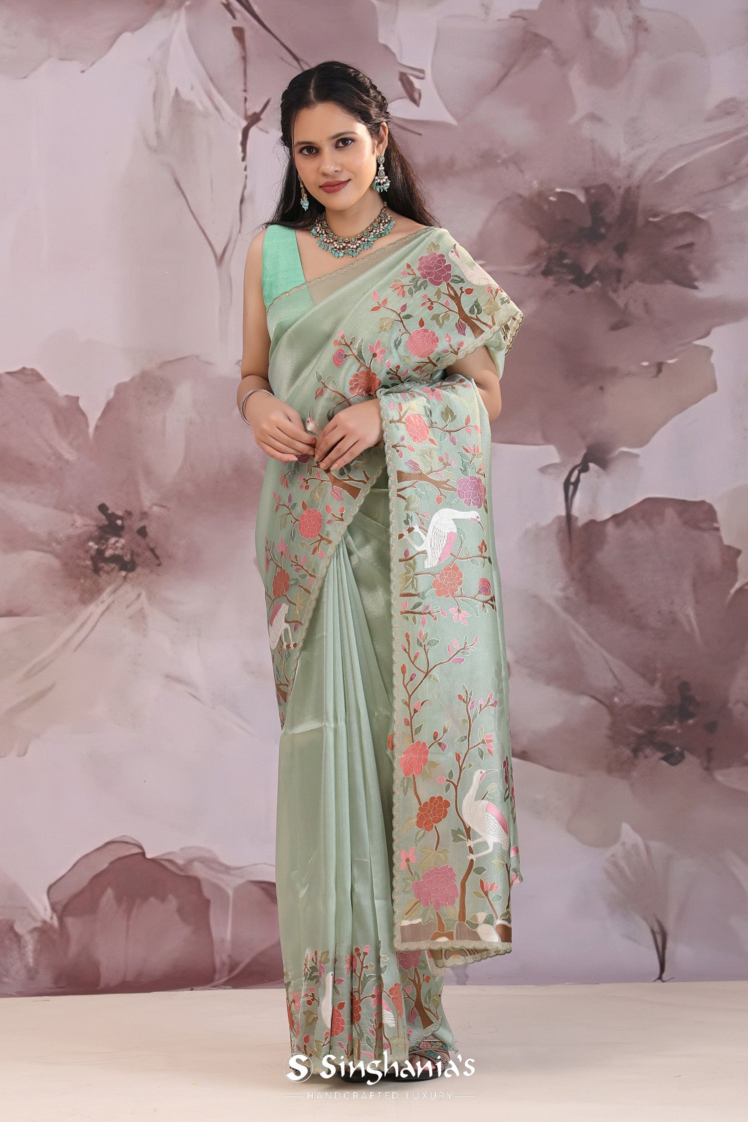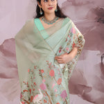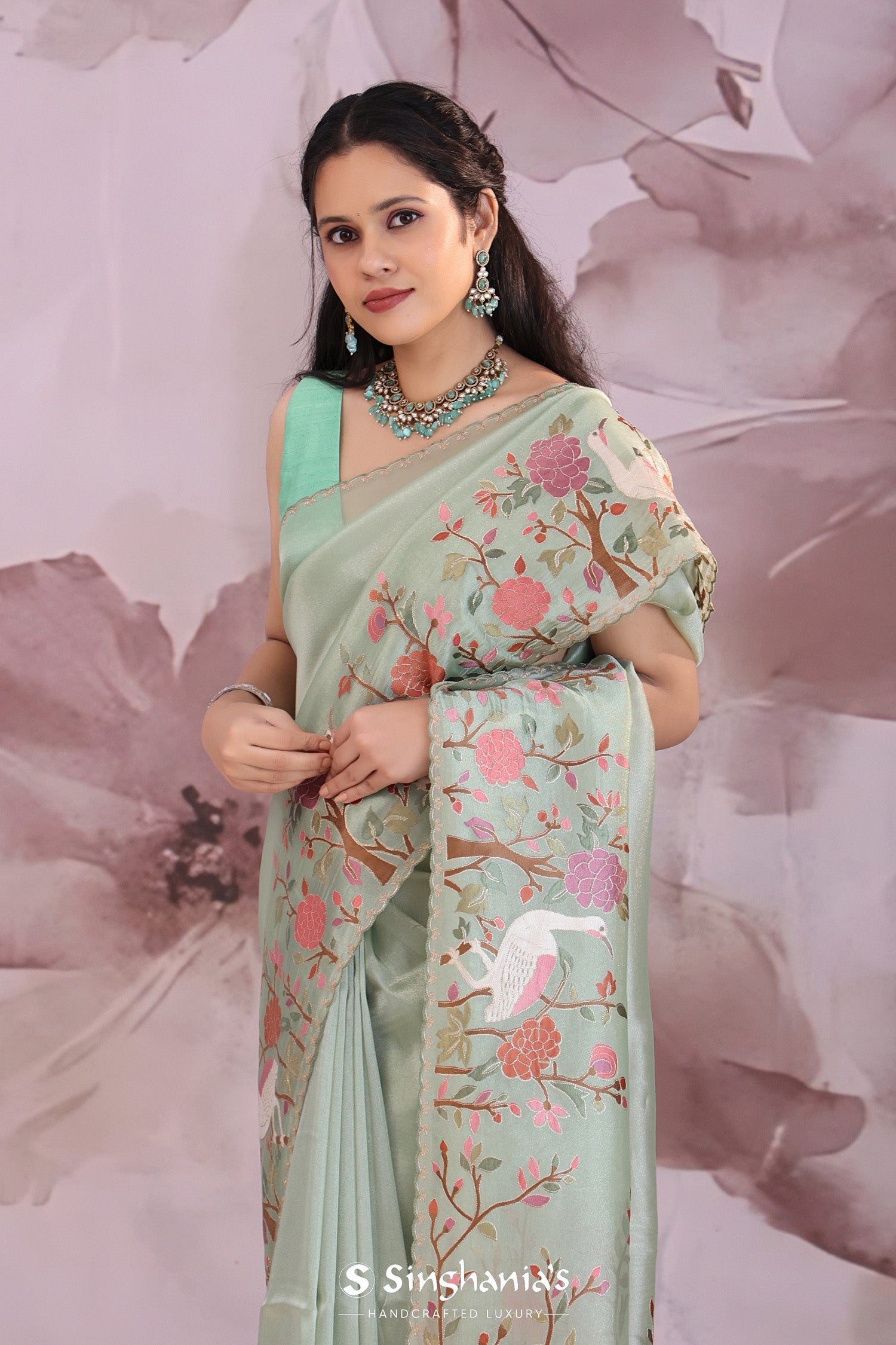 This Pistachio green tissue saree features embroidery work forming trees and swan figures all along the border and on pallu making every moment picture perfect.