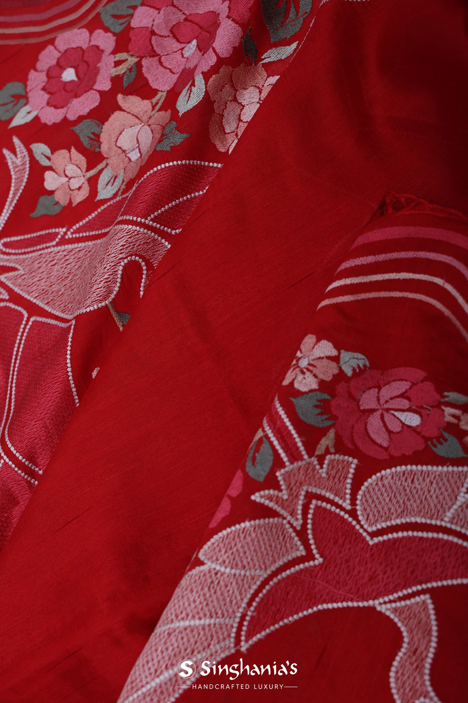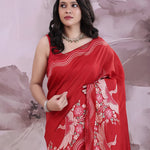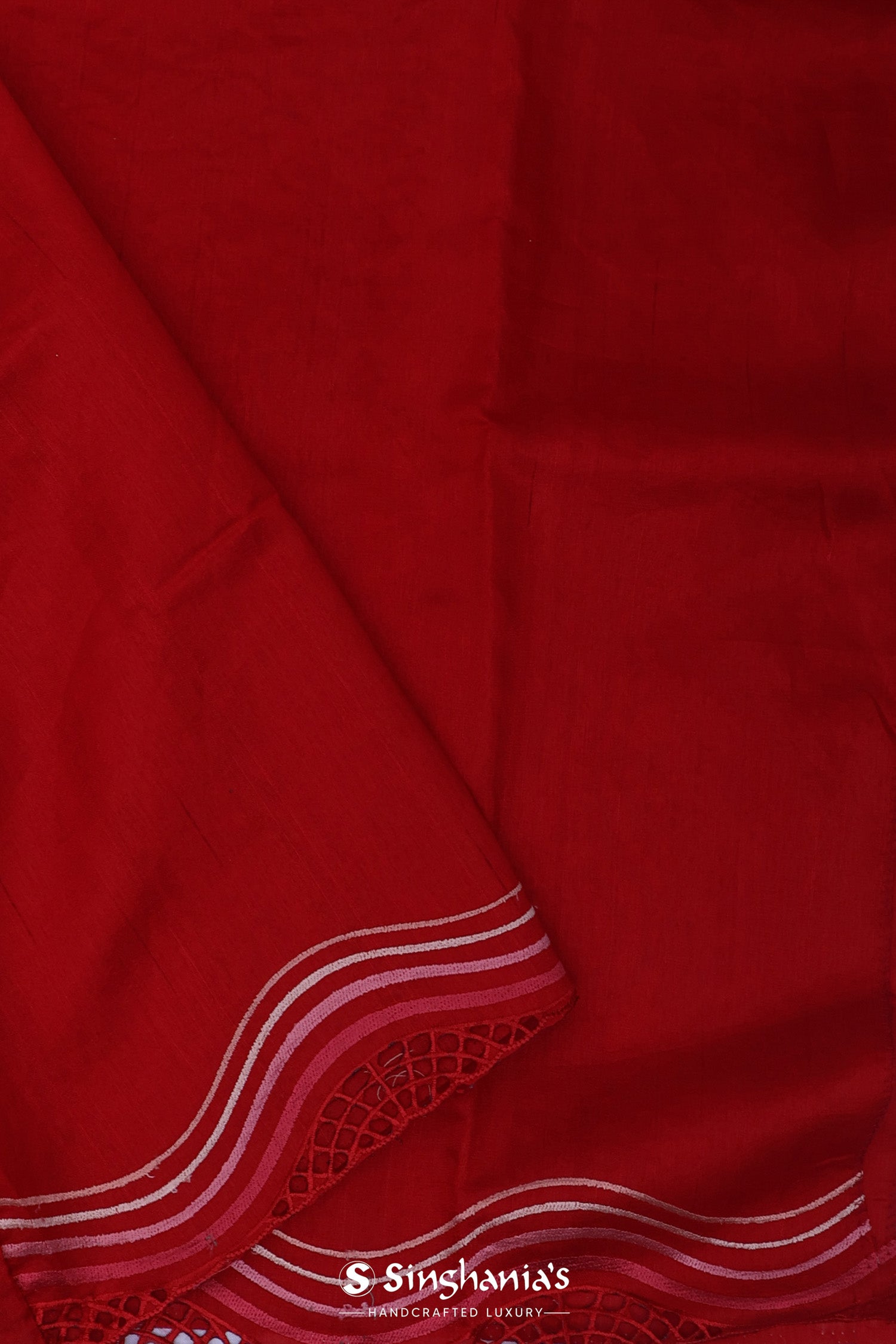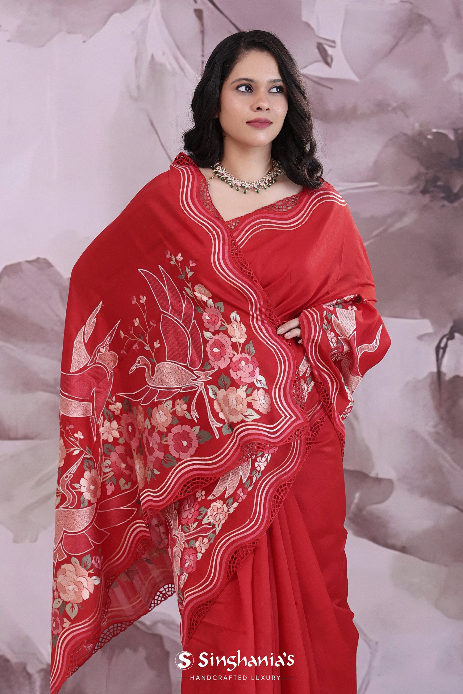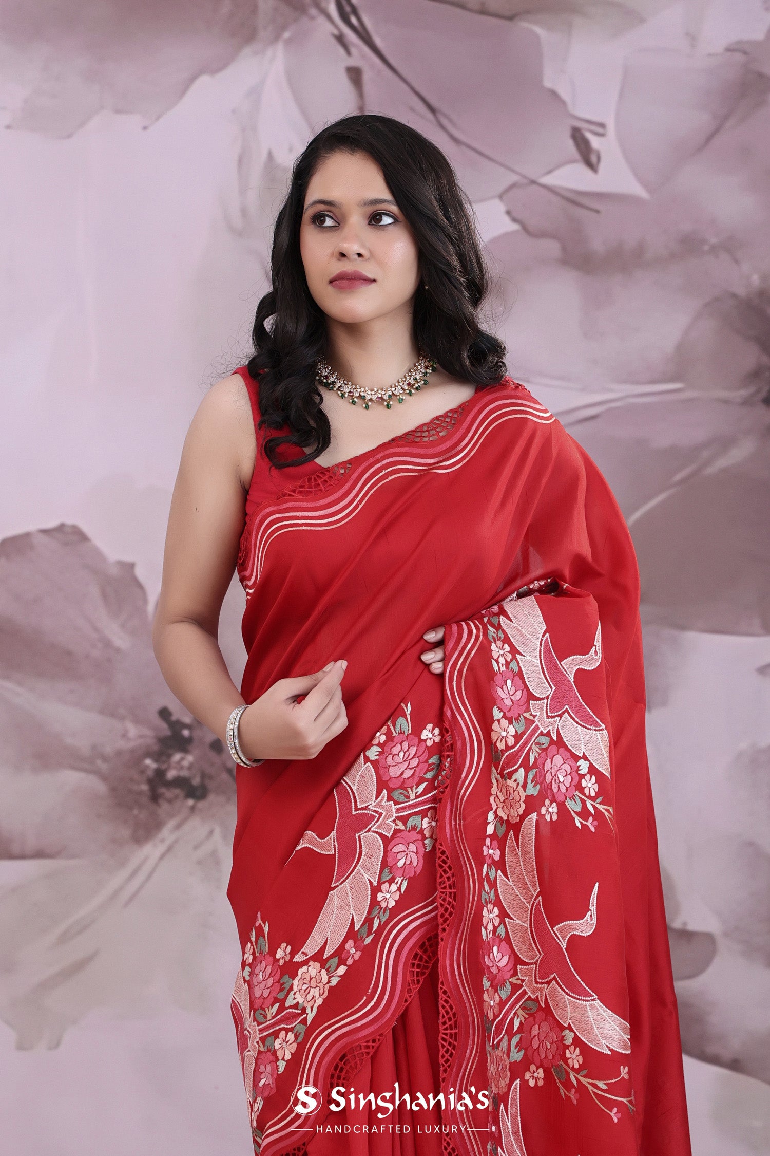 Red tussar saree presenting a wave pattern in contrast colors all over the border along with avian and floral embroidery embellished which is adding the charm to overall look.