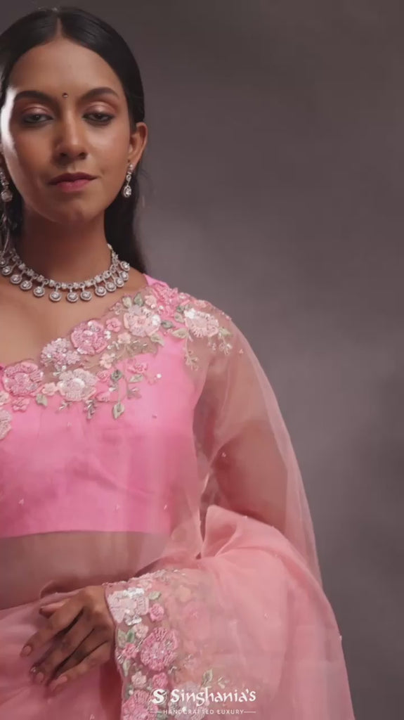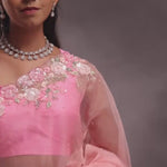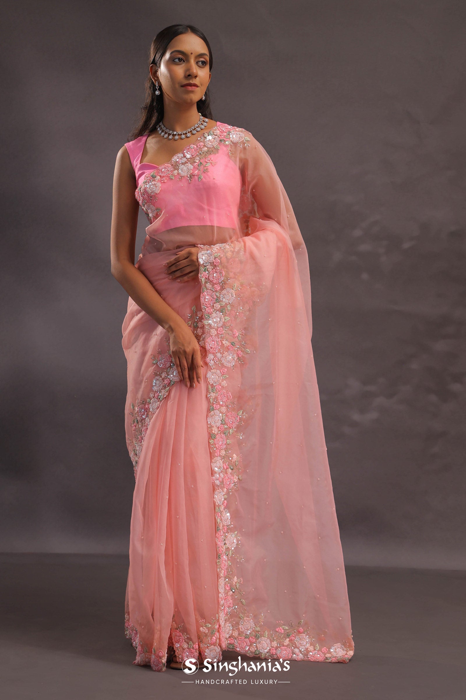 Salmon Pink Organza Embroidery Saree With Pearls And Sequins Detailing