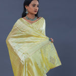 Soft light lime green organza tissue saree is adorned with gold and silver zari stripes woven on entire plain saree emits richness and elegence because of the soft colour and minimalist detailing on saree to look classy on any event.