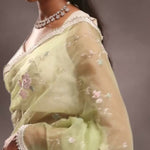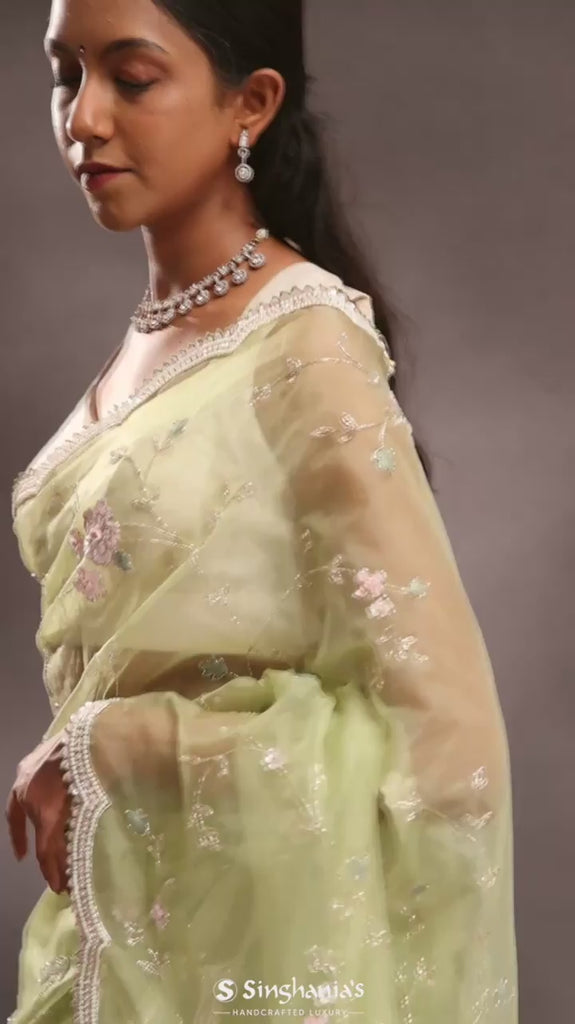 Soft Oilve Green Organza Embroidery Saree With Scallop Border