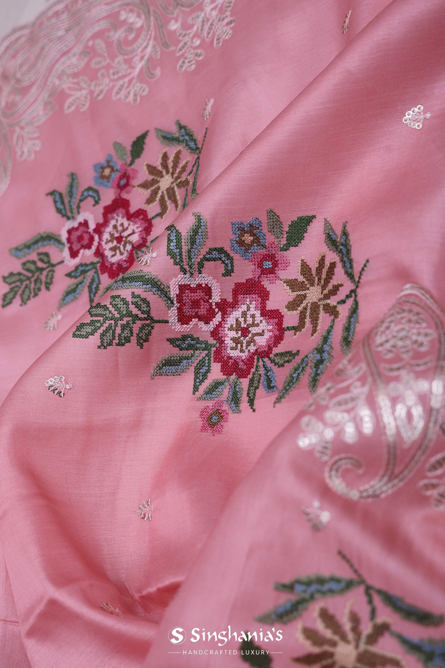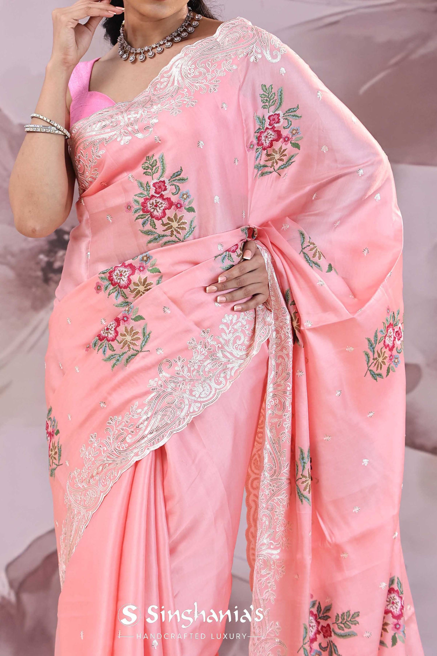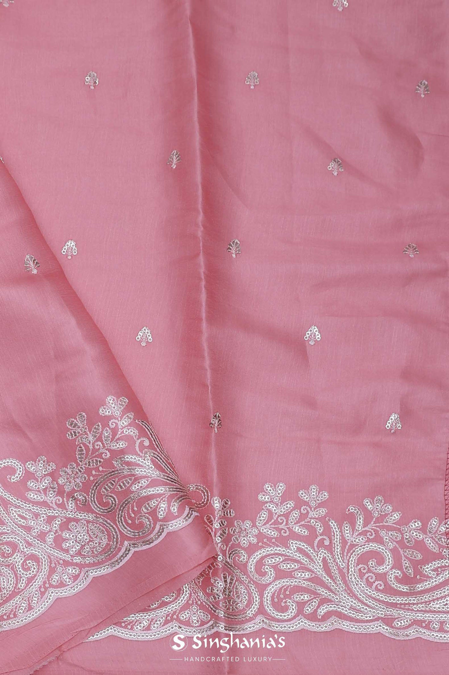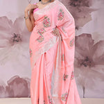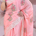 The unique petit point embroidery formed floral butta's scattered all across the Soft pink tussar saree along with scallop border adorned sequins embellished with paisley figures adds the finishing touch