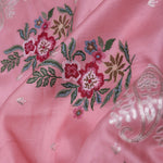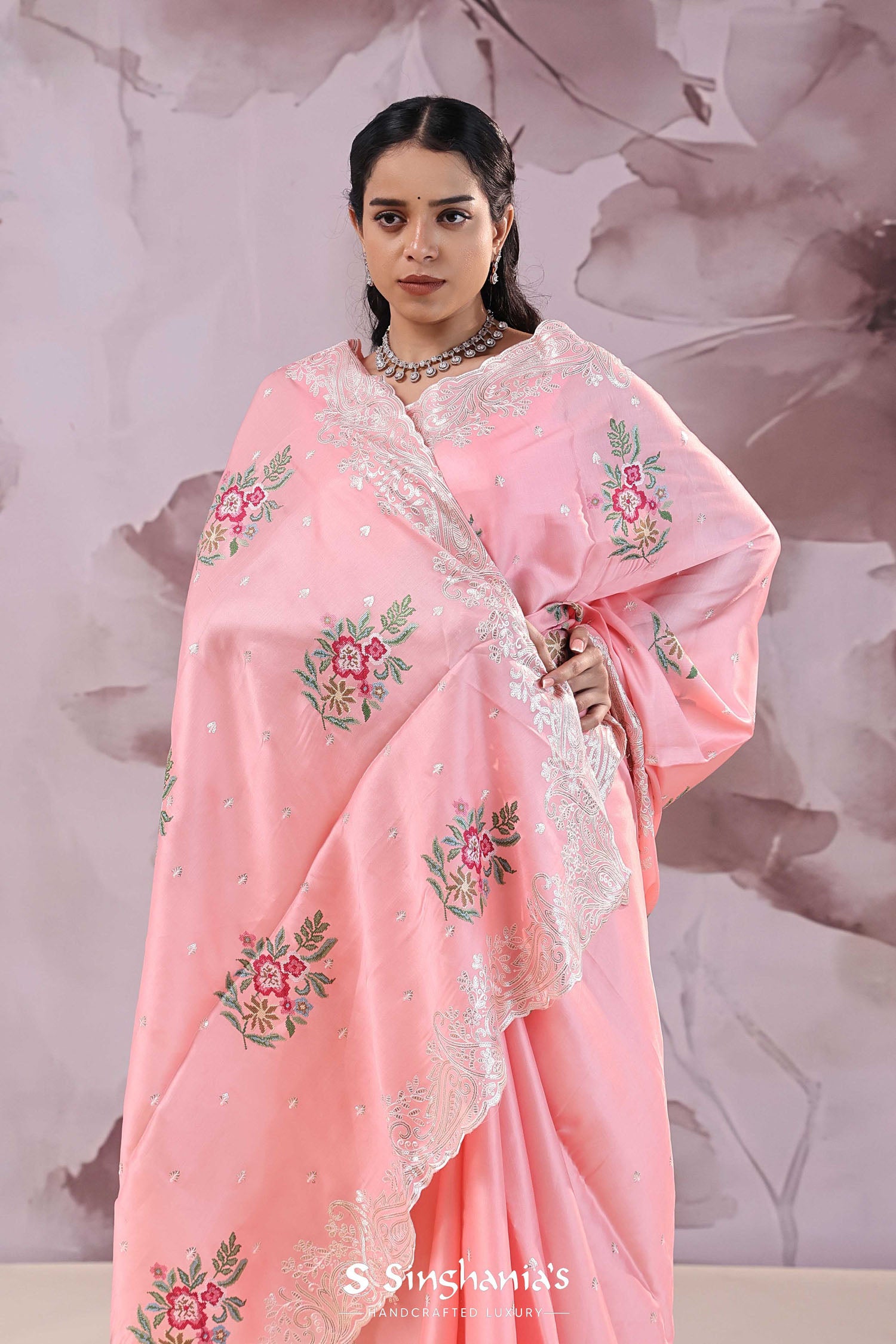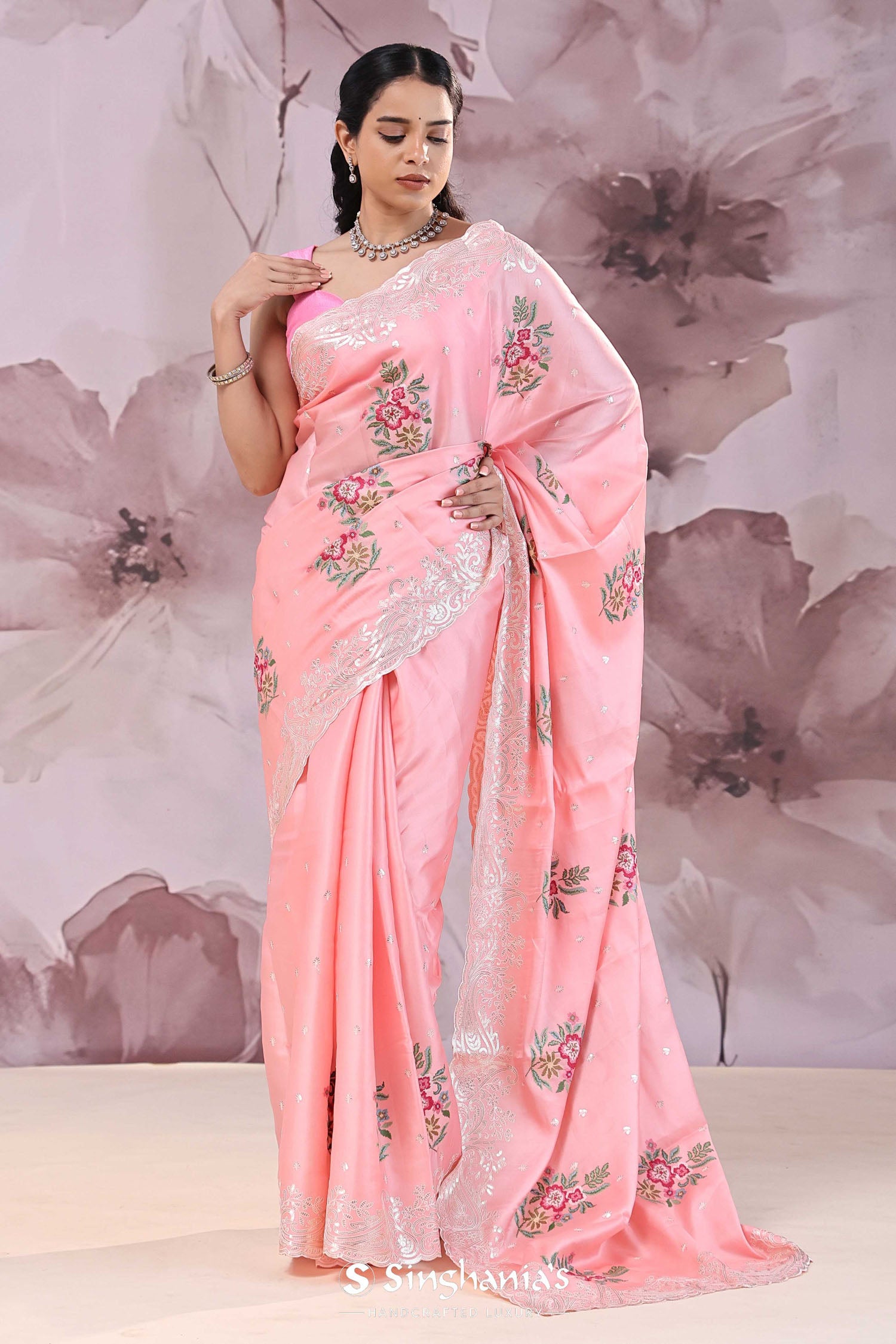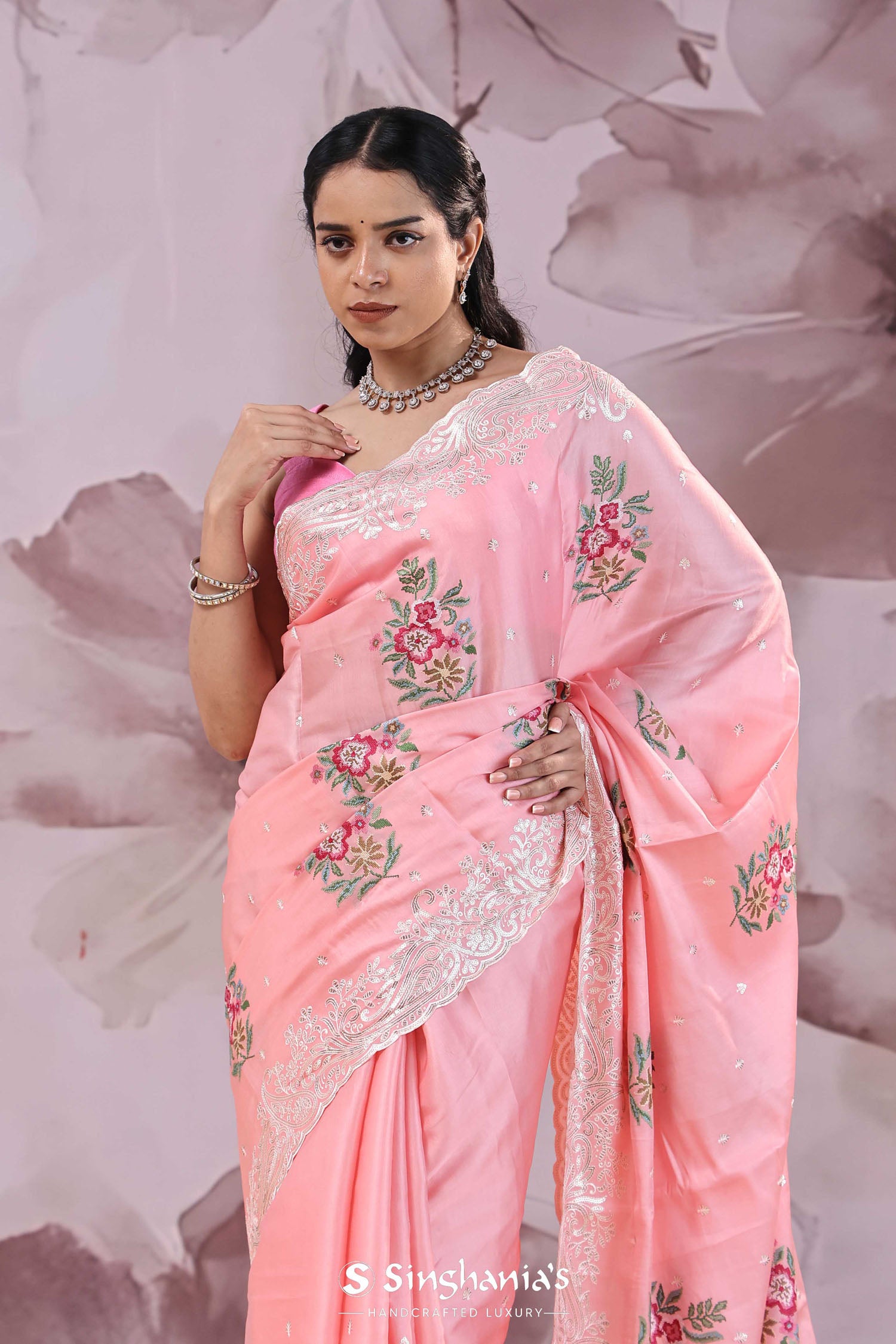 The unique petit point embroidery formed floral butta's scattered all across the Soft pink tussar saree along with scallop border adorned sequins embellished with paisley figures adds the finishing touch