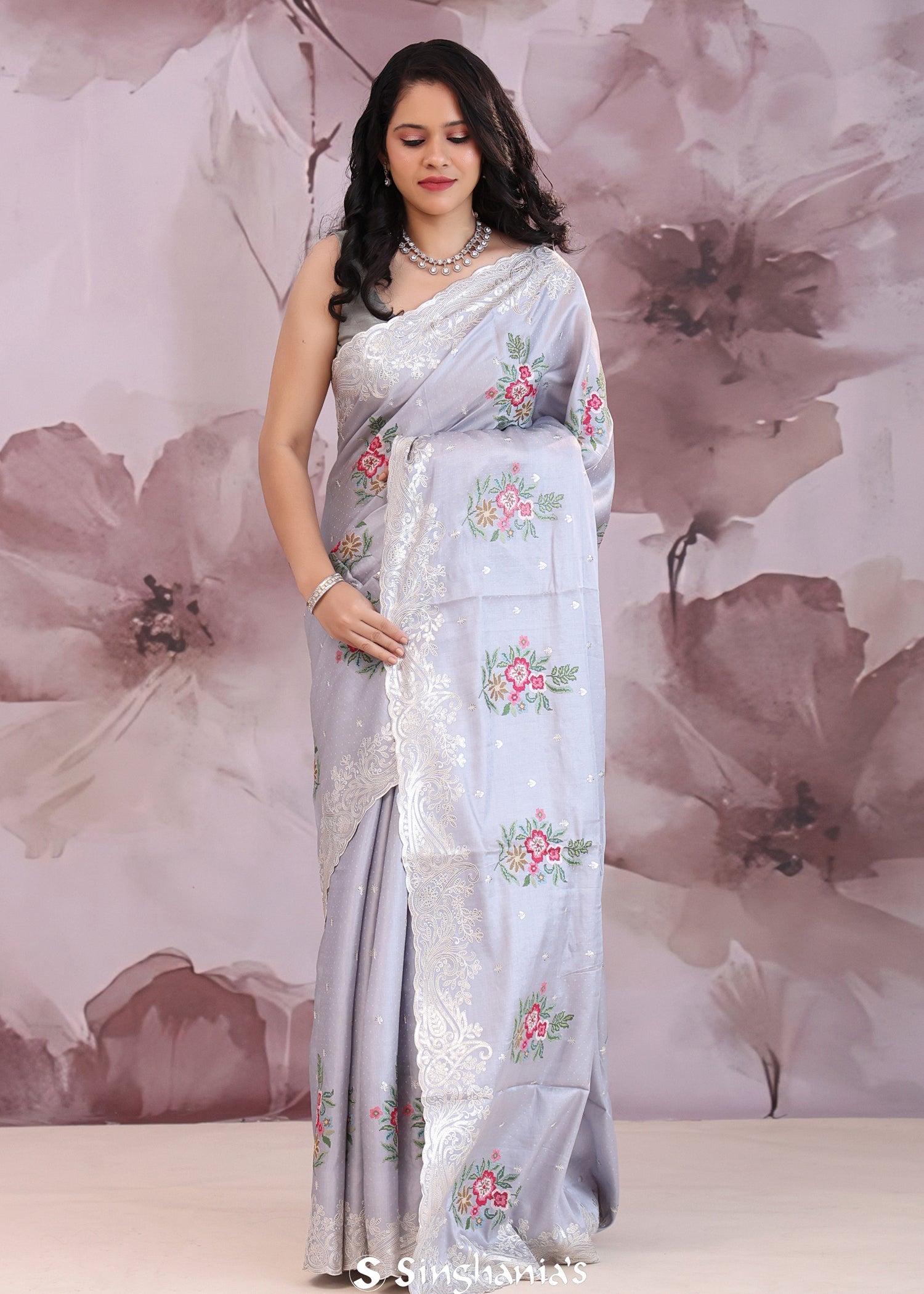 Dark Pastel Blue Organza Tissue Saree With Floral Embroidery