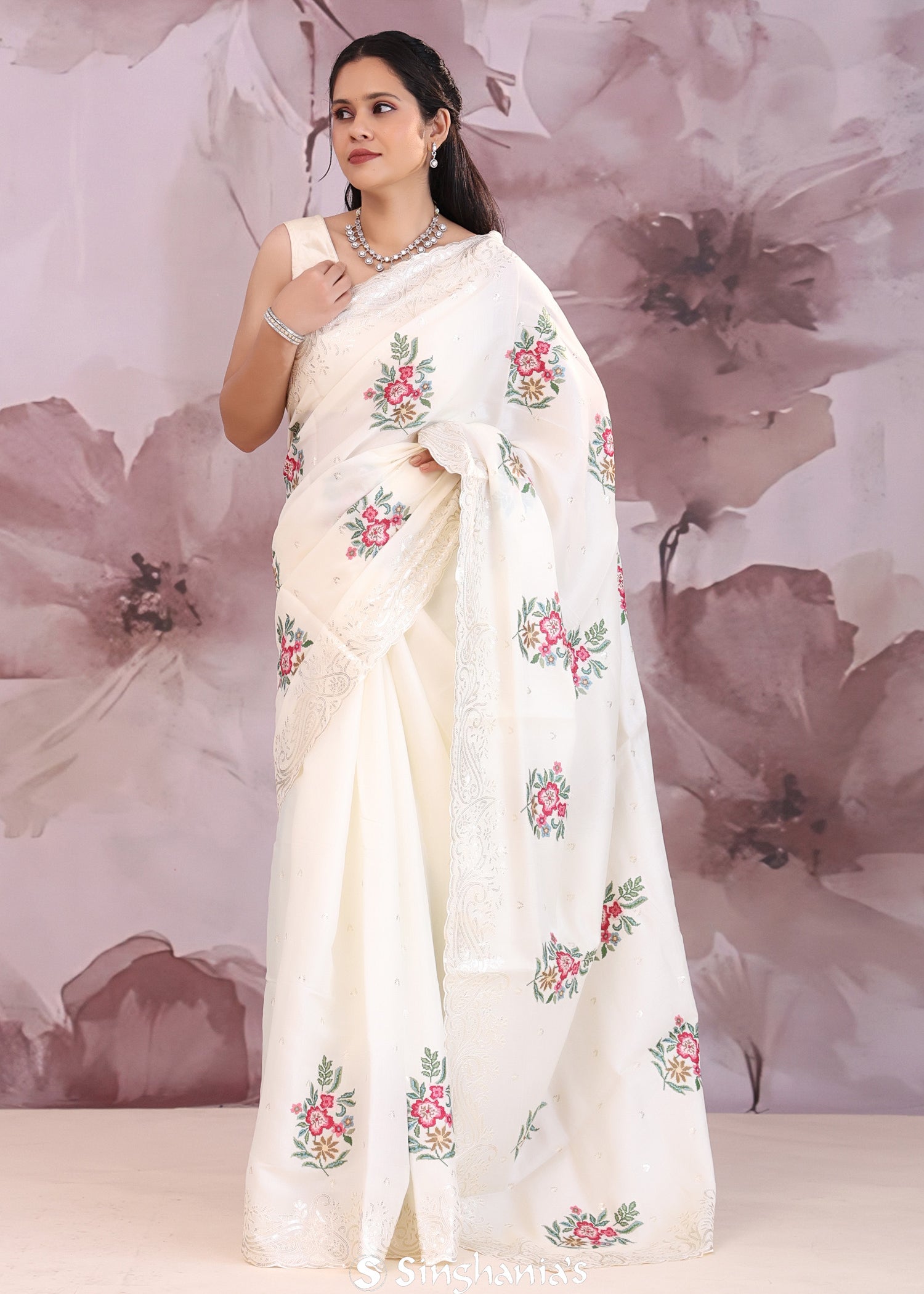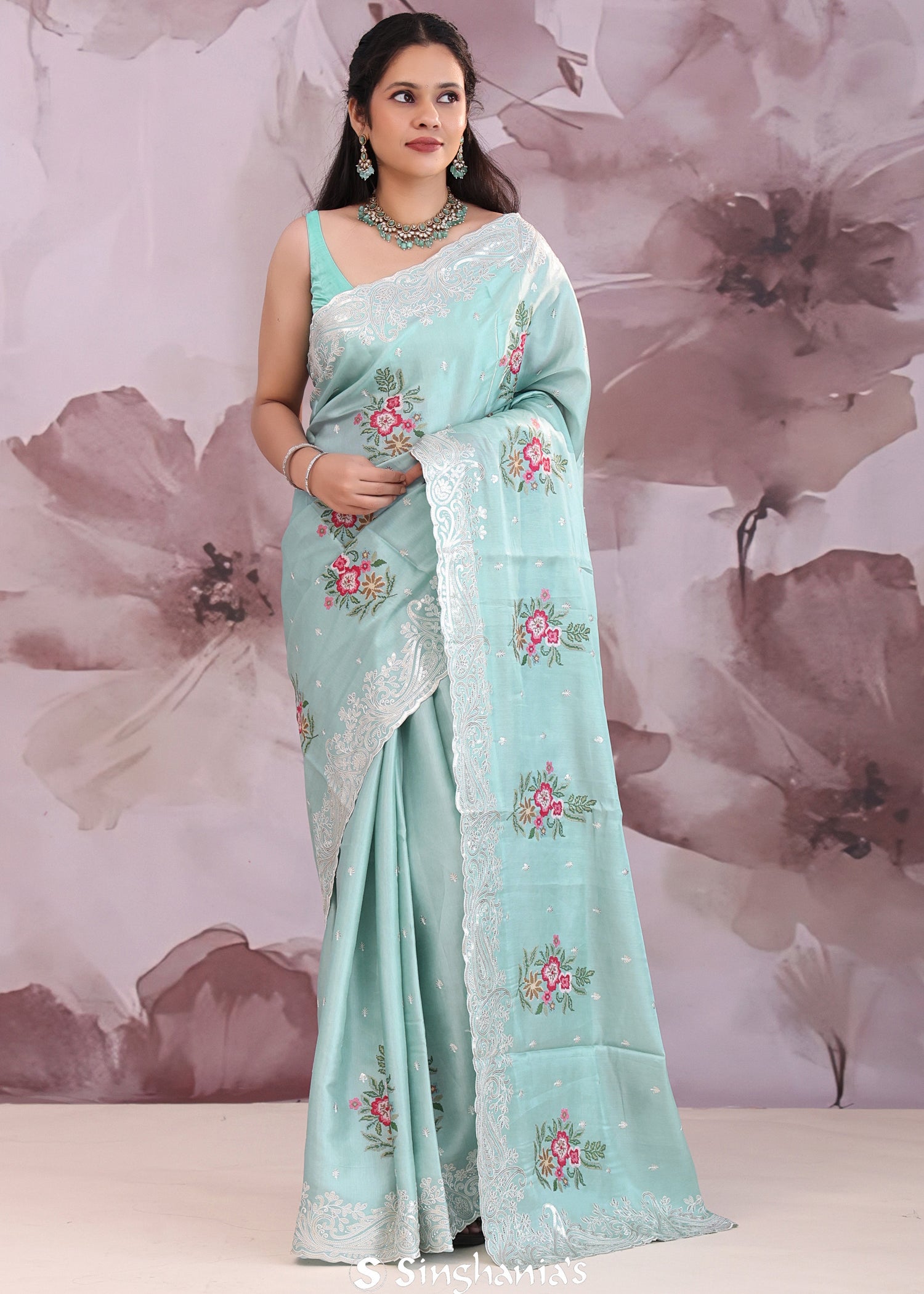 Sky Blue Organza Tissue Saree With Floral Embroidery