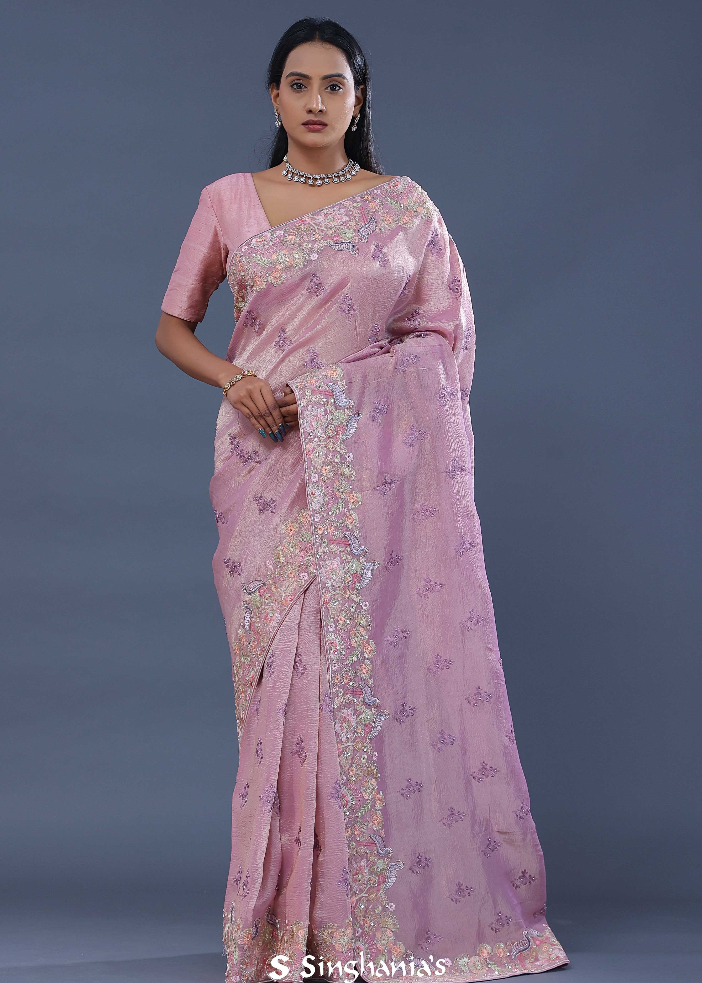 Pastel Pink Crushed Tissue Saree With Scallop Border