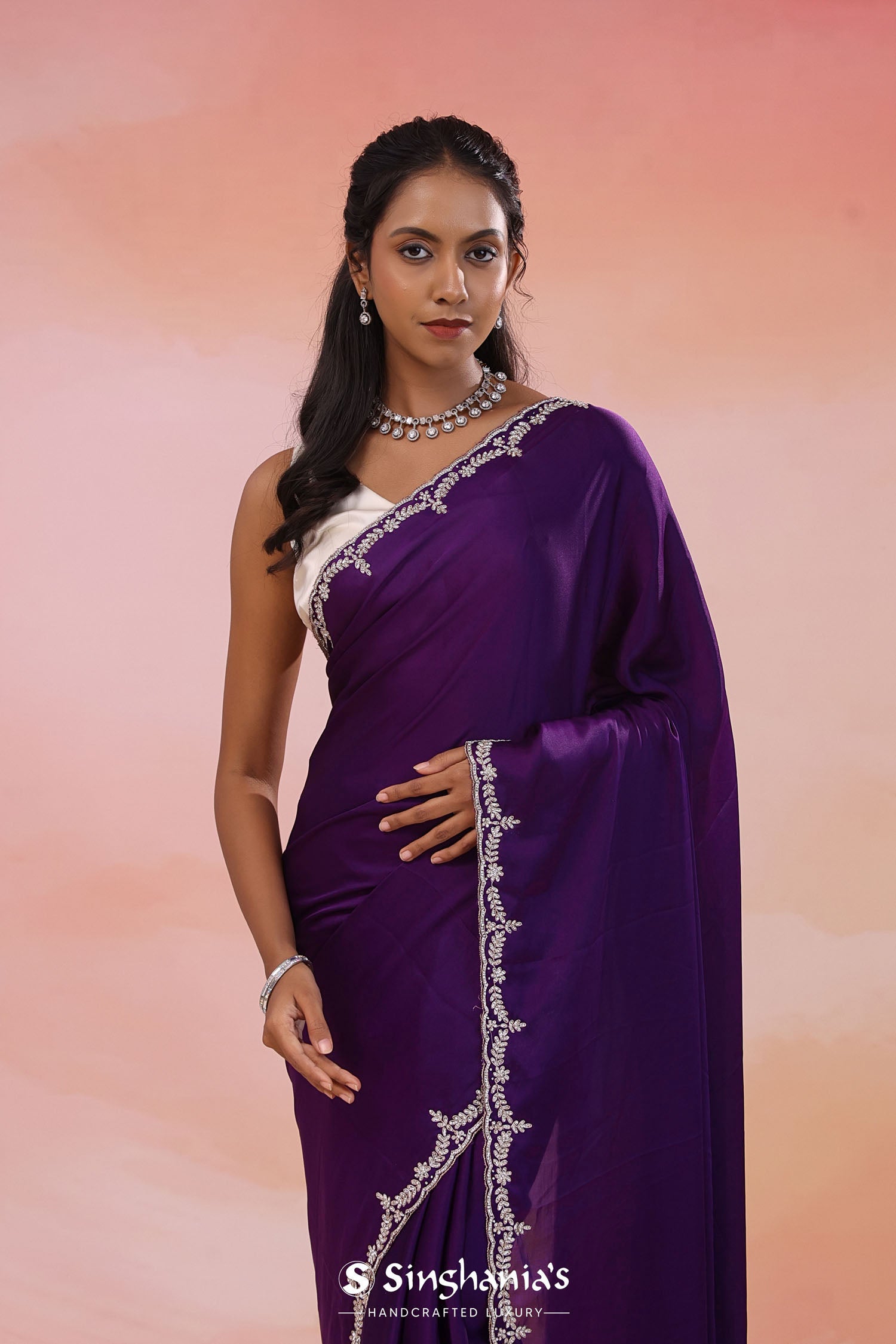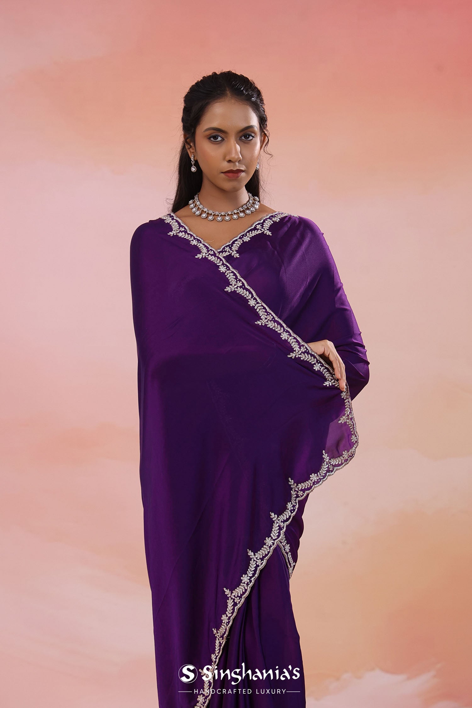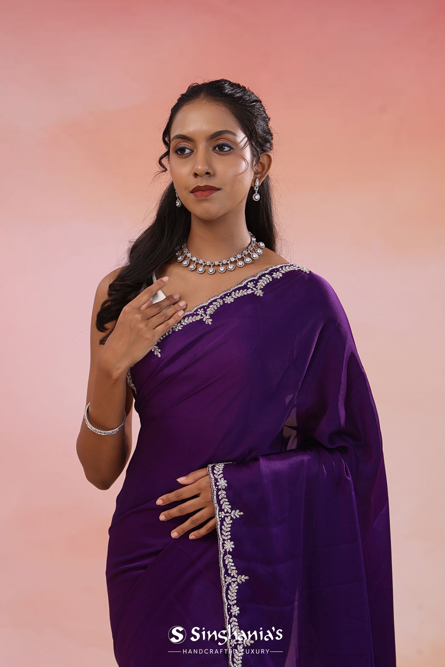 The beautiful dark purple crepe saree with stone and work zardosi fancy border along with an unstitched self blouse for a decent and dignified look.