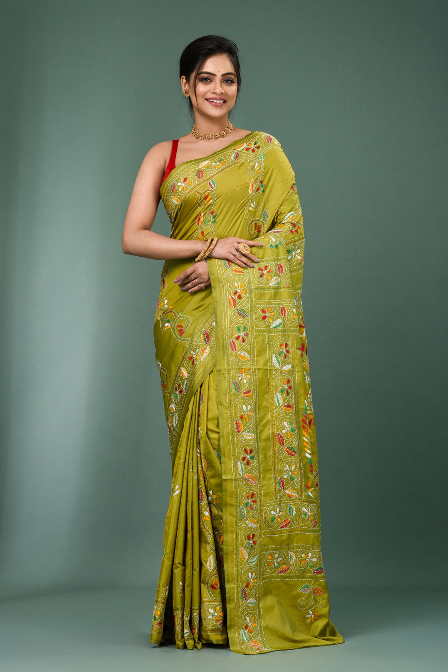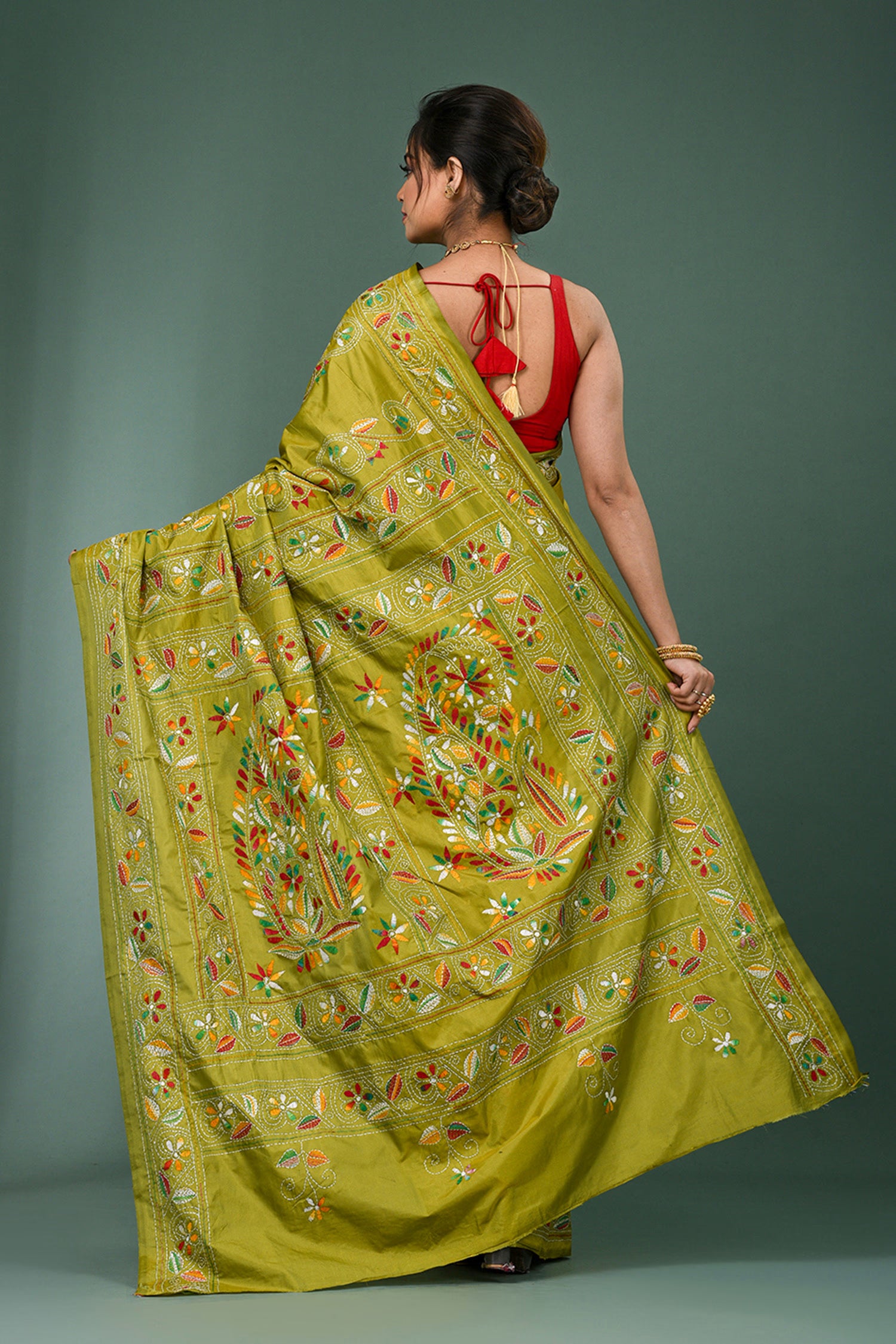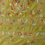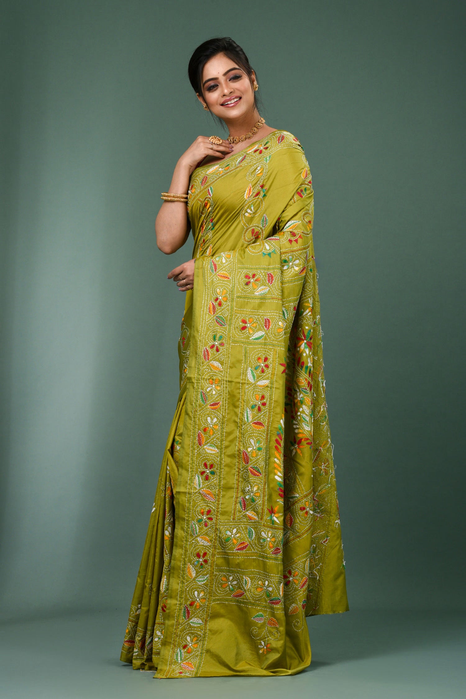 Muted Greenish Yellow Blended Silk Kantha Stitched Saree