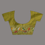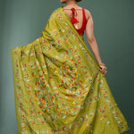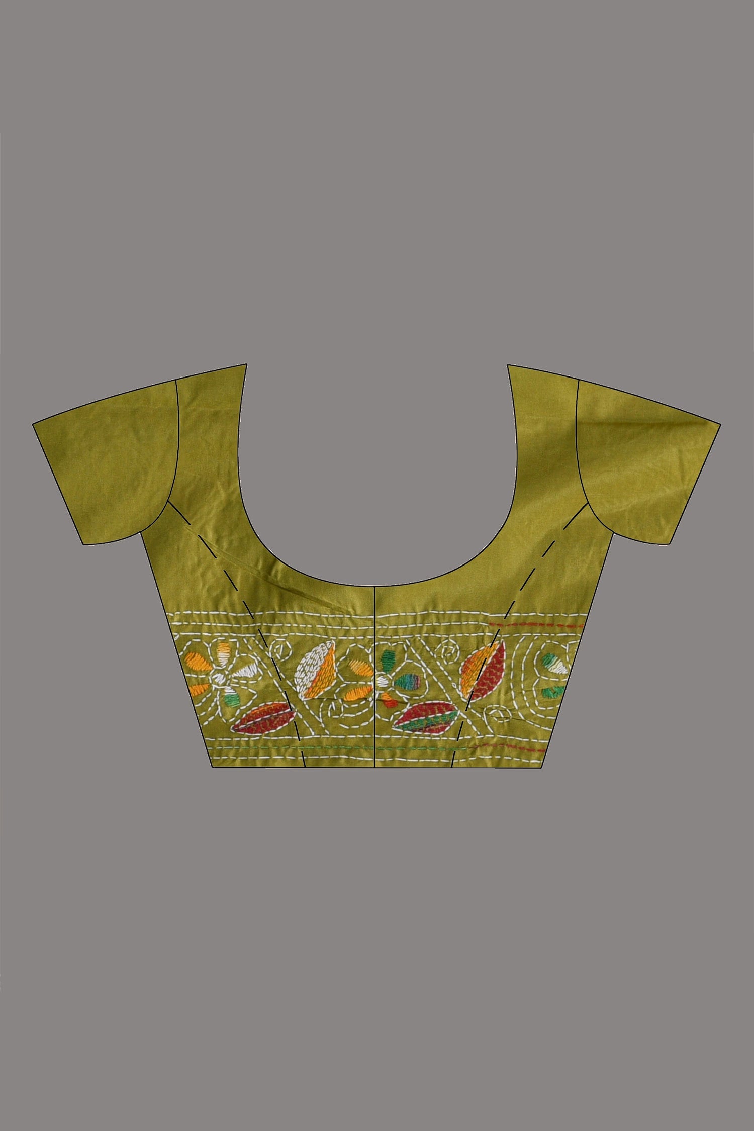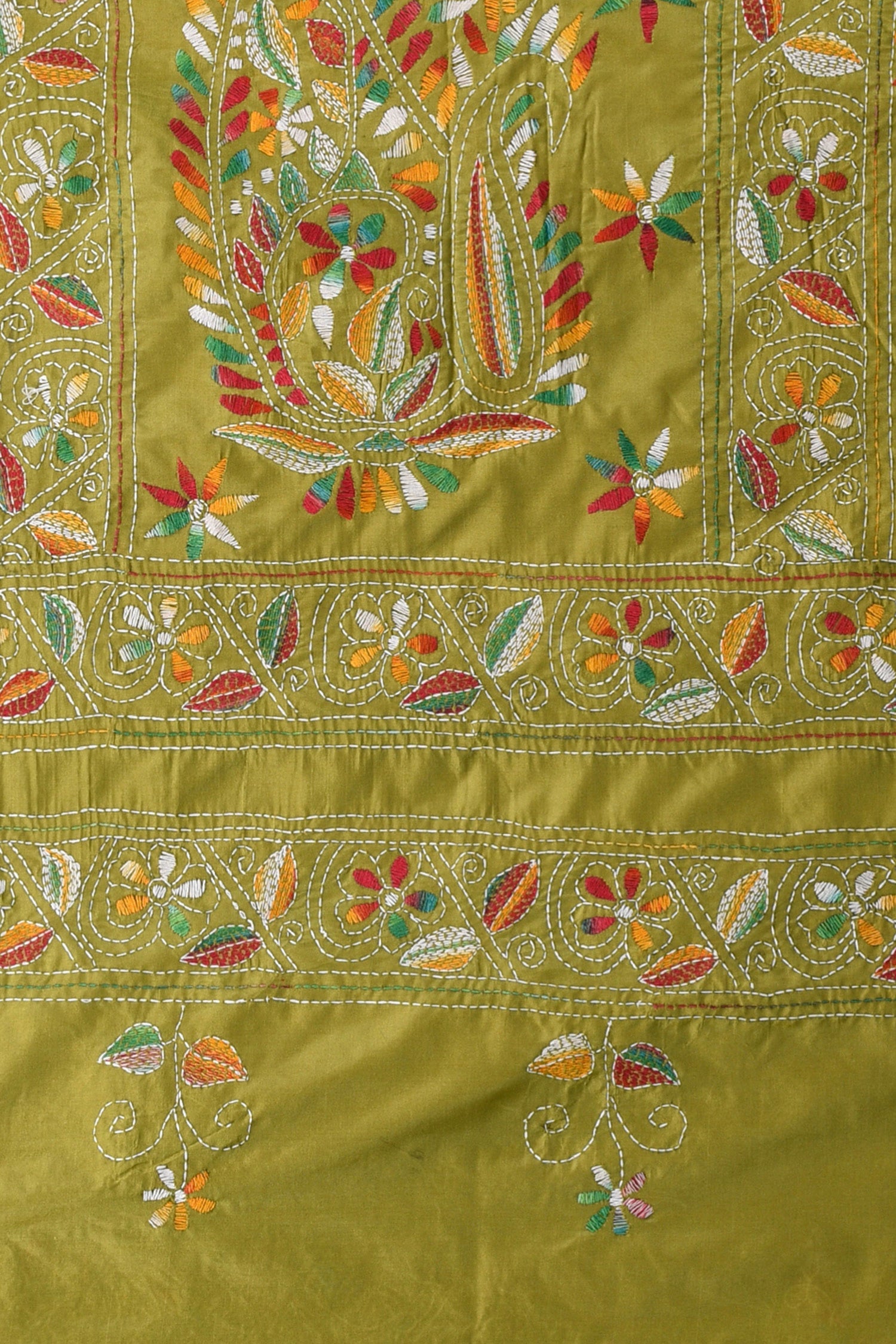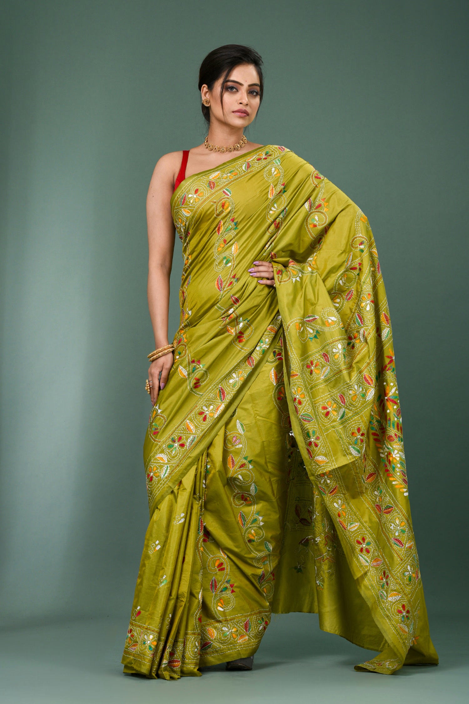 Muted Greenish Yellow Blended Silk Kantha Stitched Saree