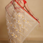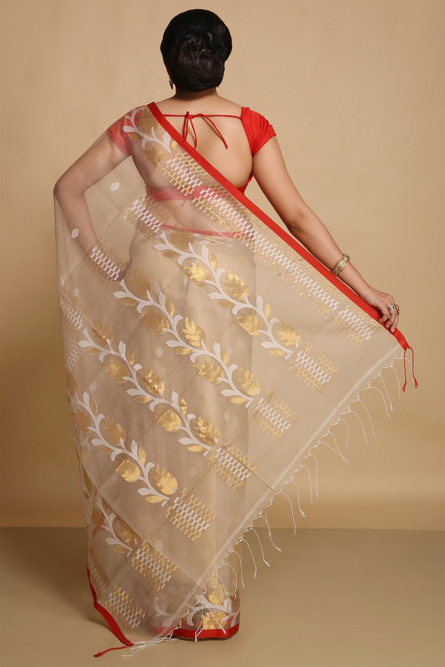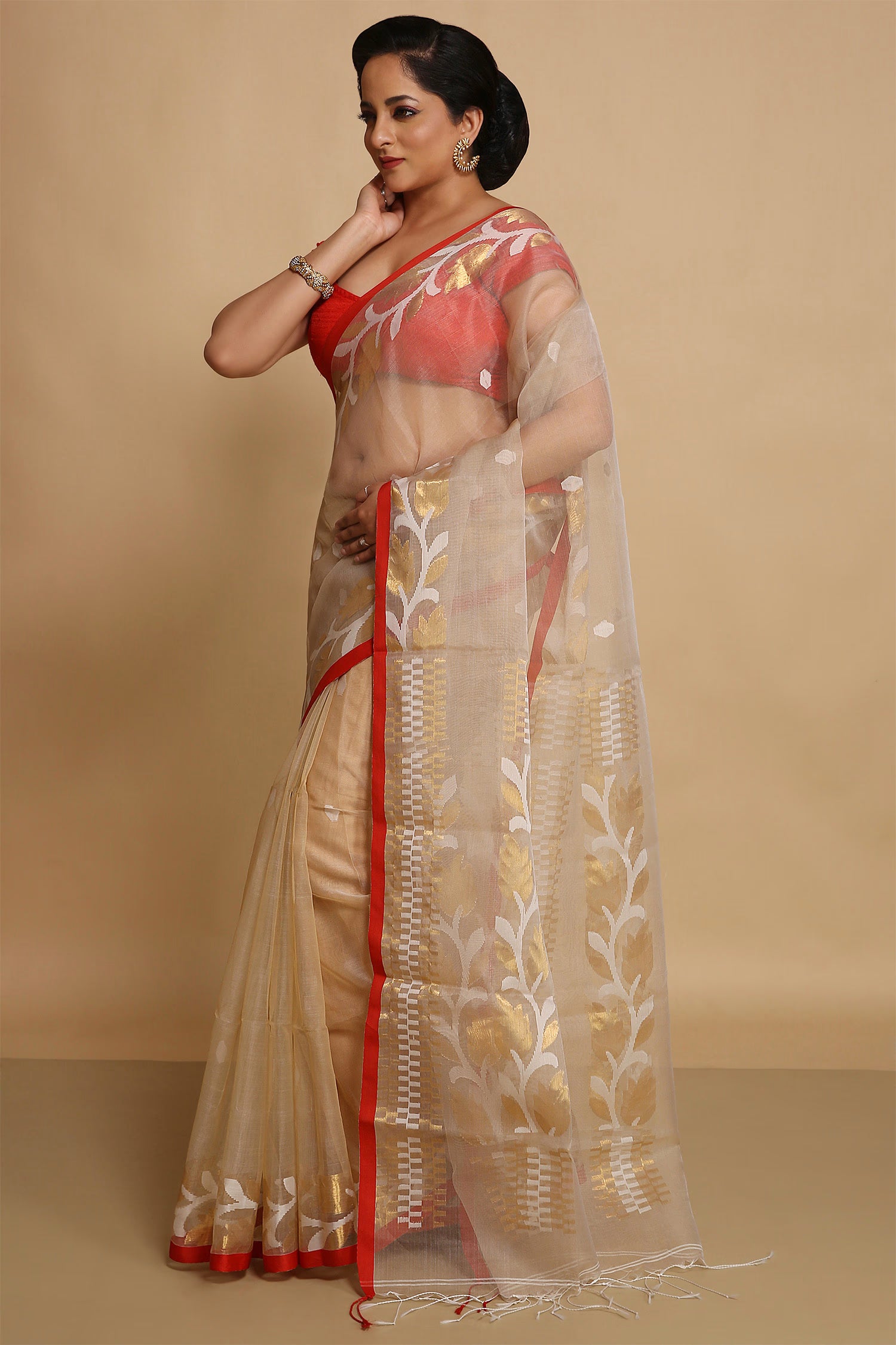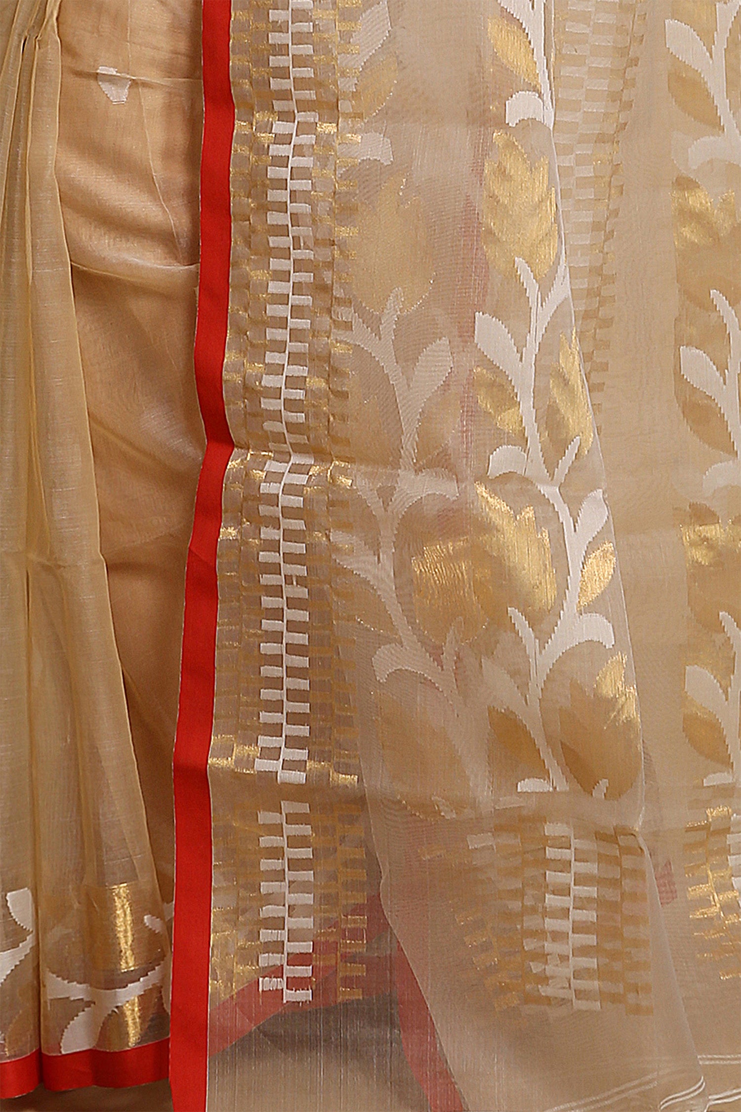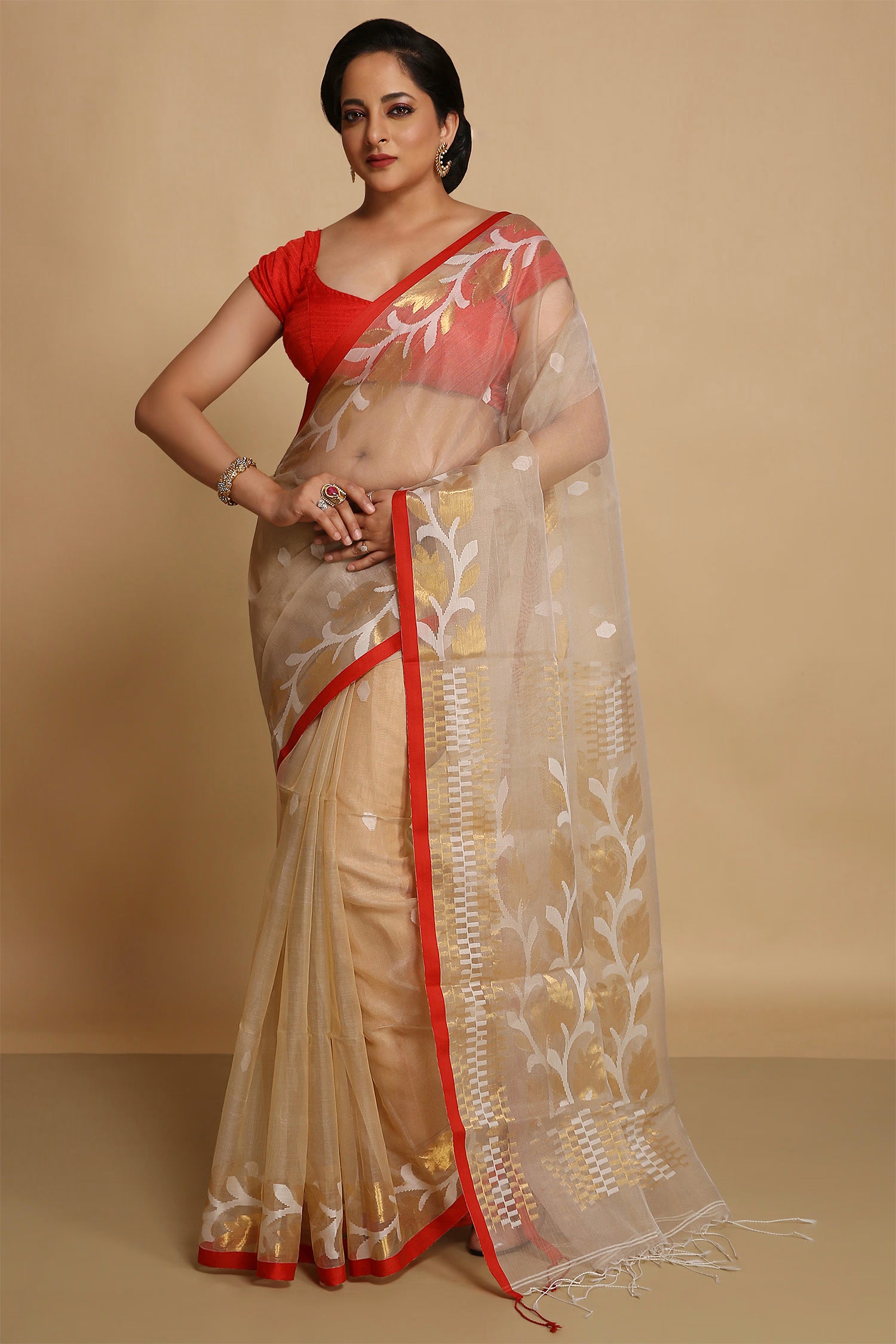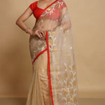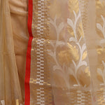 Beige Semi Resham Saree With Red Edge