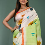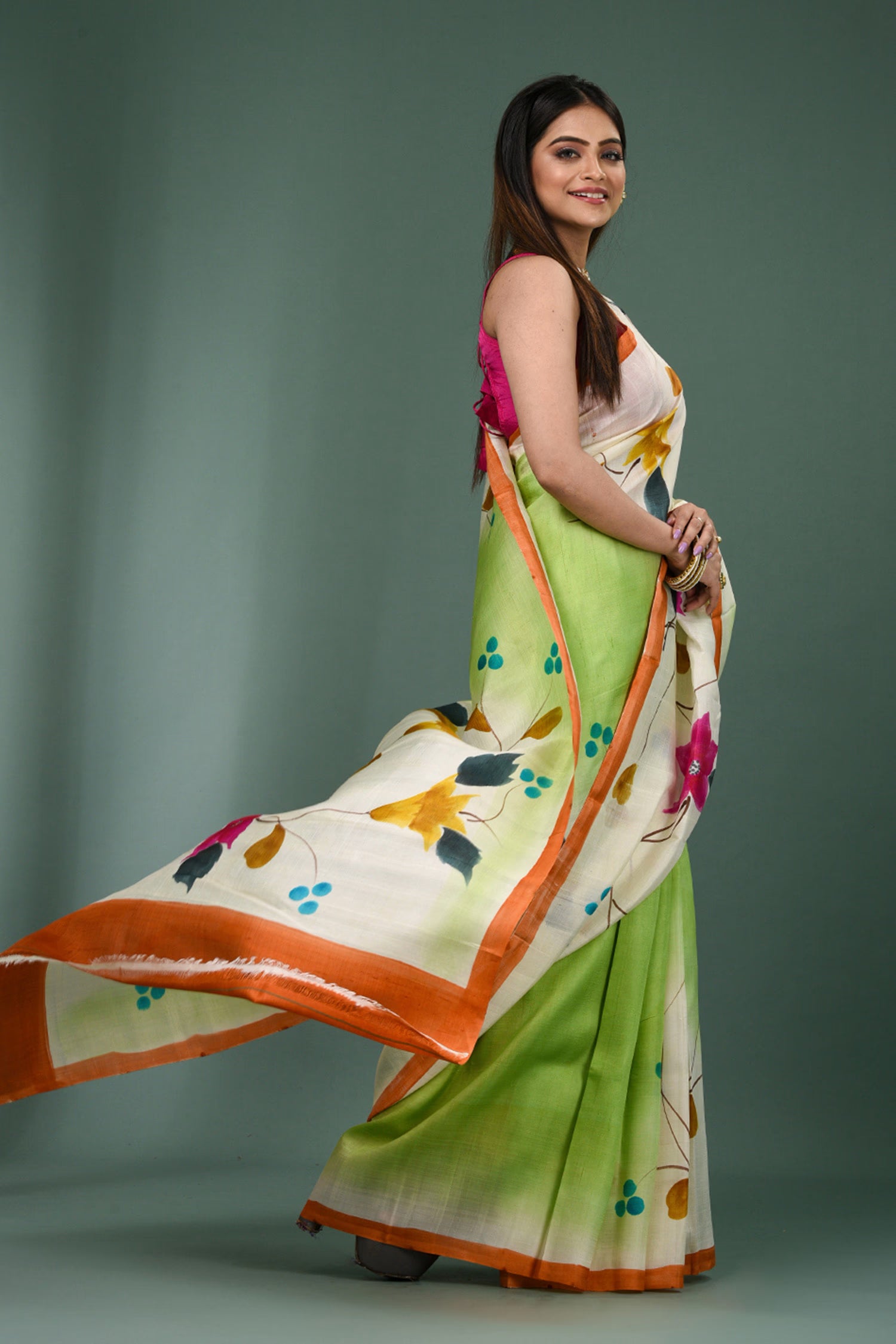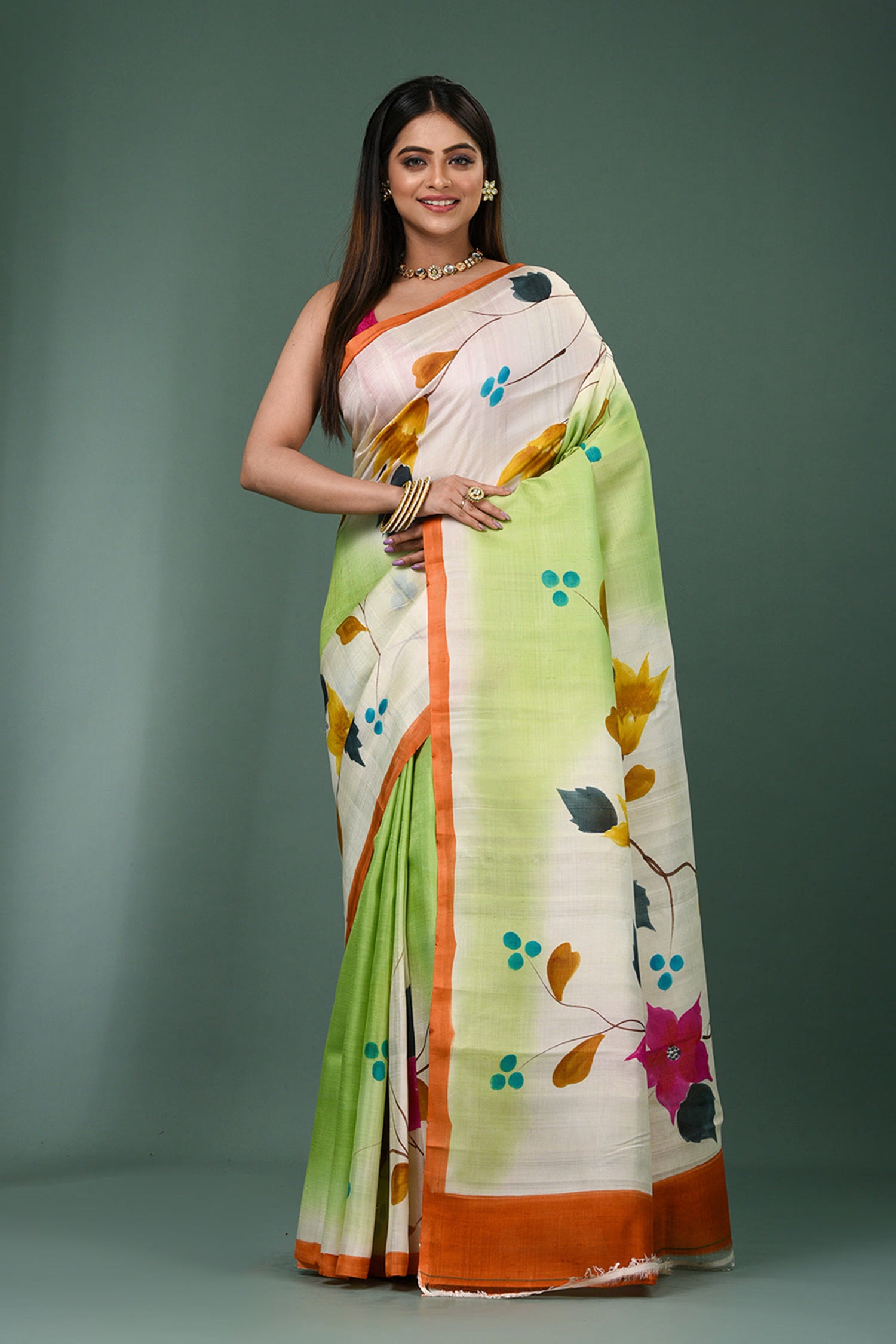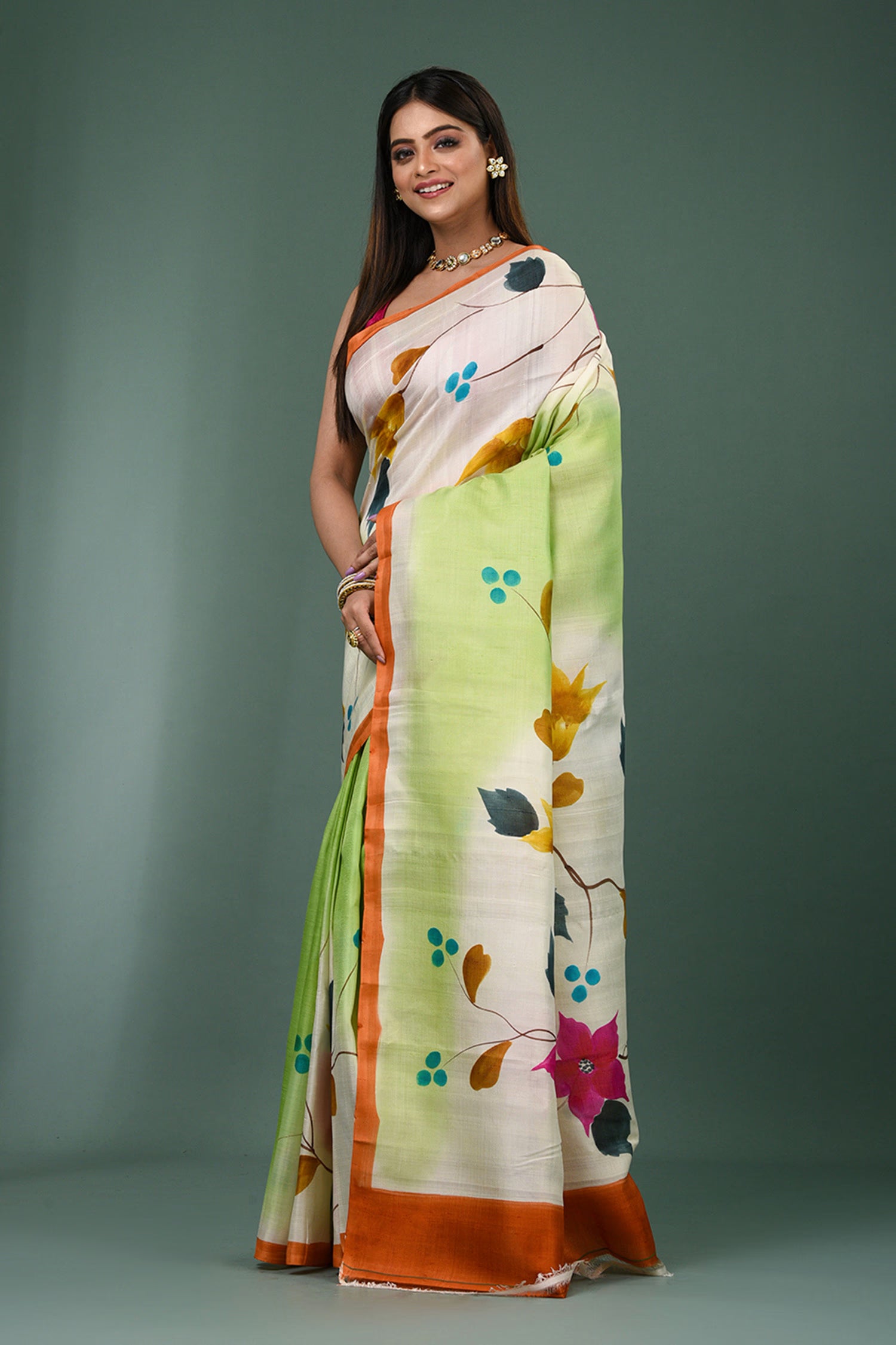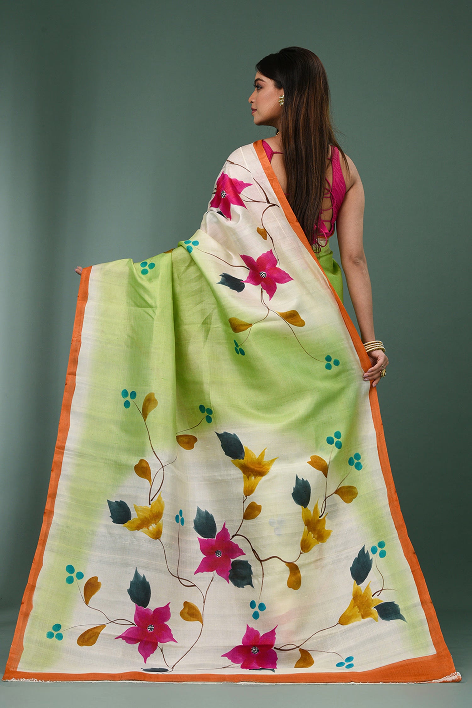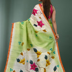This beautiful Dual shade pure silk saree features painted floral designs with contrast orange border and unstitched blouse, making it elegant and grace for any occasions