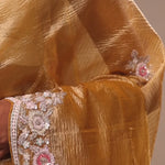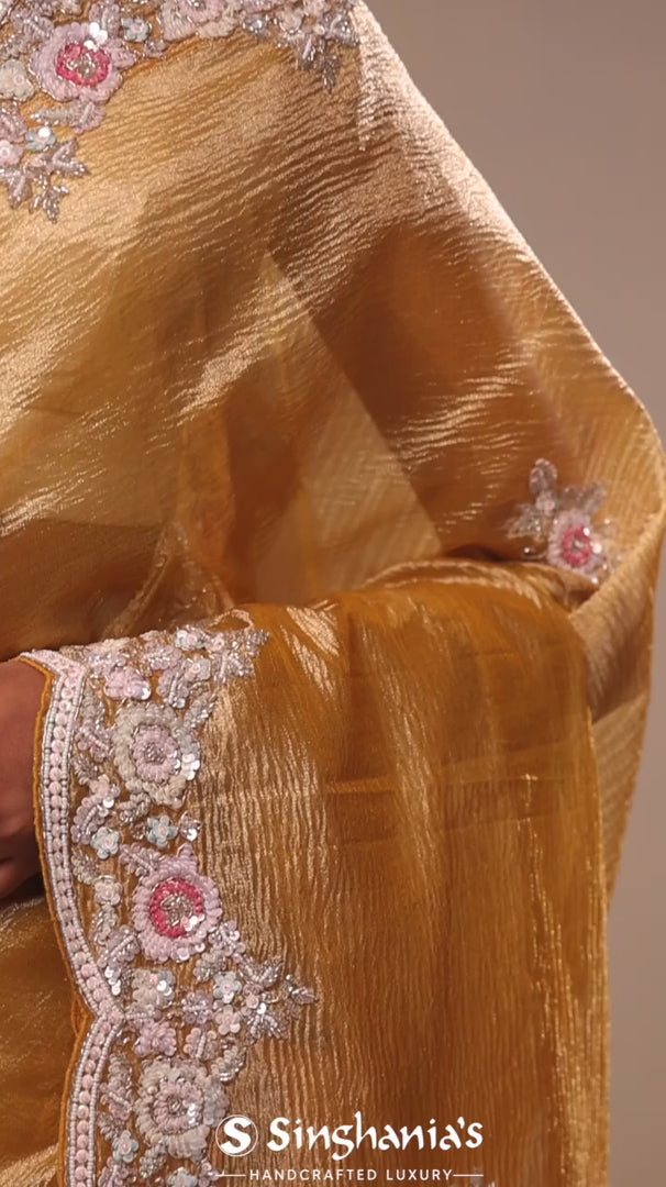 A luminous harvest gold saree with a tissue base, which features all over floral butti embroidery. Added with floral embroidered border and pallu, crafted with beads, sequins and glass beads. Suitable for festive wear, and wedding parties.