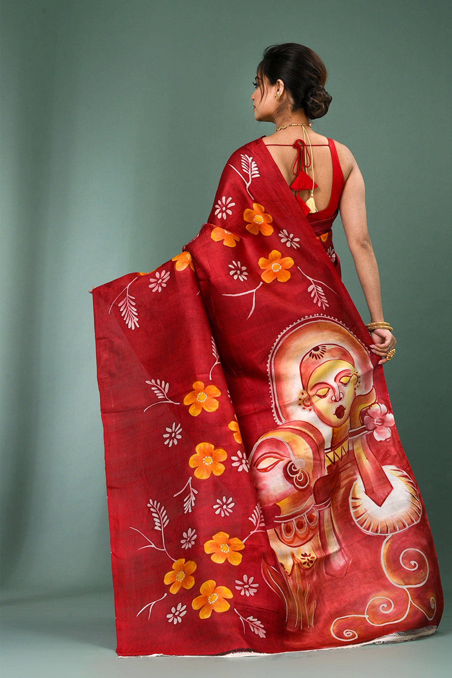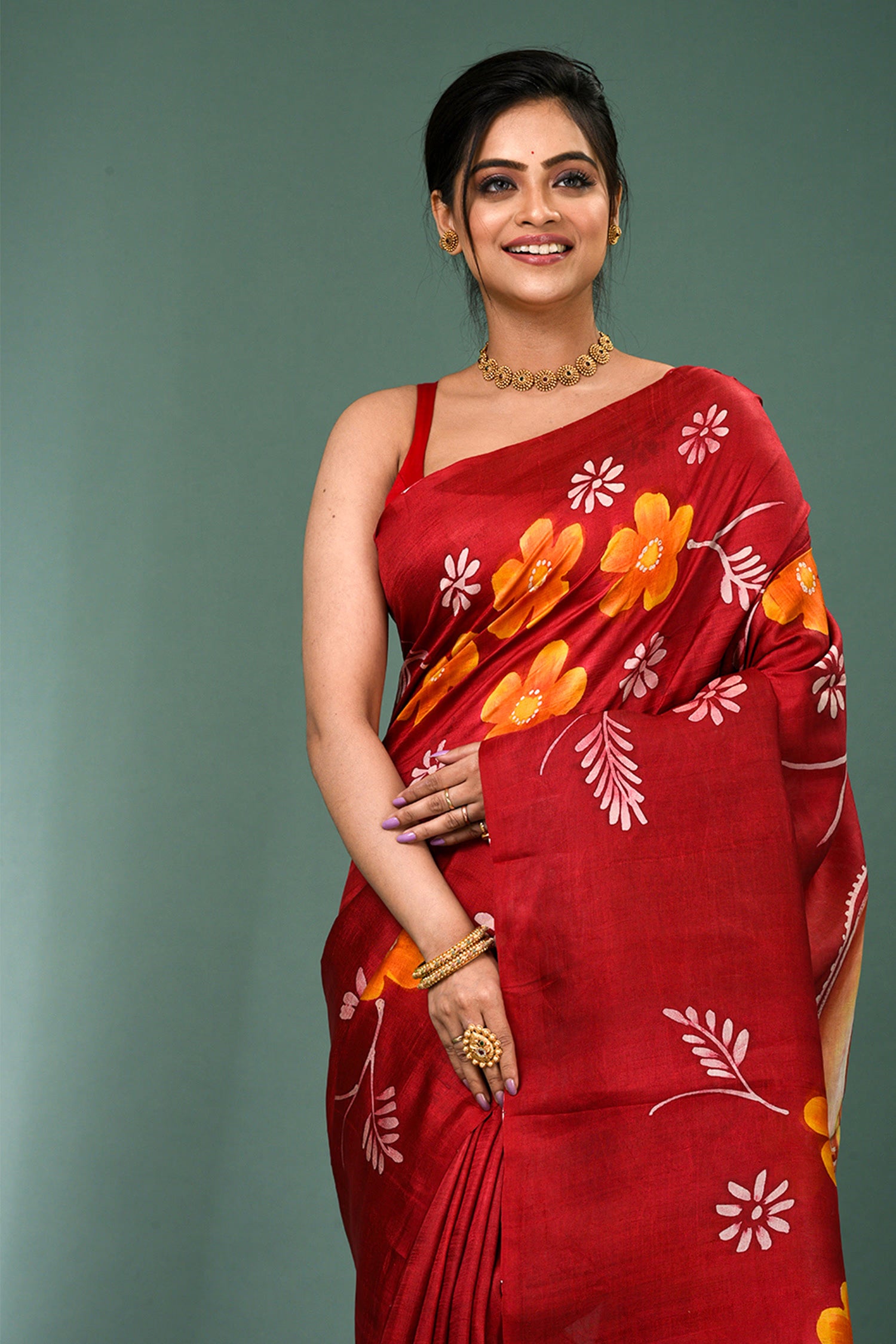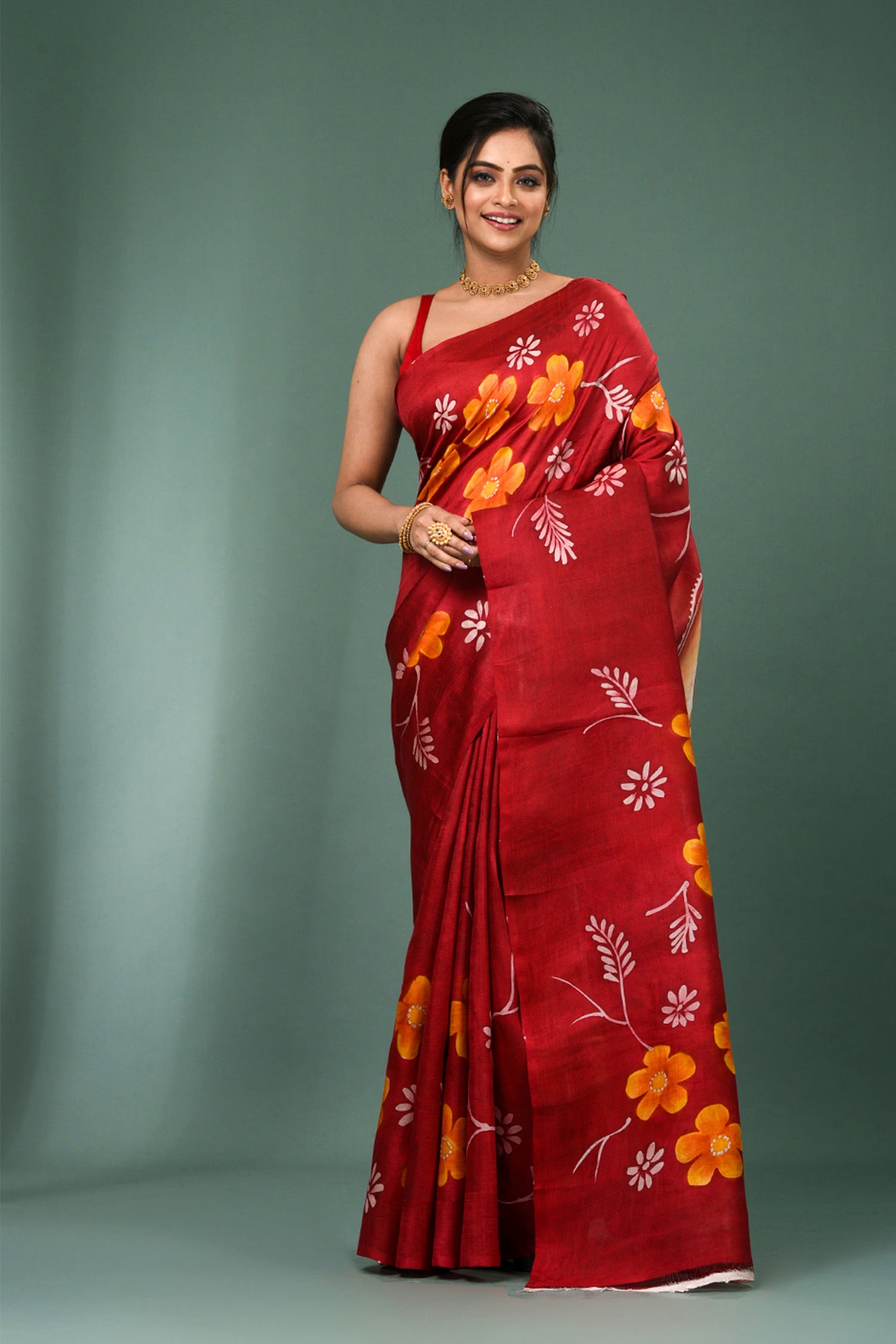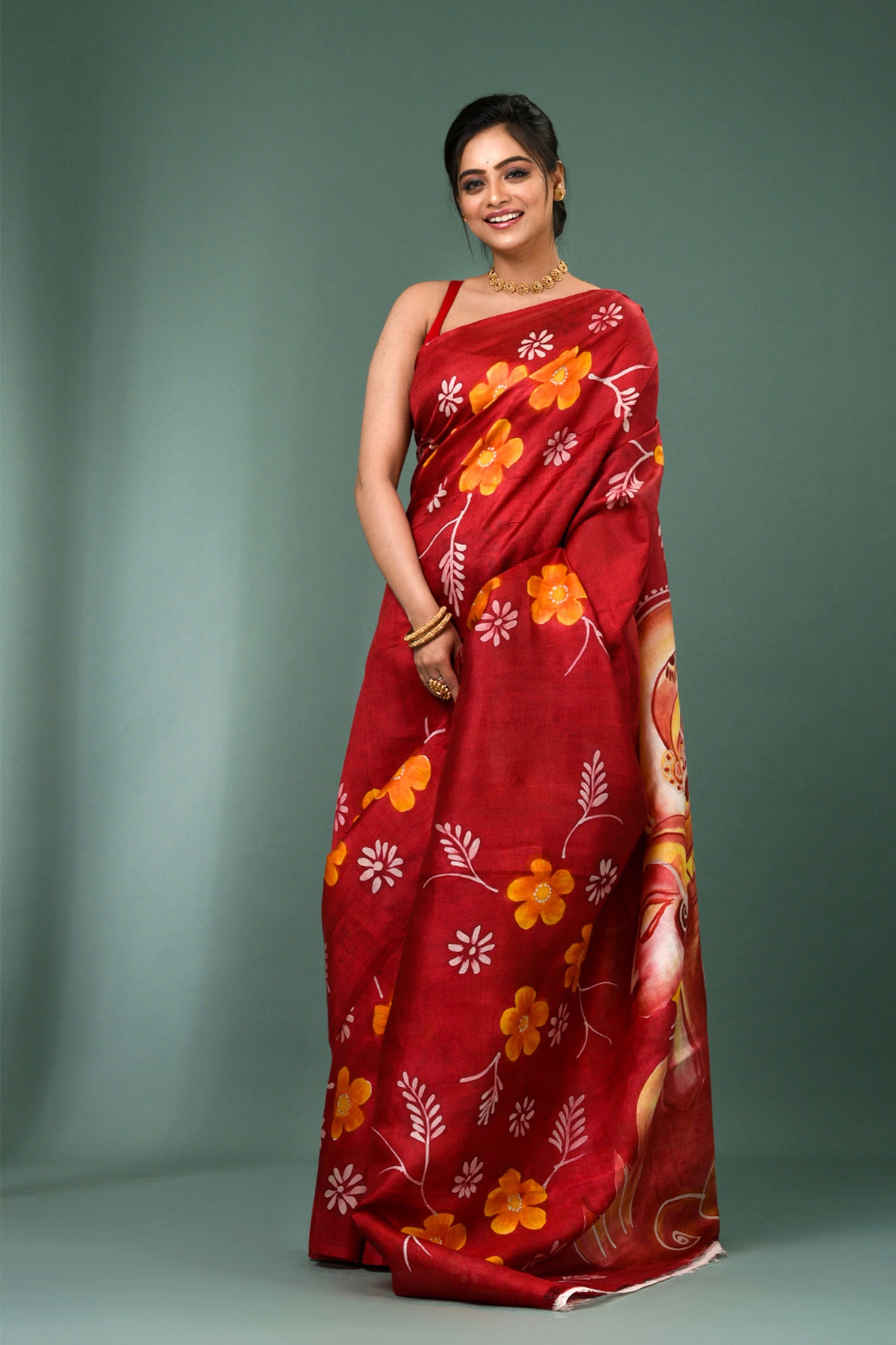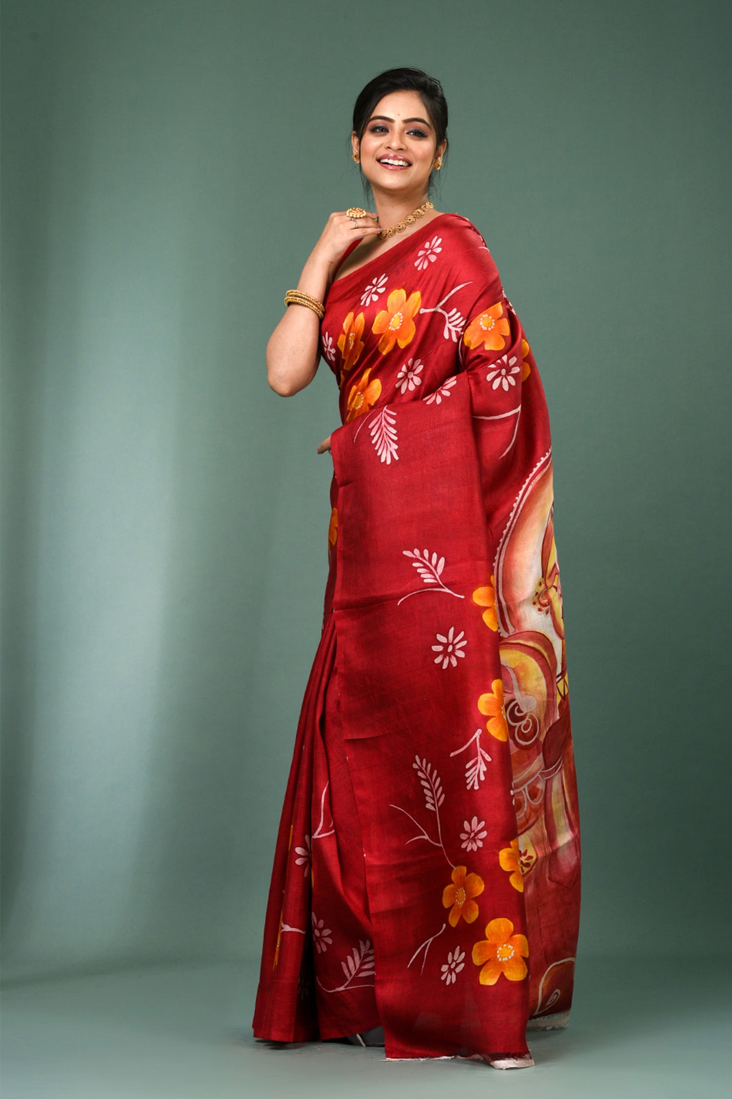 This beautiful maroon pure silk saree features vibrant orange floral painted design with no border,magnificent painting on pallu and unstitched blouse, making it elegant and grace for any occasions