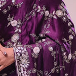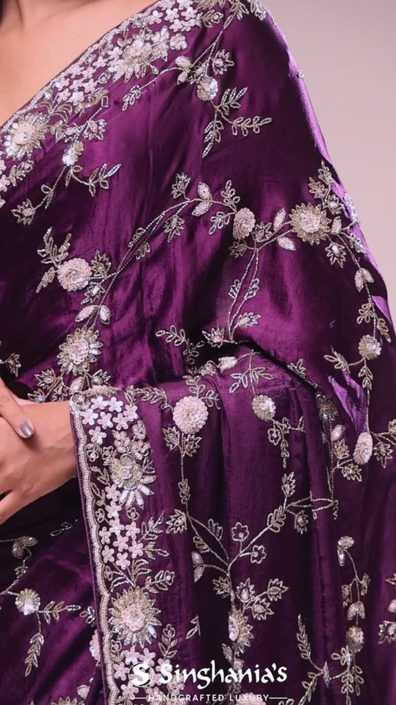 A deeply hued palatinate purple saree with a silk base, which features floral jaal embroidered pattern. Added with intricate floral embroidered border, crafted with sequins and glass beads. Suitable for festive wear, and wedding parties.