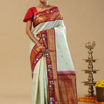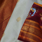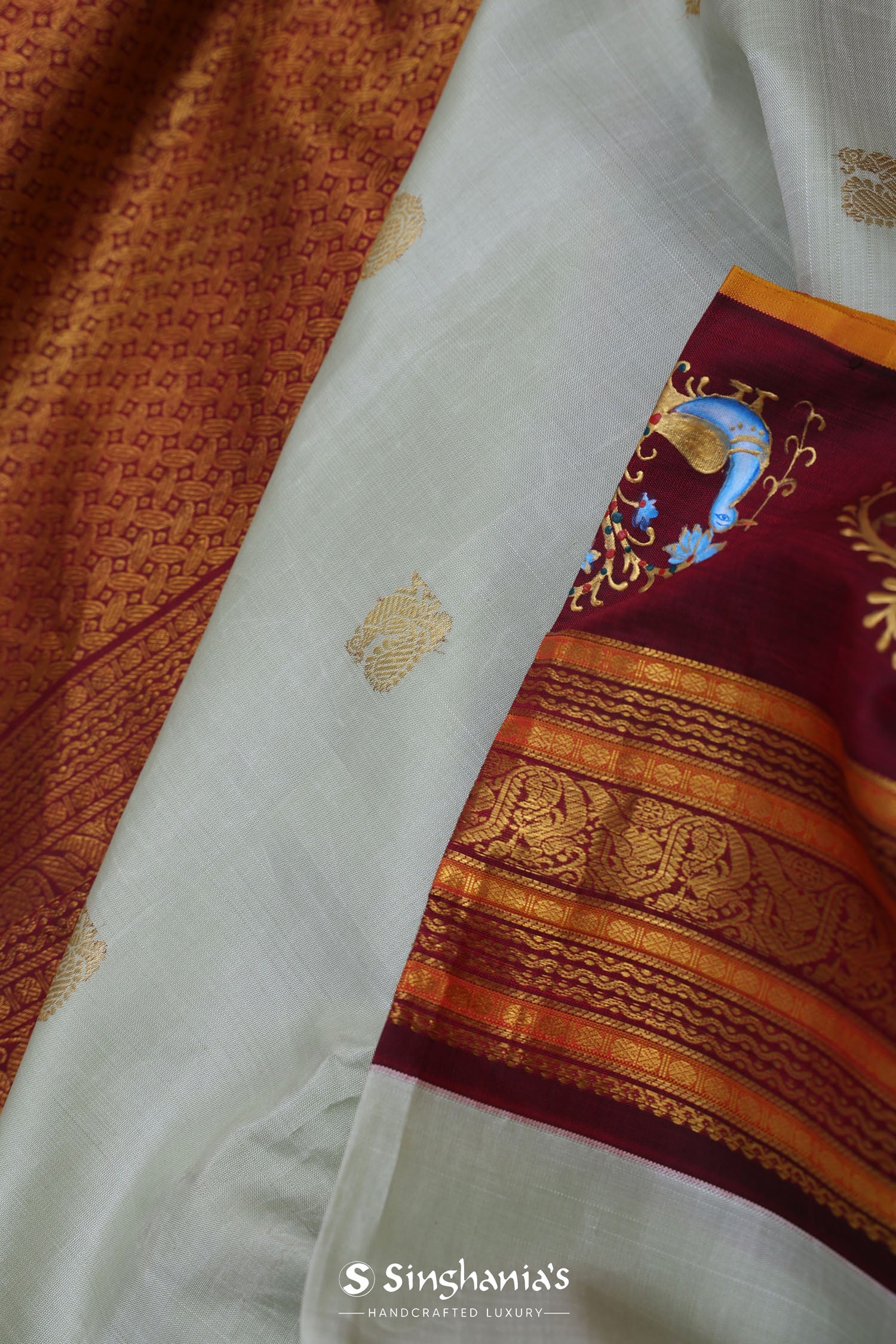 The peacock motifs woven with gold zari scattered on the body of pale green kanjivaram silk saree complemented with contrast maroon border , orange edge and unstitched blouse making it every moment festive.