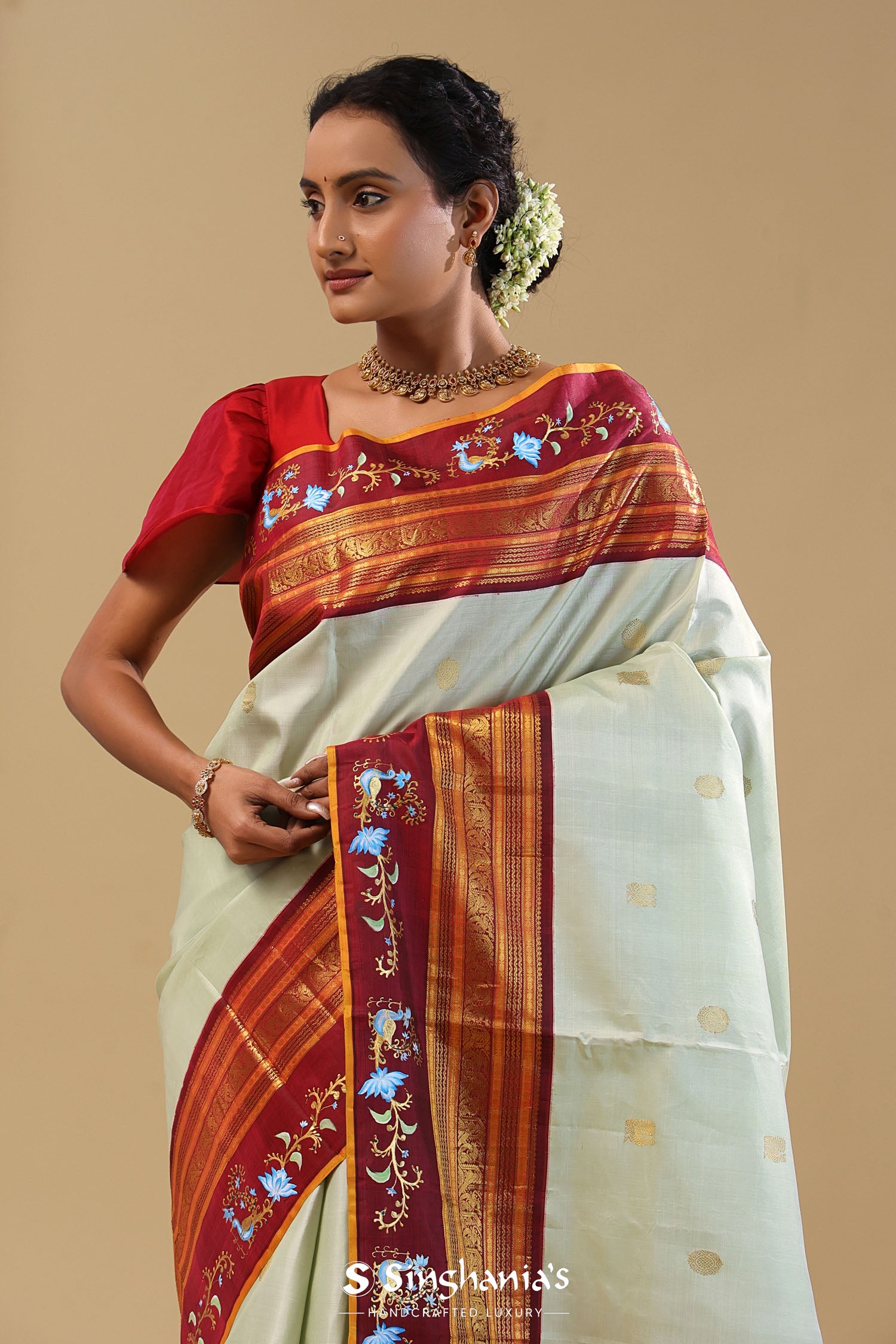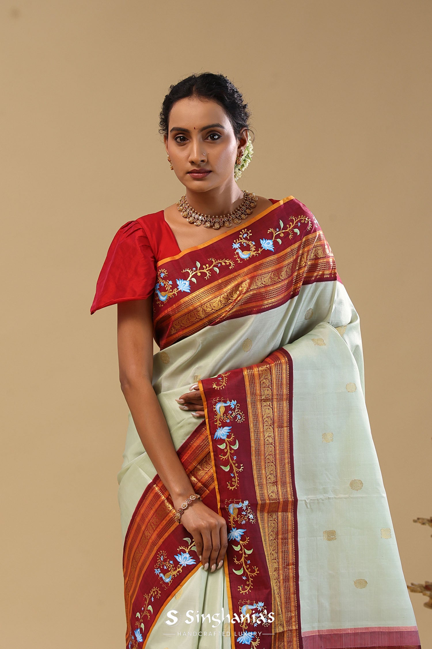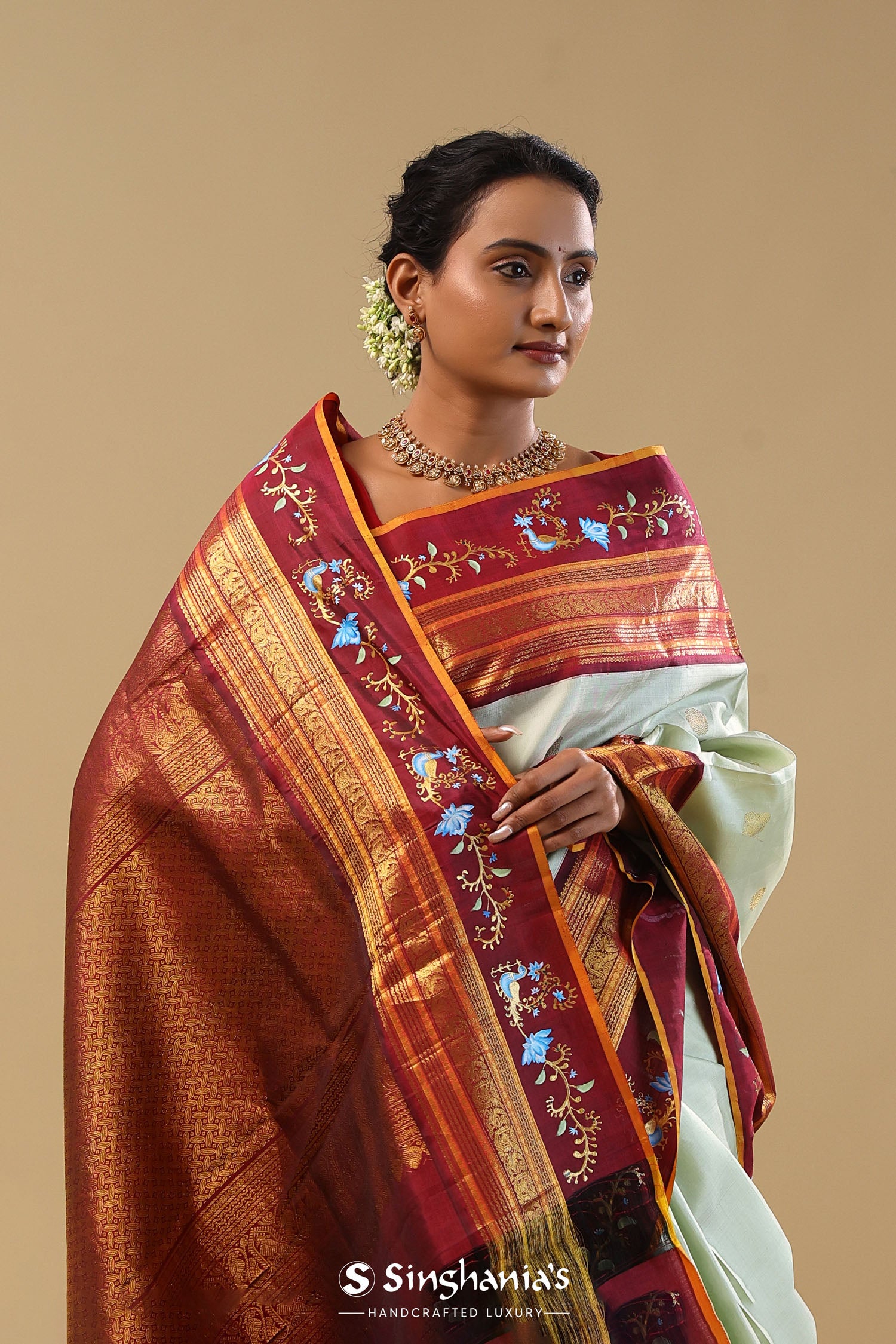 Pair with minimal jewellery and soft makeup to highlight the timeless elegance Singhania’s is known for.